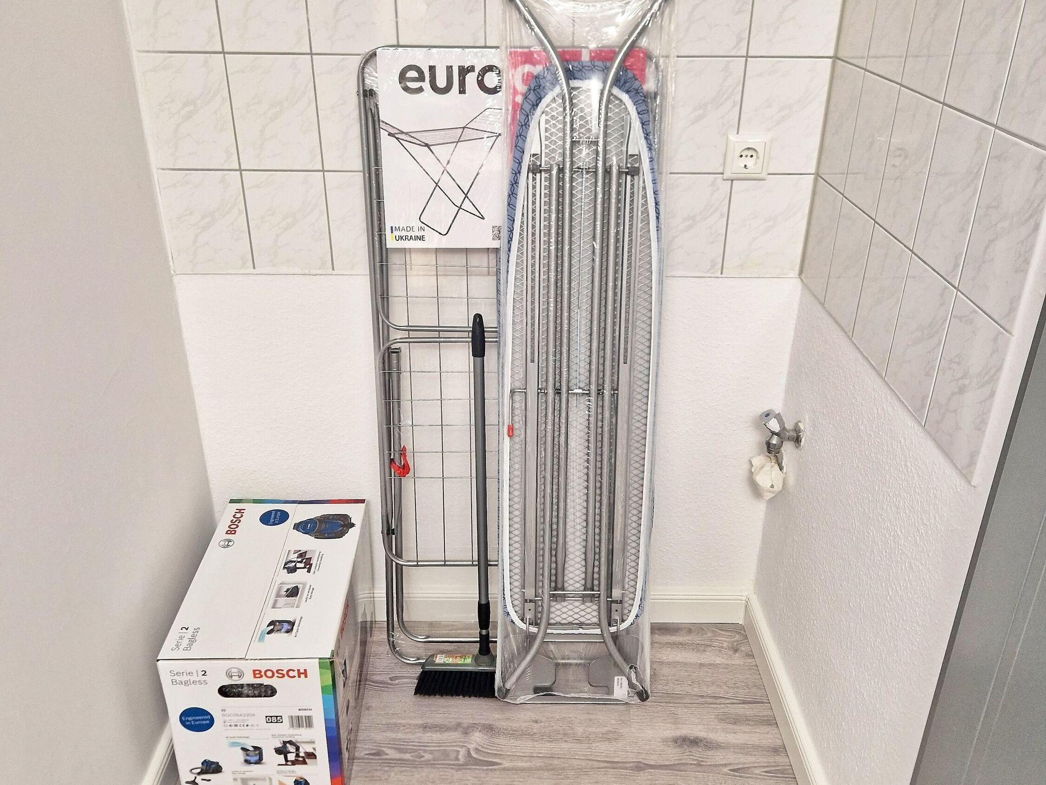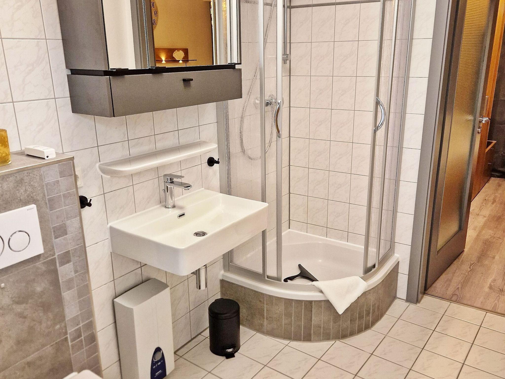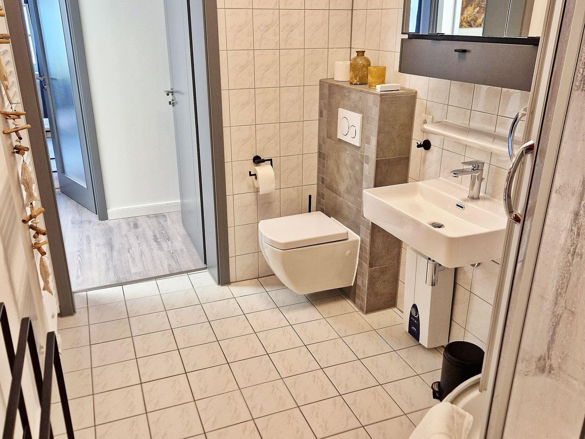 • Schickes Badezimmer mit Dusche, WC, Spiegel und ausreichend Ablagefläche für Ihre Beautyutensilien. Ein Wäscheständer sind vorhanden.