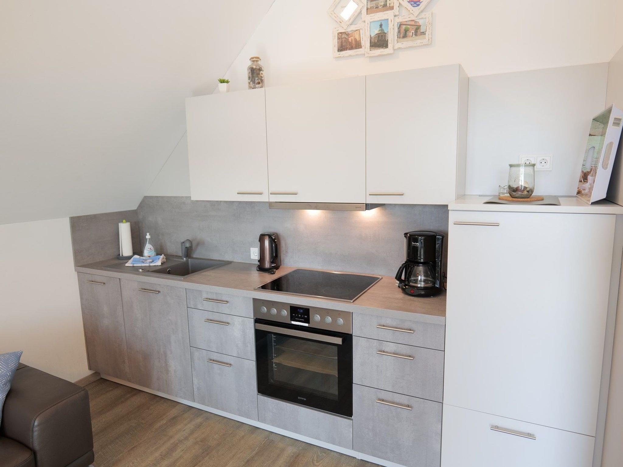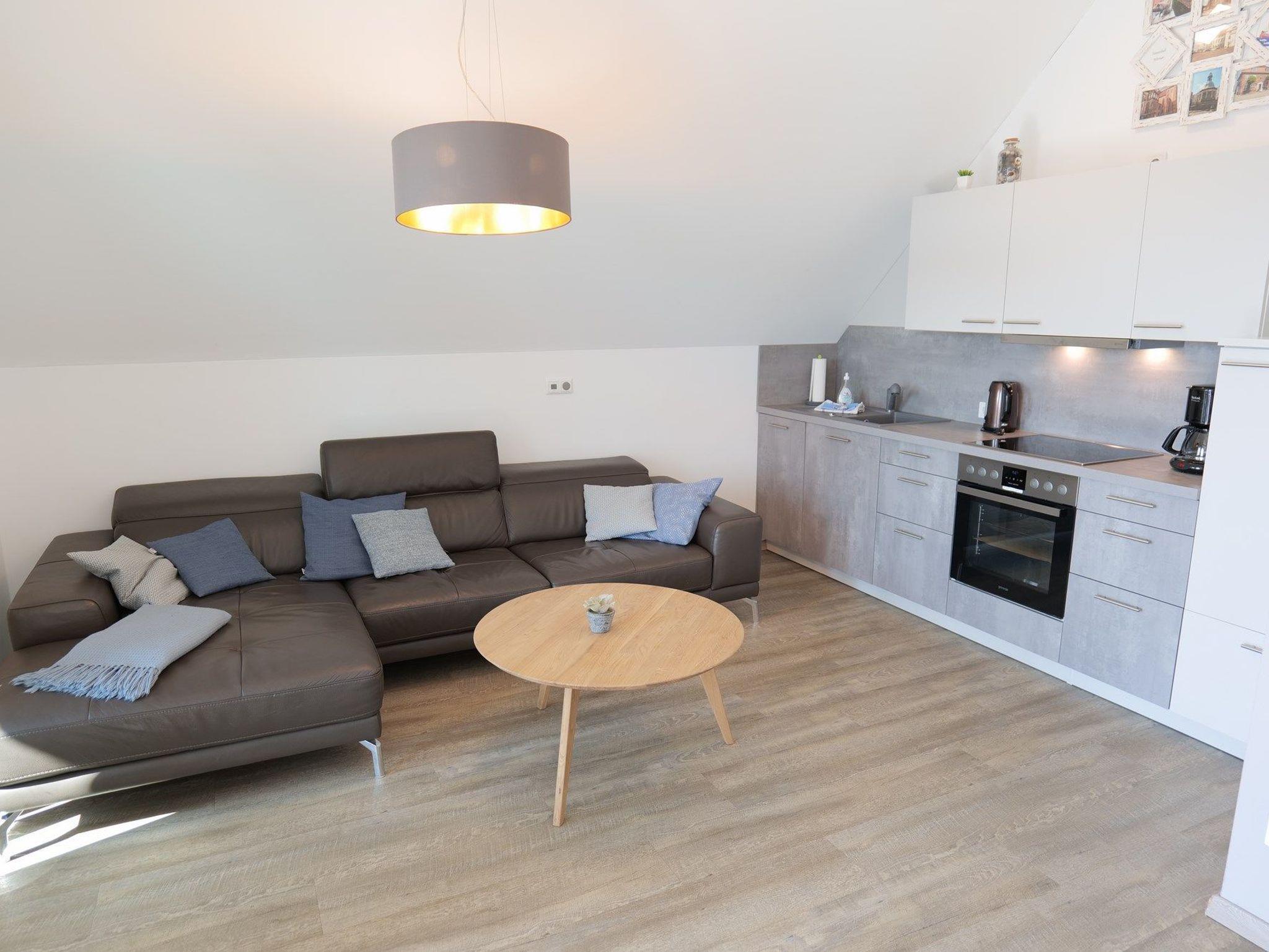 - Wohnzimmer mit Schlafsofa, Offene Küche vollausgestattet, Essbereich für 4 Personen