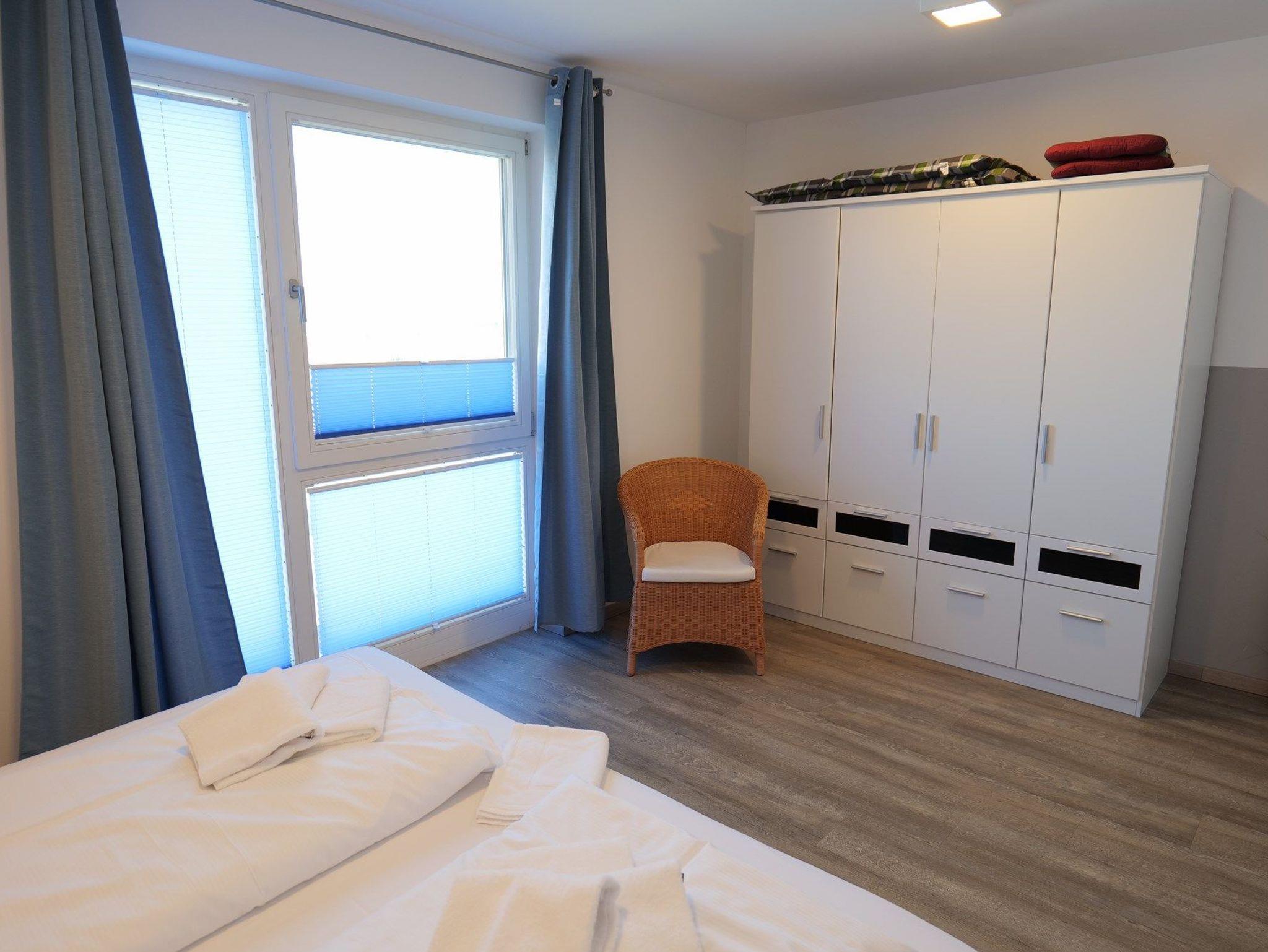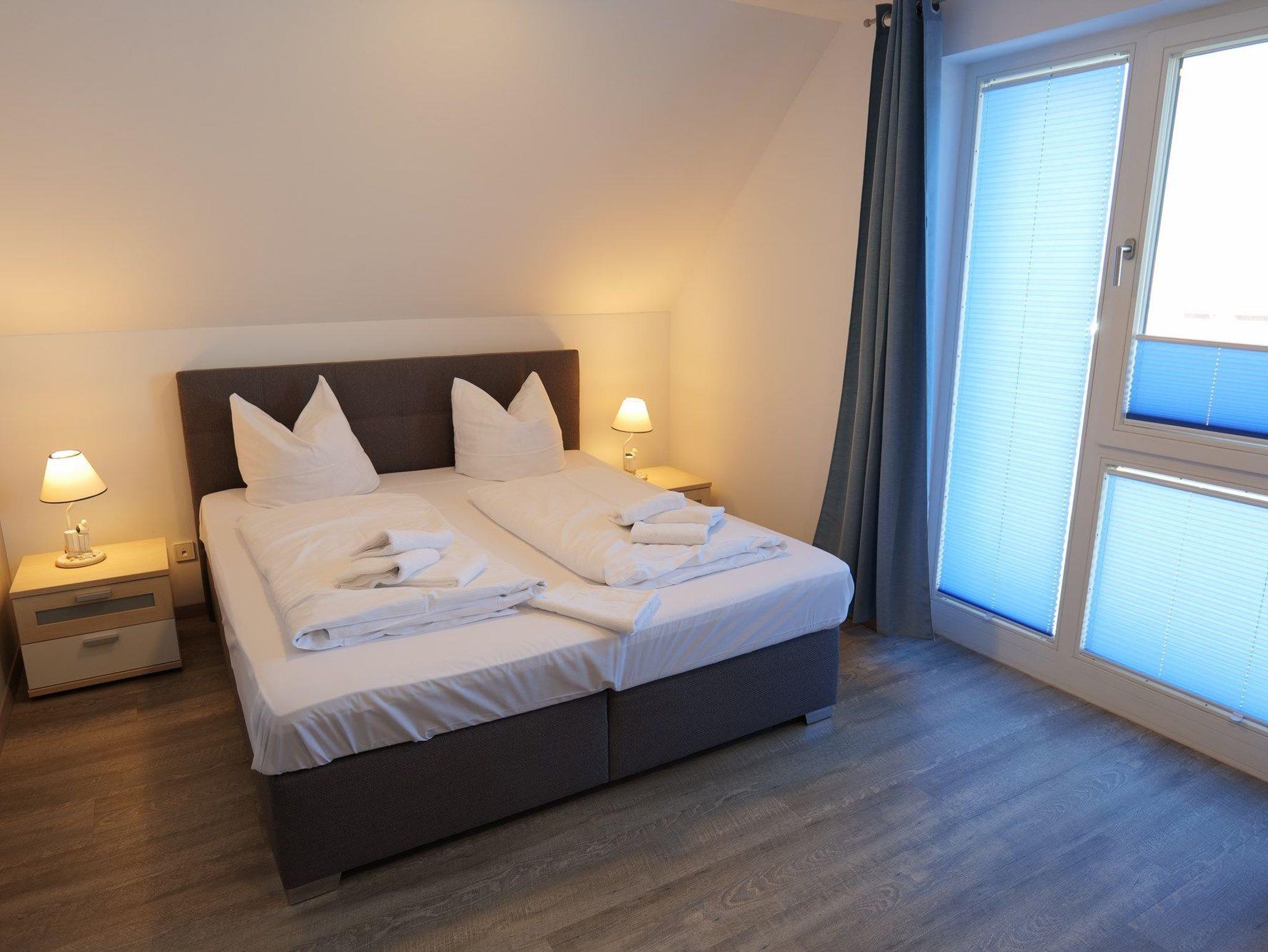 - 1. Schlafzimmer mit Boxspring-Doppelbett (1,80 x 2,00 Meter) und großen Kleiderschrank