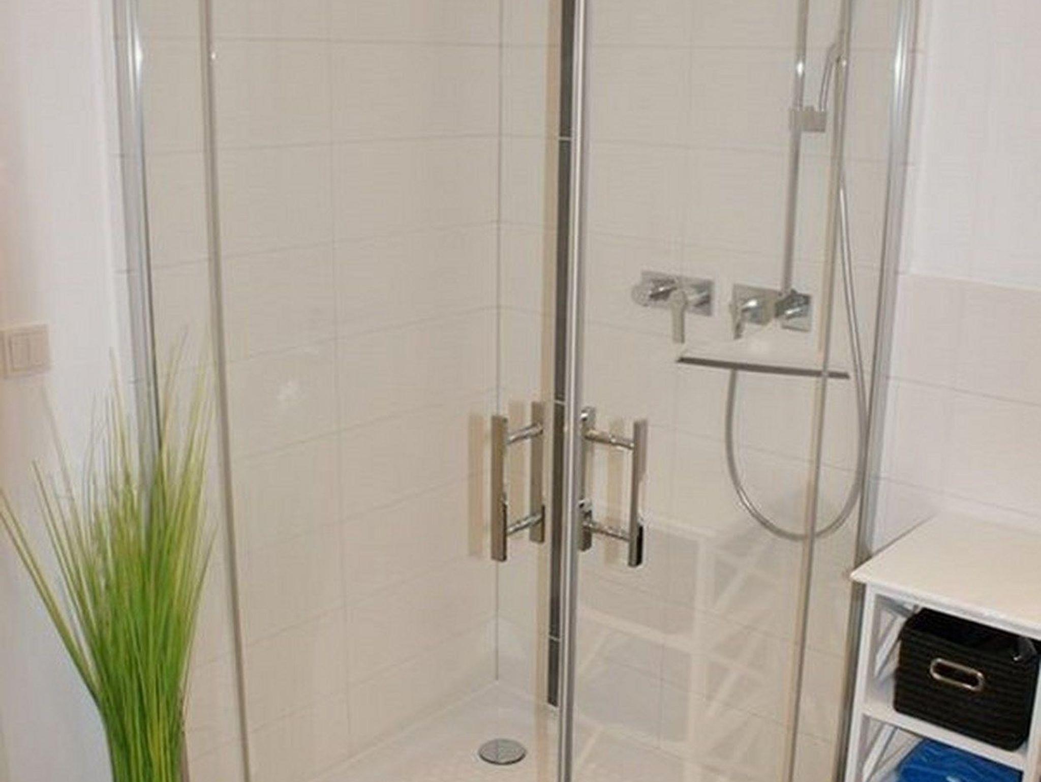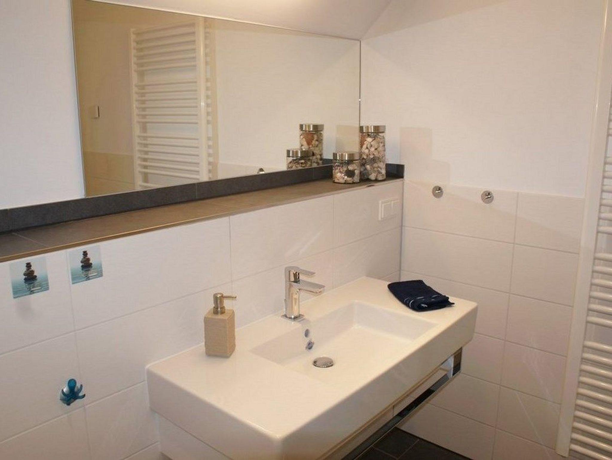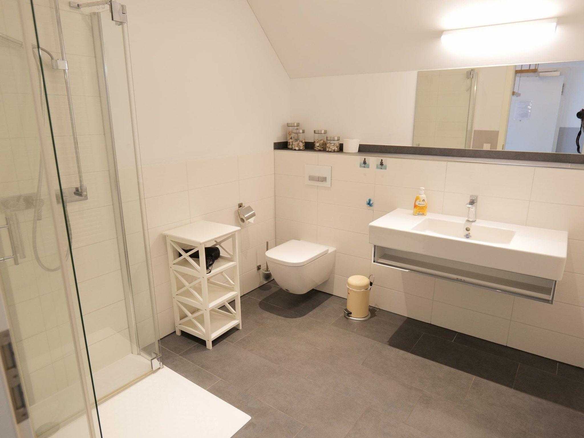 - Badezimmer mit Dusche, WC, großen Spiegelschrank