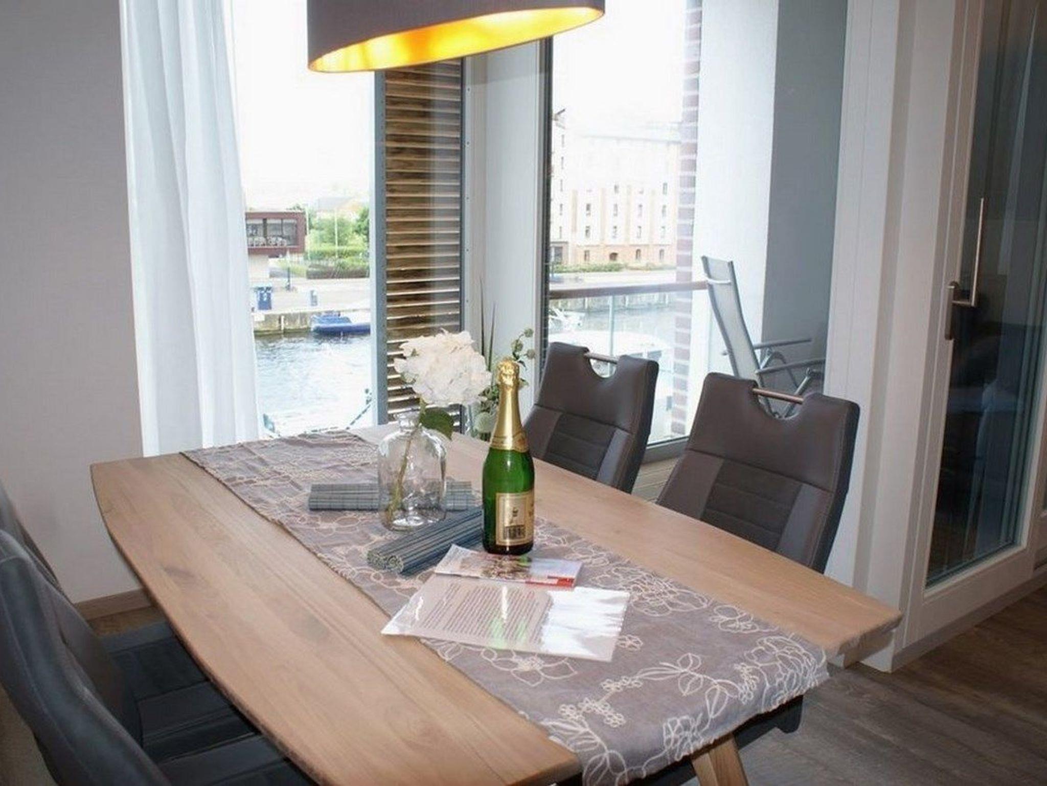 Das helle lichtdurchflutete Wohnzimmer mit großer Couch, moderner offener Küche, gemütlicher Essecke und Zugang zum Hafenblick-Balkon lädt zum Wohlfühlen ein. Im stylischen Badezimmer stehen Ihnen eine Dusche, WC und ein Spiegelschrank mit großer Ablage zur Verfügung. Genießen Ihr Frühstück auf dem Balkon mit Blick auf die Hafenpromenade und die Wismarer Bucht.