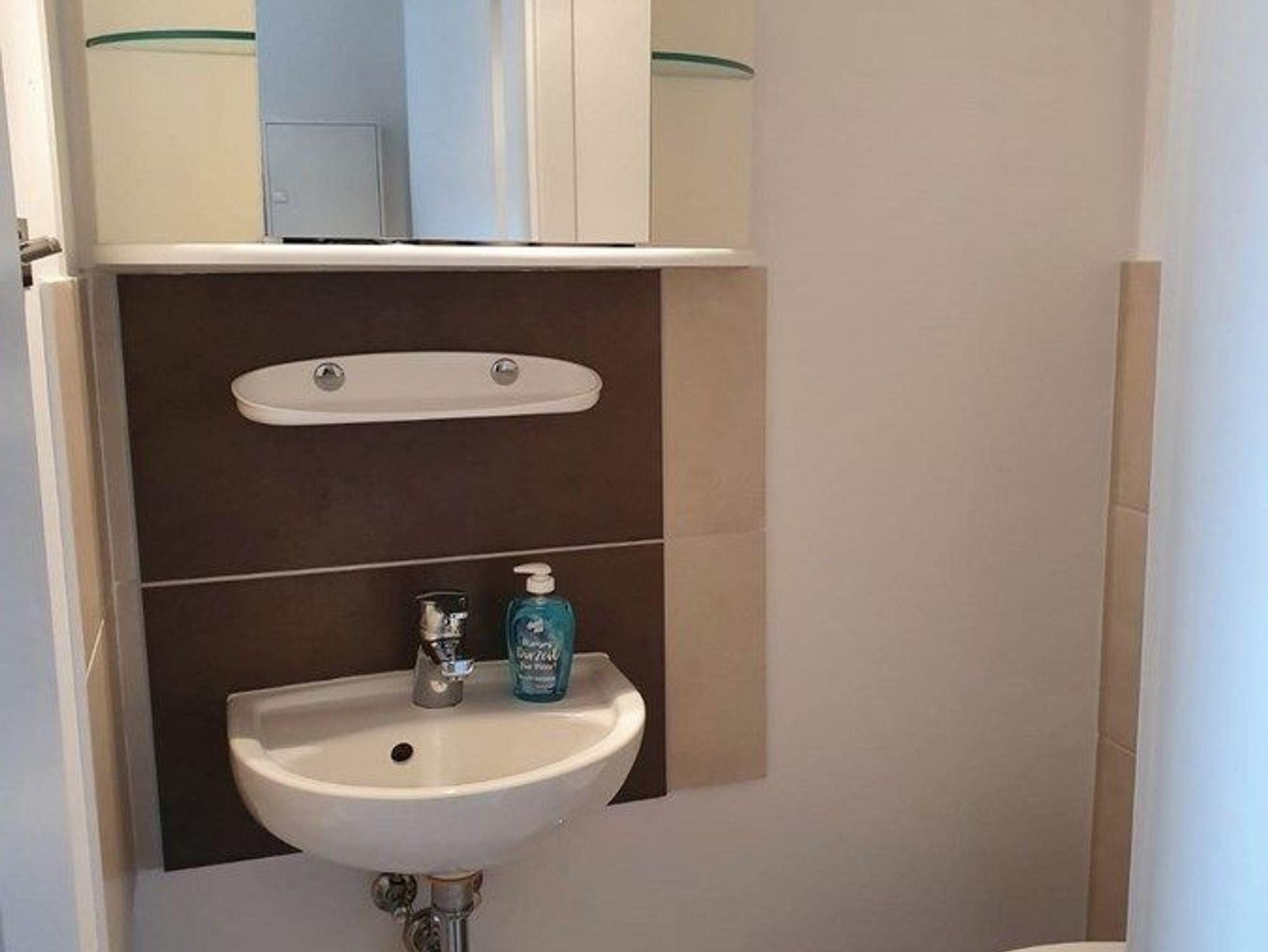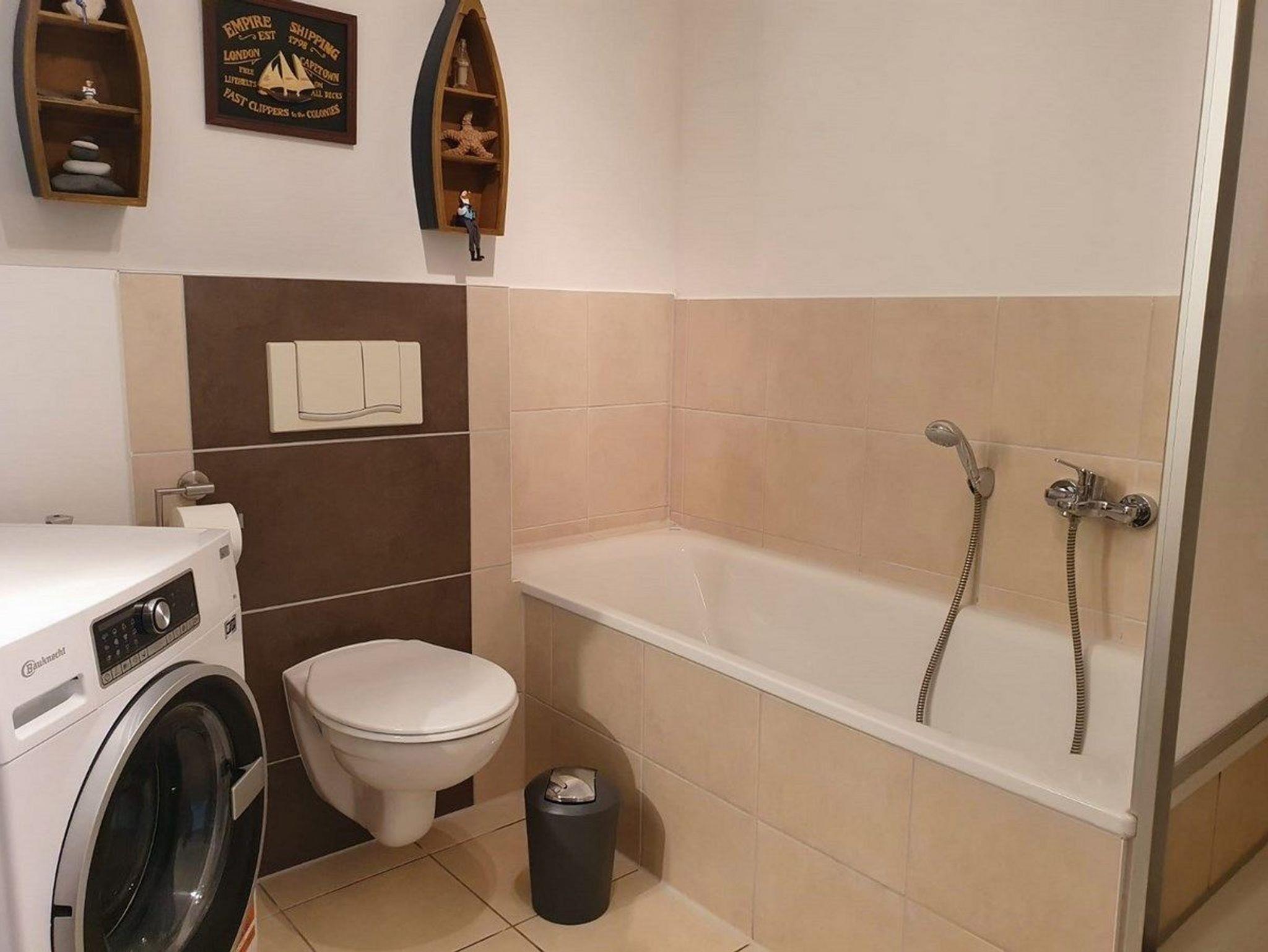 - Vollbad mit Badewanne, Dusche, WC, Spiegel und Ablage