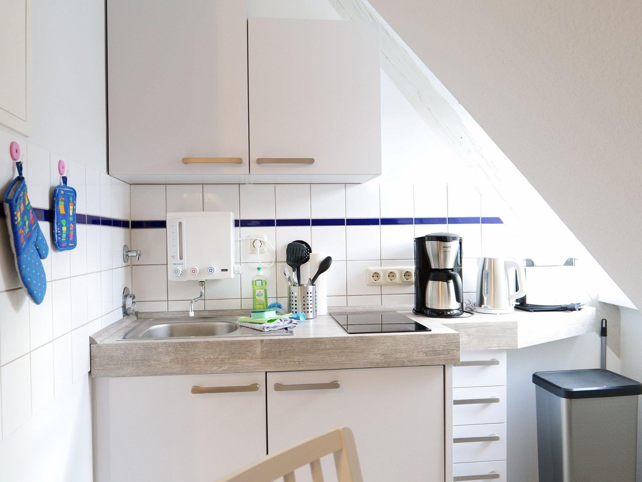 Küchenzeile mit 2 Platten-Ceranfeld, Kühlschrank, Toaster, Kaffeemaschine, Wasserkocher, Geschirr, Töpfe, Besteck usw.