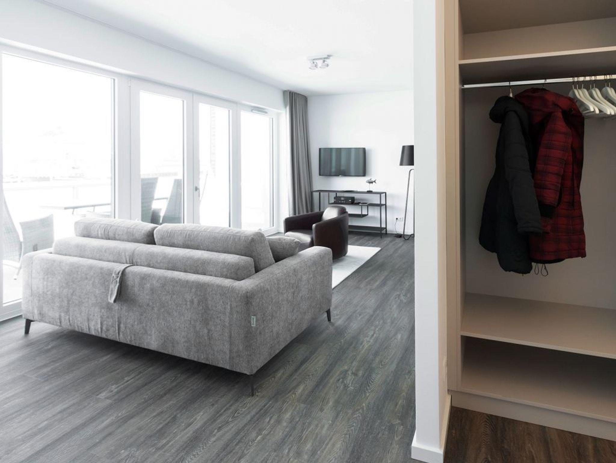 Das komfortable Ferienappartement Hafenspitze 15 Dreimaster liegt im 1. Obergeschoss und ist ein modern ausgestattetes 2-Zimmer-Appartement mit einer Wohnfläche von 64 qm sowie einem sonnigen Balkon. Für maximal 4 Personen ist die Wohneinheit ideal geeignet. Der helle Wohn-Essbereich empfängt Sie mit Wohlfühlatmosphäre. Das vorhandene Sofa bietet zwei zusätzliche Schlafgelegenheiten. Zur technischen Wohnausstattung gehören Internetradio sowie Internetfähiges Fernsehen mit Hotelmodus. Kostenfrei nutzen Sie den Internetzugang über WLAN. Die Beschattung der Wohnräume erfolgt über elektrische Wärmeschutzrollos. Ihre Urlaubsmahlzeiten können Sie bequem in einer integrierten Wohnküche zubereiten. Hier befinden sich Ceranfeldherd, Kaffeemaschine, Wasserkocher, Geschirrspüler usw. Zudem befindet sich ein separates Schlafzimmer mit Doppelbett in diesem Appartement und auch ein Komfort Duschbad ist selbstverständlich vorhanden.