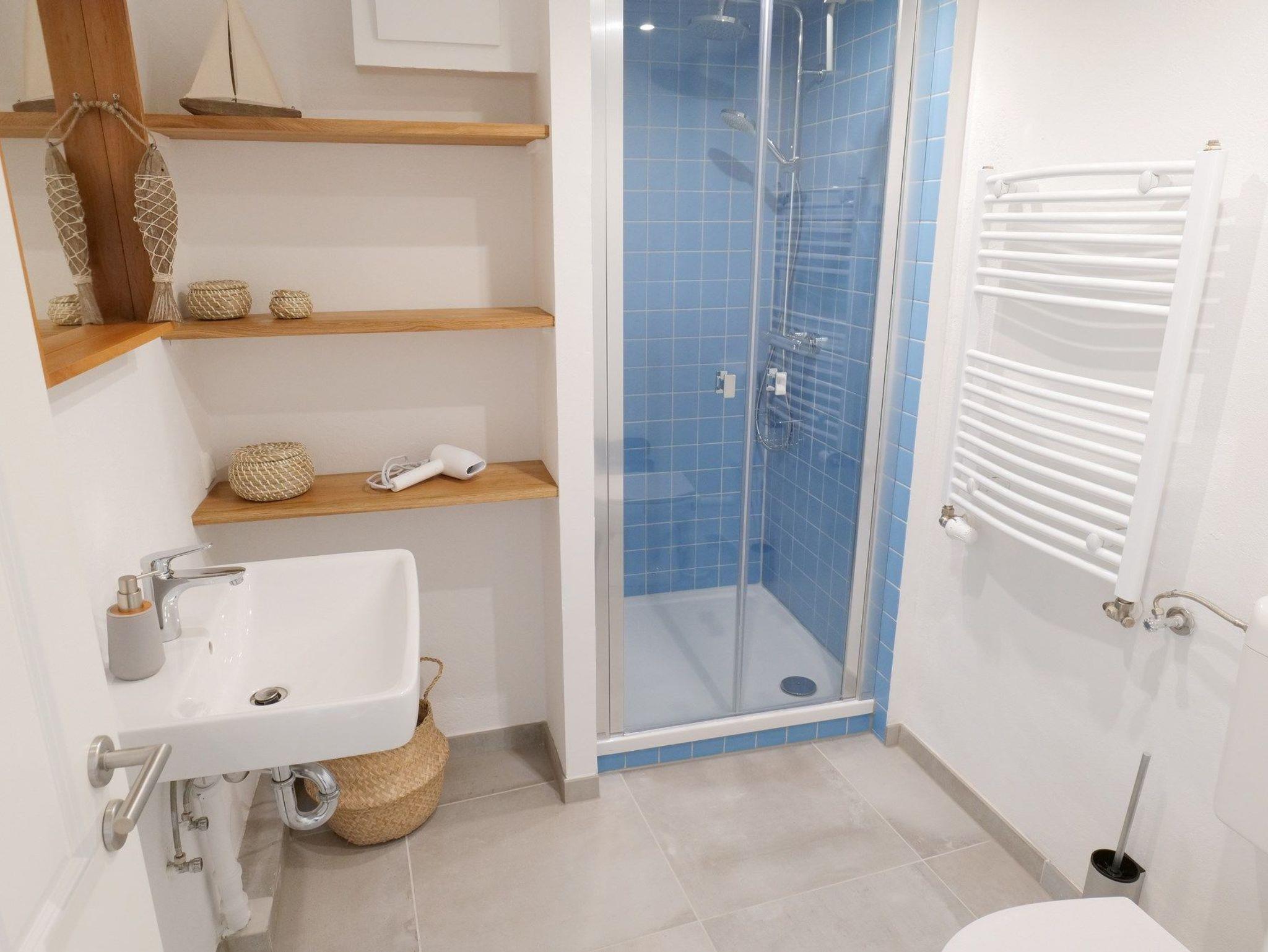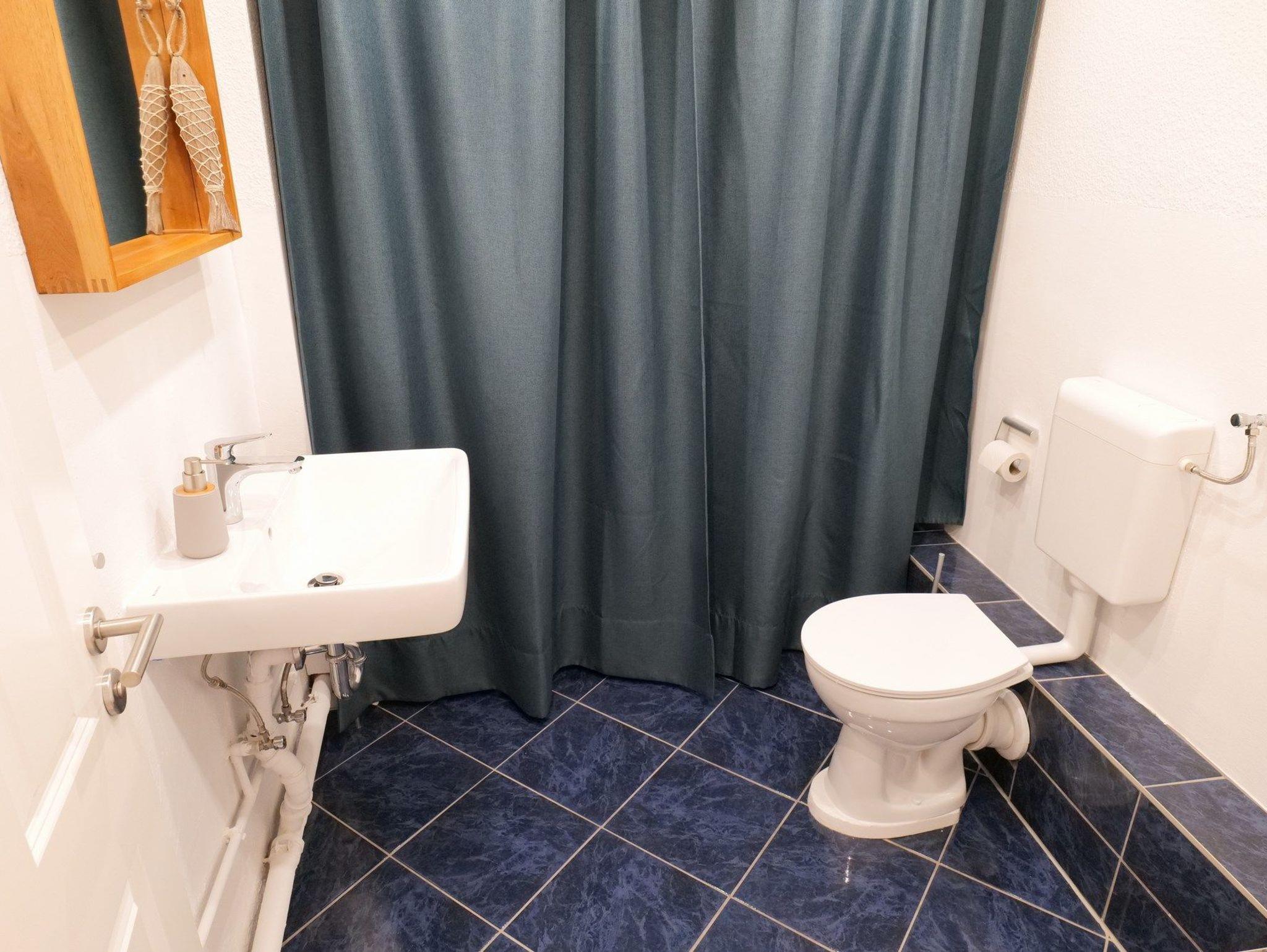 - Bad mit Dusche, Toilette, Waschbecken, Handtuchheizkörper