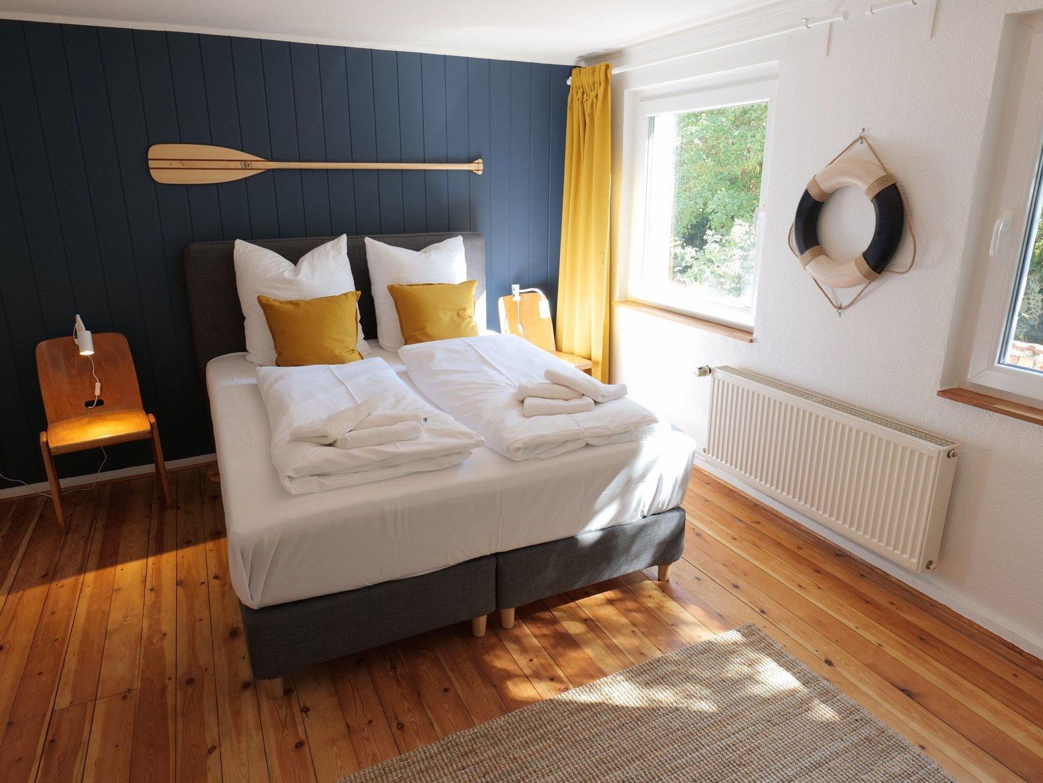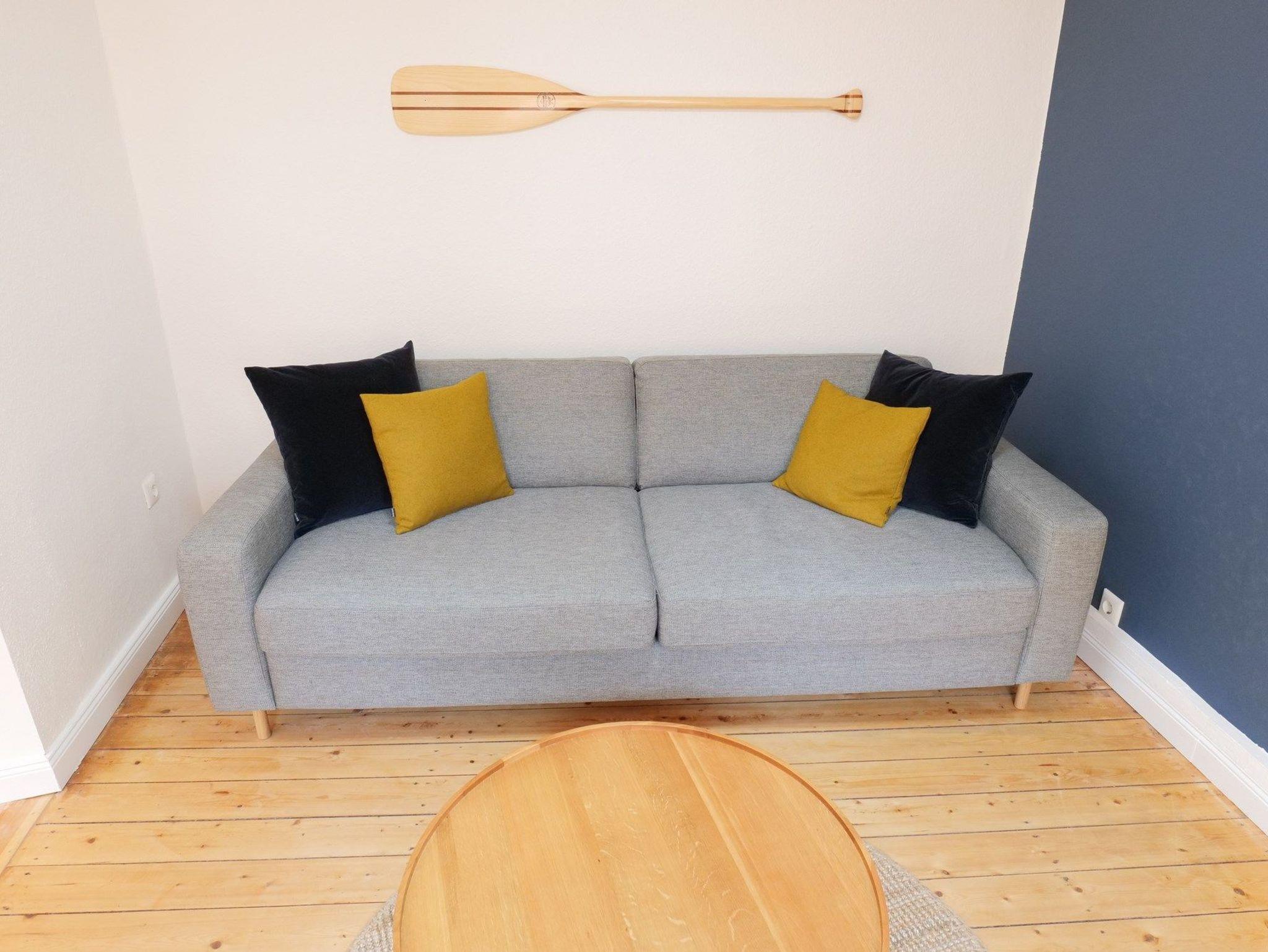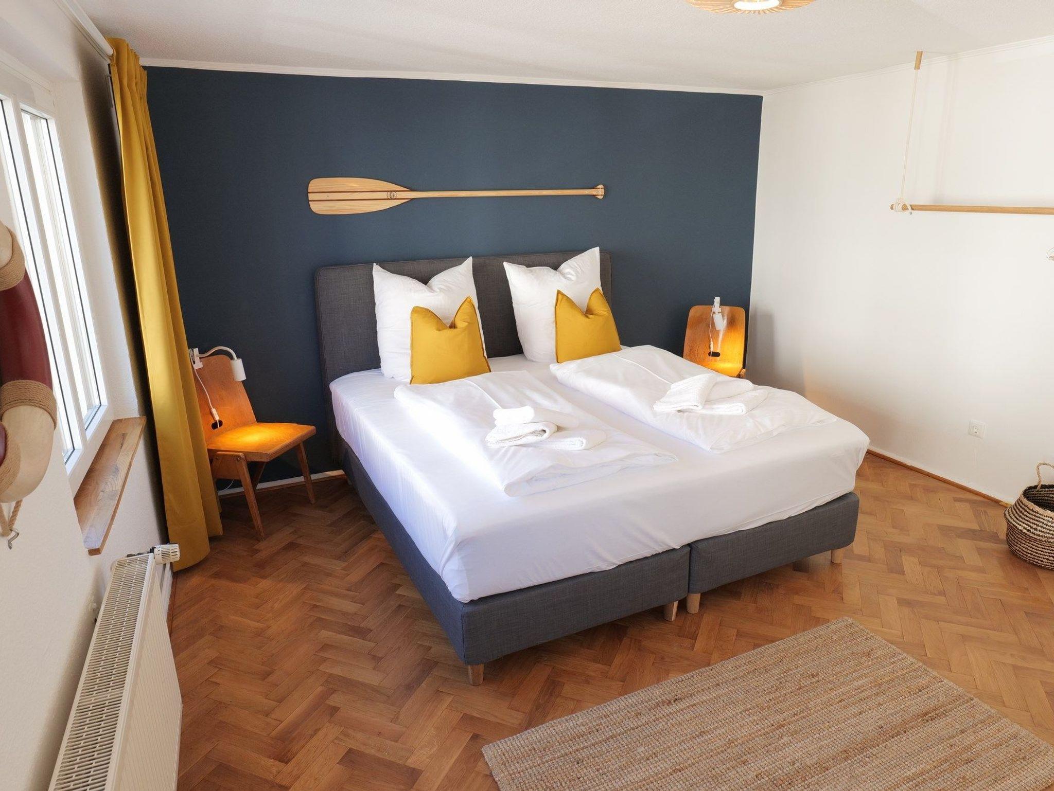 Bei der Sanierung und Einrichtung wurde bewusst auf den eigenen Charakter und die Geschichte des Haues Rücksicht genommen. Neben den komfortablen Boxspringbetten im Obergeschoss steht Ihnen im Wohnraum zusätzlich ein hochwertiges Schlafsofa zur Verfügung.
