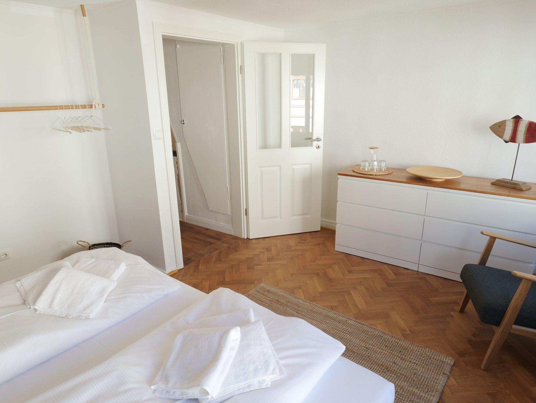 - 1. Schlafzimmer (komfortables Doppel-/Boxspringbett 1,80 x 2,00m), Kommode, Aufhängmöglichkeit für Hemden