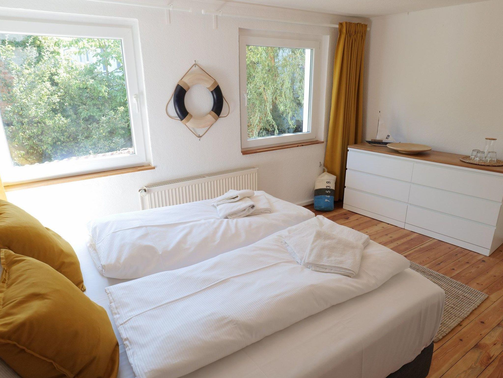 - 1. Schlafzimmer (komfortables Doppel-/Boxspringbett 1,60 x 2,00m), Kommode, Aufhängmöglichkeit für Hemden