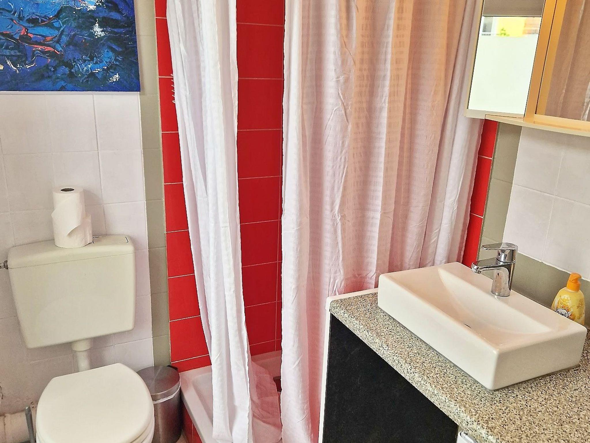 - Bad mit Dusche, WC, Waschbecken und Fenster