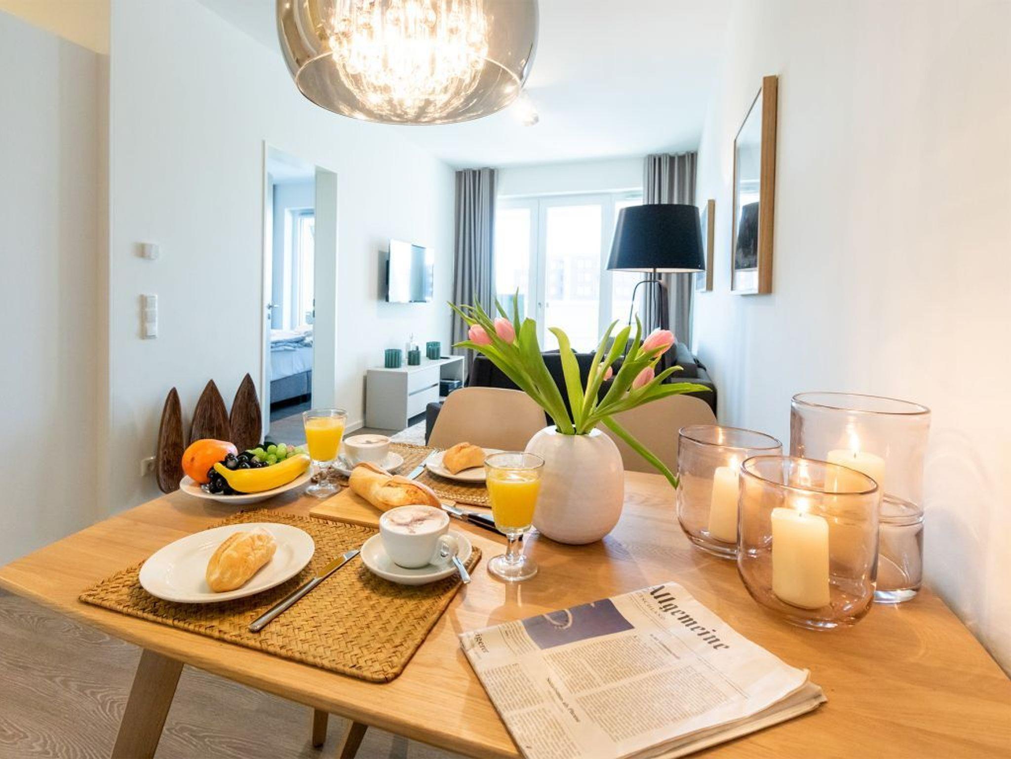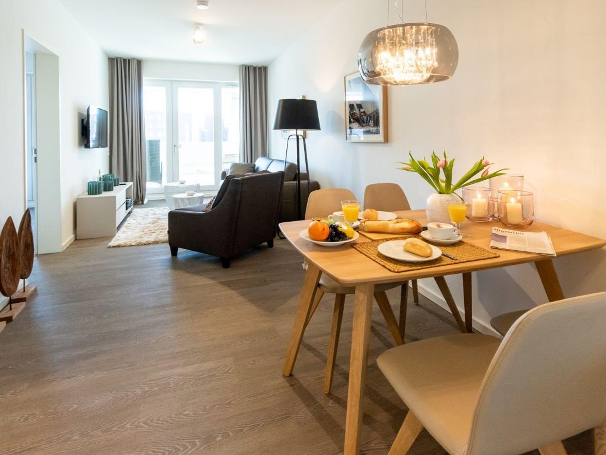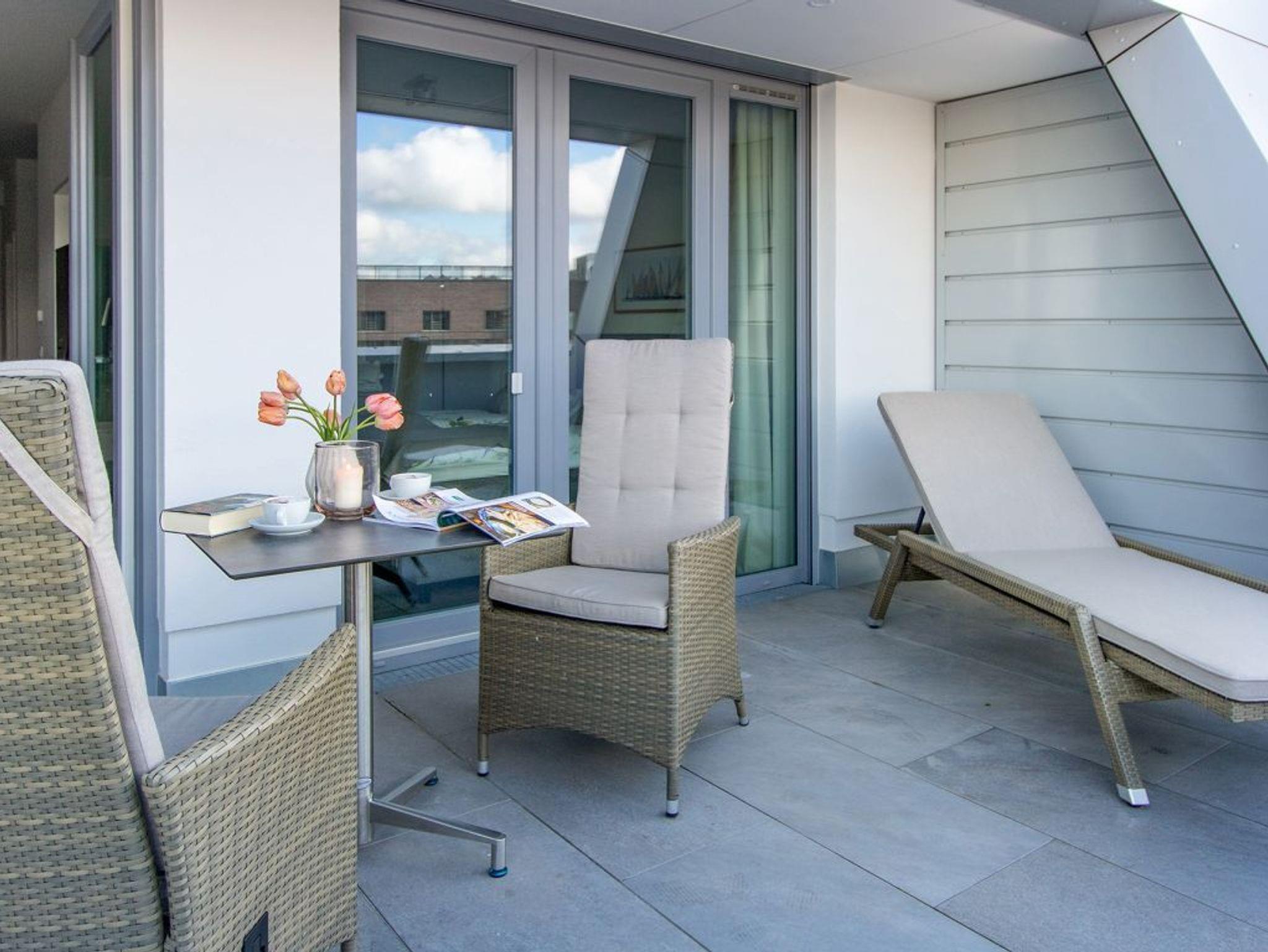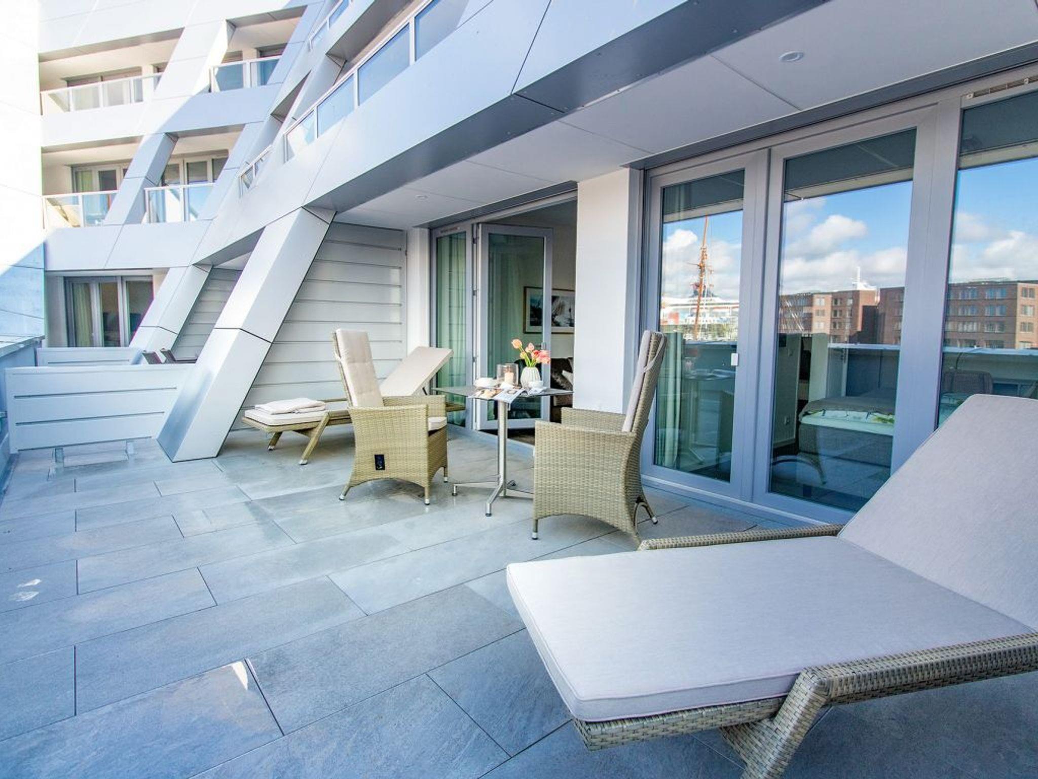 Mit dem Komfortappartement Hafenspitze 12 buchen Sie einen luxuriösen Aufenthalt im 1. Obergeschoss des Hauses, wohin Sie bequem mit dem Fahrstuhl gelangen. Das schick möblierte 2-Zimmer-Ferienappartement besitzt eine Wohnfläche von 59qm und ist ideal für bis zu 4 Personen. Von der großzügigen, möblierten Terrasse mit 2 Sonnenliegen, blicken Sie direkt auf den Hafen und auch auf die Ostsee. Der lichtdurchflutete Wohn-Essbereich der Ferienwohnung besitzt bodentiefe Fenster, die sich durch elektrischen Sonnenschutz abdunkeln lassen. Zudem sind ein Sofa, Esstisch, 2 Internet Fernseher mit Hotelmodus und Internetradio vorhanden. WLAN steht Ihnen selbstverständlich kostenfrei zur Verfügung.