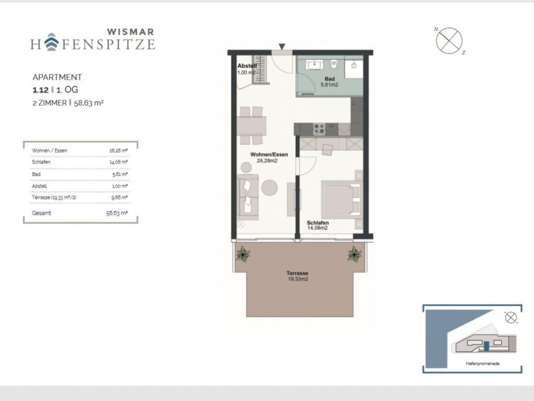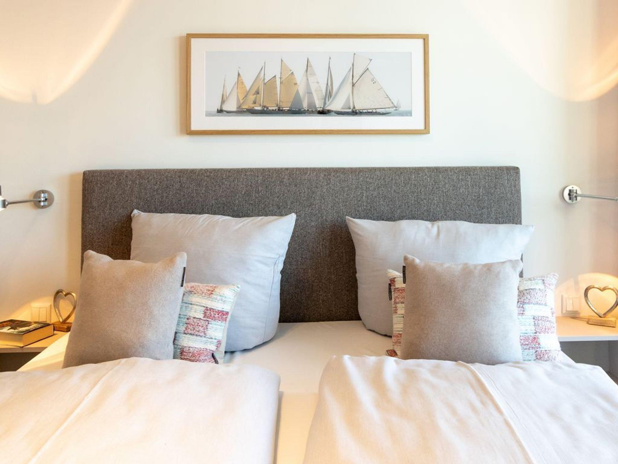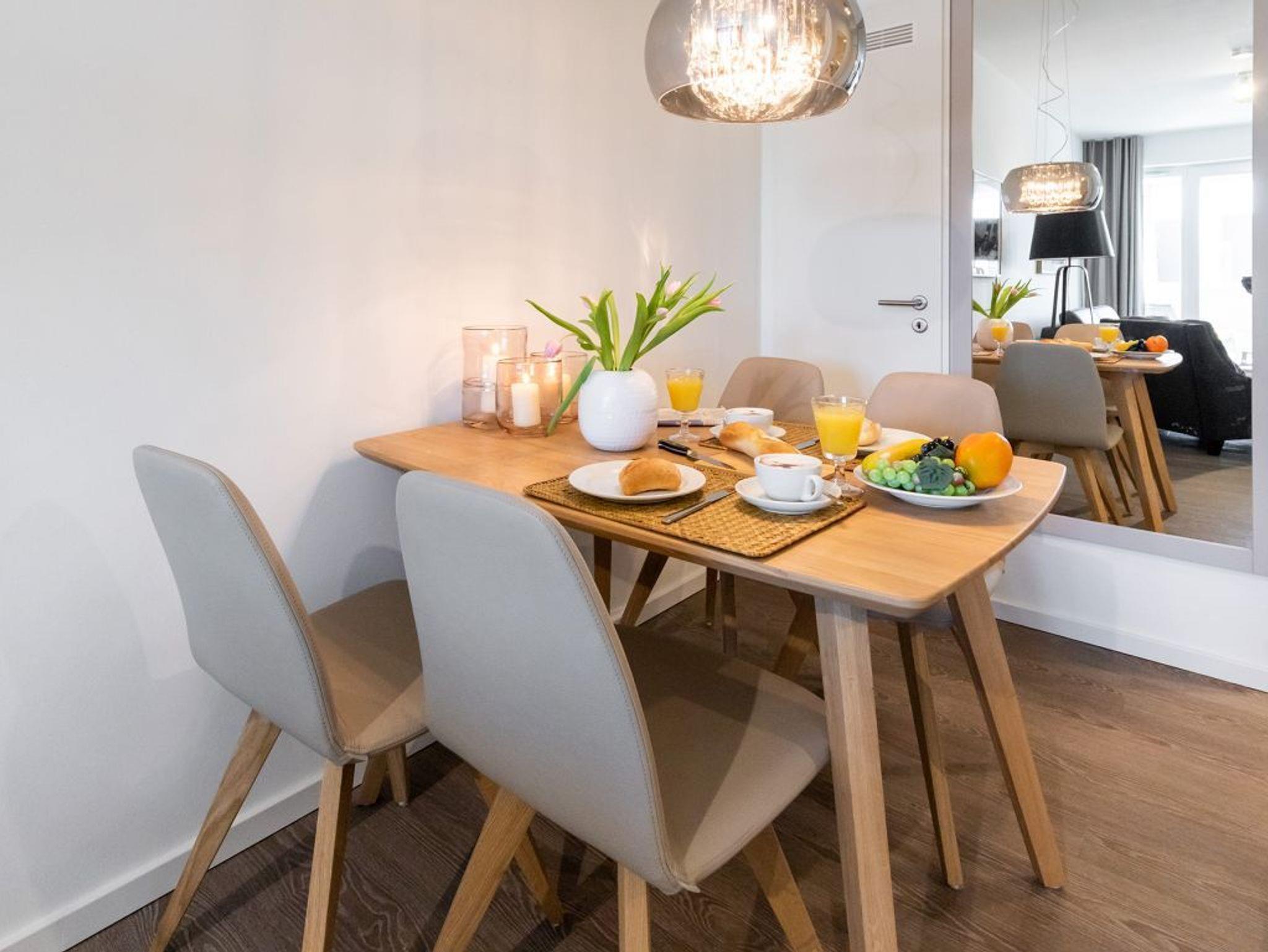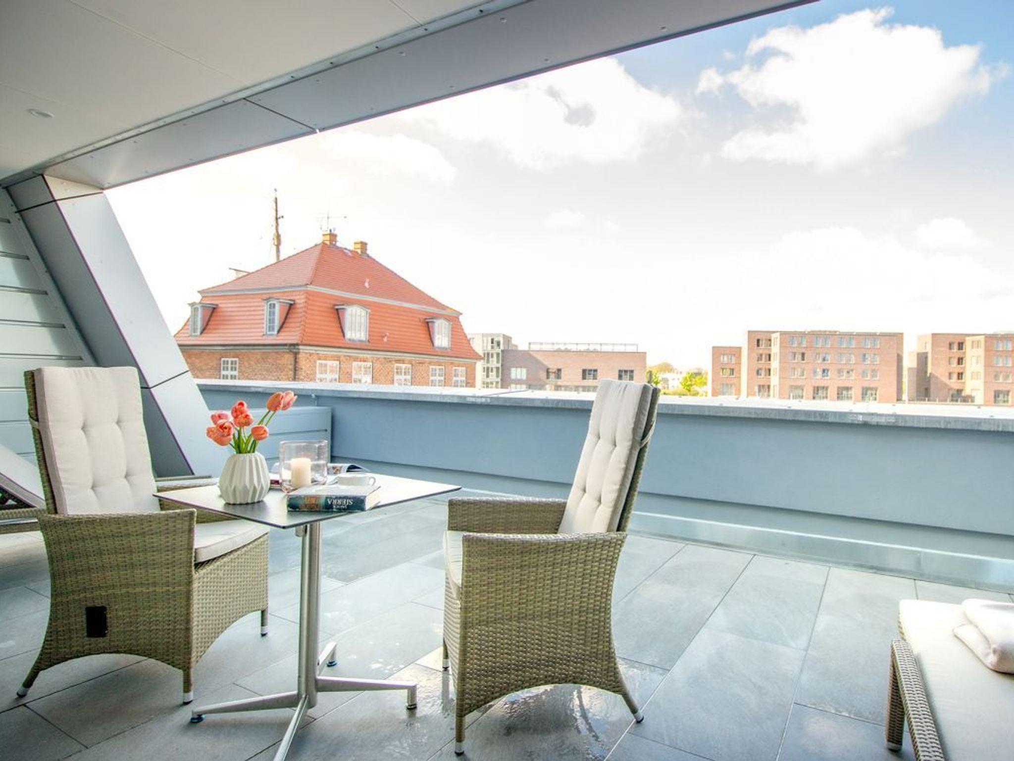 Mit dem Komfortappartement Hafenspitze 12 buchen Sie einen luxuriösen Aufenthalt im 1. Obergeschoss des Hauses, wohin Sie bequem mit dem Fahrstuhl gelangen. Das schick möblierte 2-Zimmer-Ferienappartement besitzt eine Wohnfläche von 59qm und ist ideal für bis zu 4 Personen. Von der großzügigen, möblierten Terrasse mit 2 Sonnenliegen, blicken Sie direkt auf den Hafen und auch auf die Ostsee. Der lichtdurchflutete Wohn-Essbereich der Ferienwohnung besitzt bodentiefe Fenster, die sich durch elektrischen Sonnenschutz abdunkeln lassen. Zudem sind ein Sofa, Esstisch, 2 Internet Fernseher mit Hotelmodus und Internetradio vorhanden. WLAN steht Ihnen selbstverständlich kostenfrei zur Verfügung.