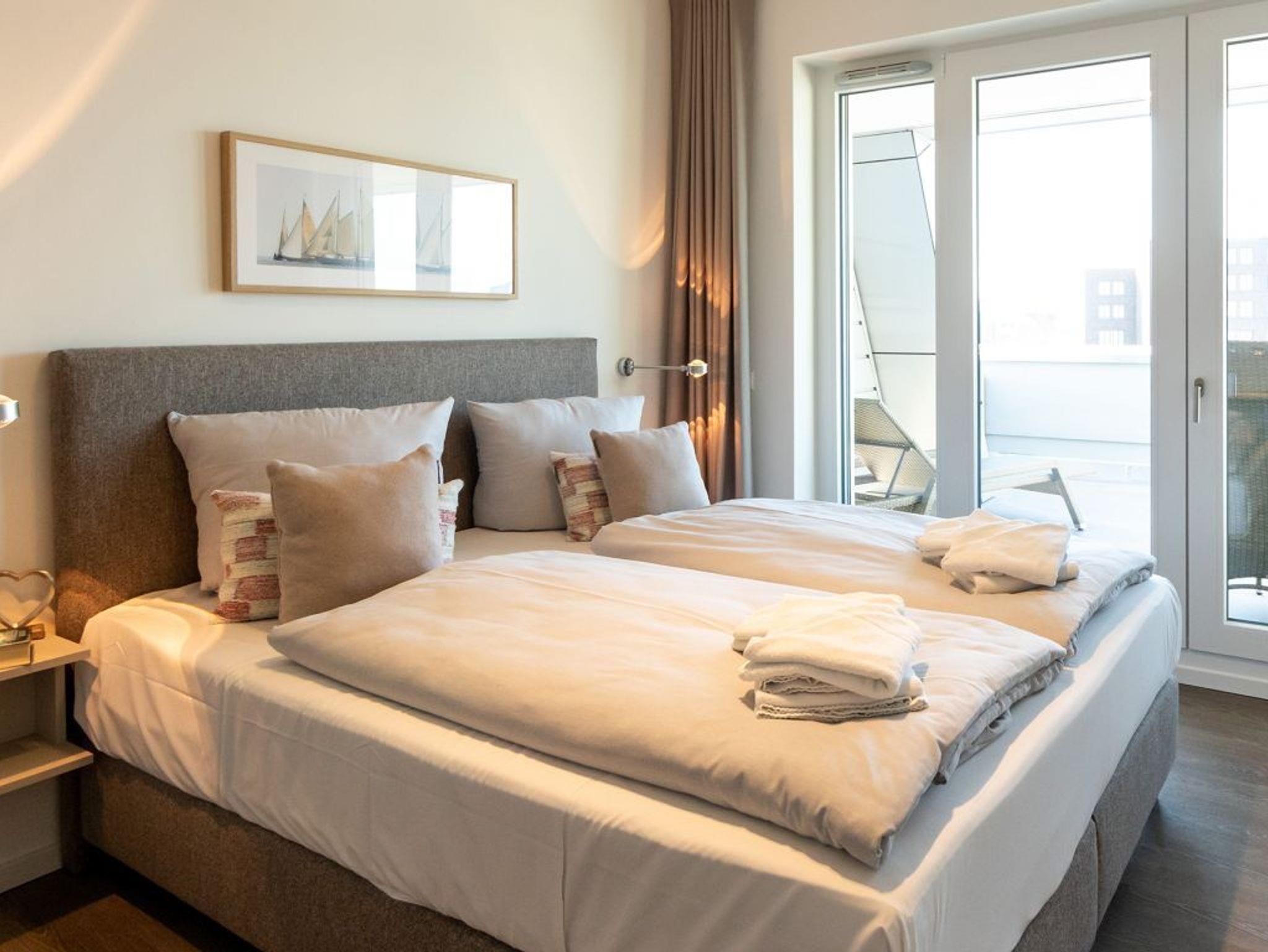 Die hier beschriebene 2-Zimmer-Ferienwohnung Hafenspitze 12 verspricht mir modernster Ausstattung sowie Süd-West Terrasse mit Hafenblick einen komfortablen Aufenthalt. Die Wohnfläche beträgt 59qm. Eine voll ausgestattete Küchenzeile ist in den Wohnbereich integriert. Zugehörig sind ein separates Schlafzimmer sowie 1 moderndes Duschbad. Bei Anreise sind bezogene Betten sowie Handtücher für 2 Personen inklusive. Eine Belegung dieser Wohnung ist mit maximal 4 Personen möglich. Es handelt sich um eine Nichtraucherwohnung. Parkmöglichkeiten gegen Gebühr befinden sich im Parkhaus in ca. 300 Meter.