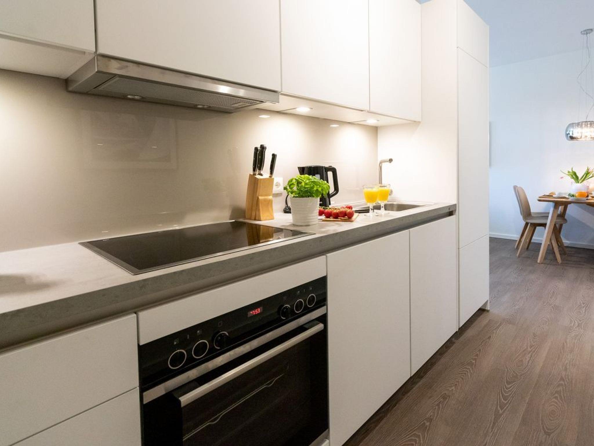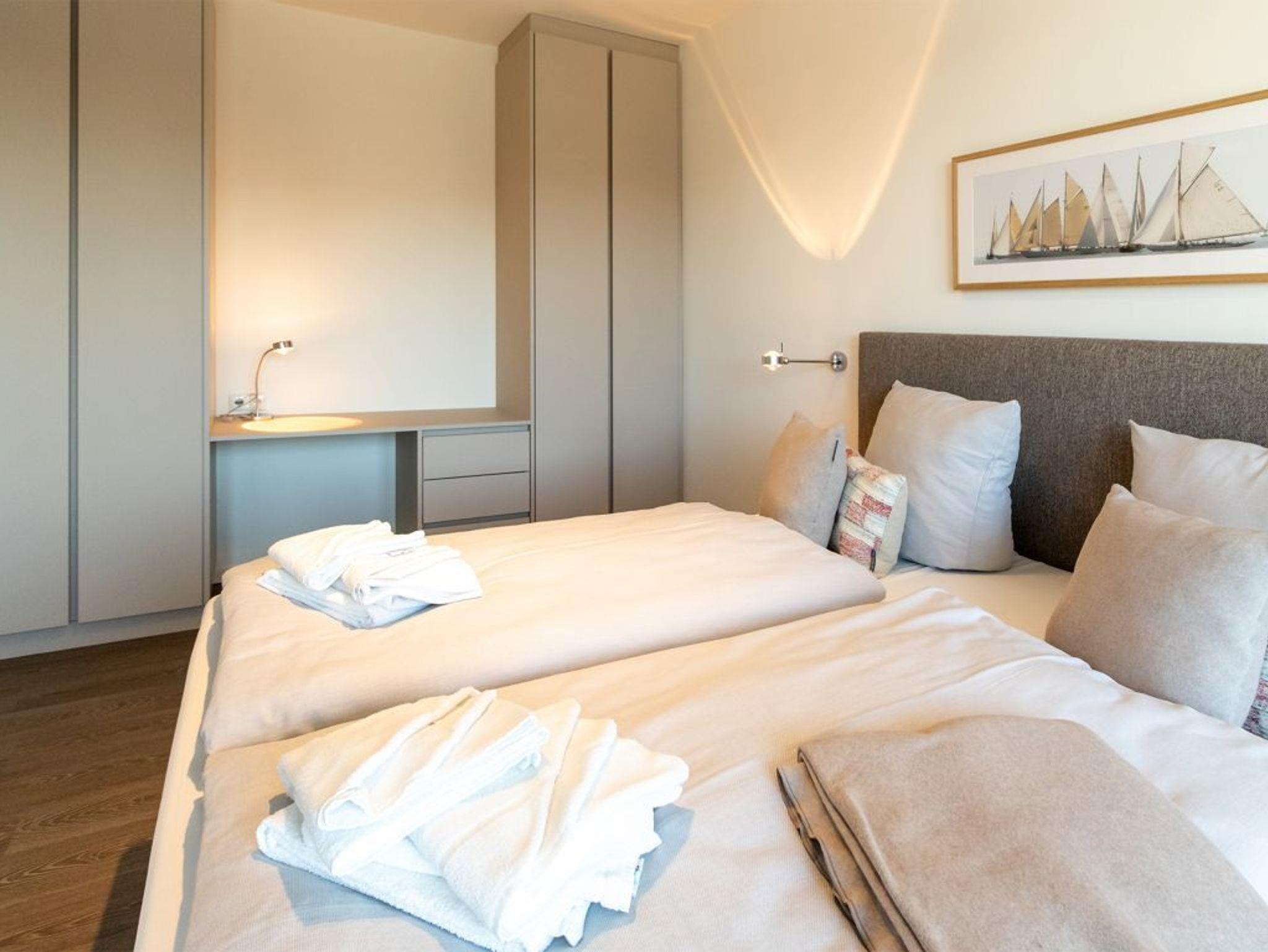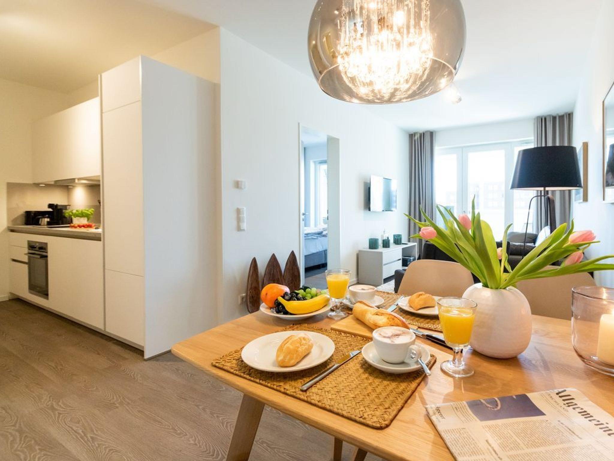 Eine voll ausgestattete Wohnküchenzeile ist integriert und ermöglicht somit auch die Selbstversorgung. Zugehörig sind ein Schlafzimmer mit Doppelbett sowie ein innenliegendes Komfort Duschbad. Als inklusive Service sind bei Anreise die Betten für 2 Personen bereits bezogen und Hand-Duschtücher liegen bereit. Bei Bedarf erhalten Sie gegen Gebühr weitere Wäschepakete an der Rezeption.
