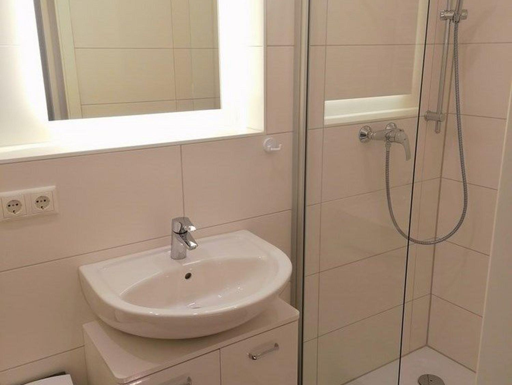 - Badezimmer mit Dusche, WC, Waschbecken, Spiegelschrank