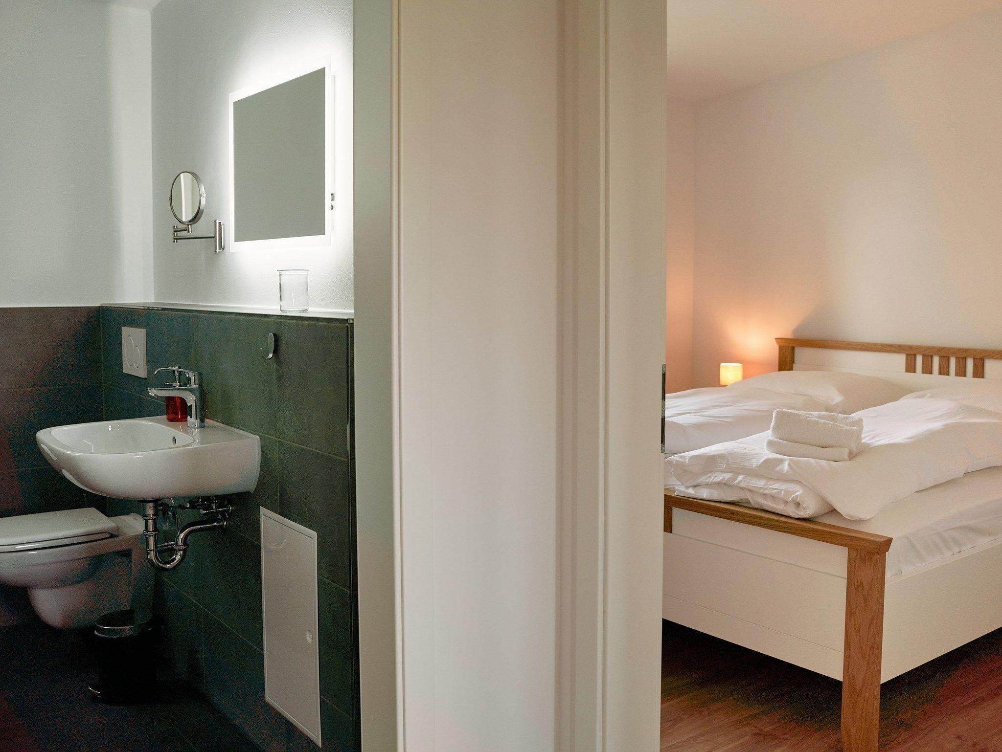 - bodenebene Dusche (90 x 1,20m), WC, Spiegel, Kosmetikspiegel und Ablage