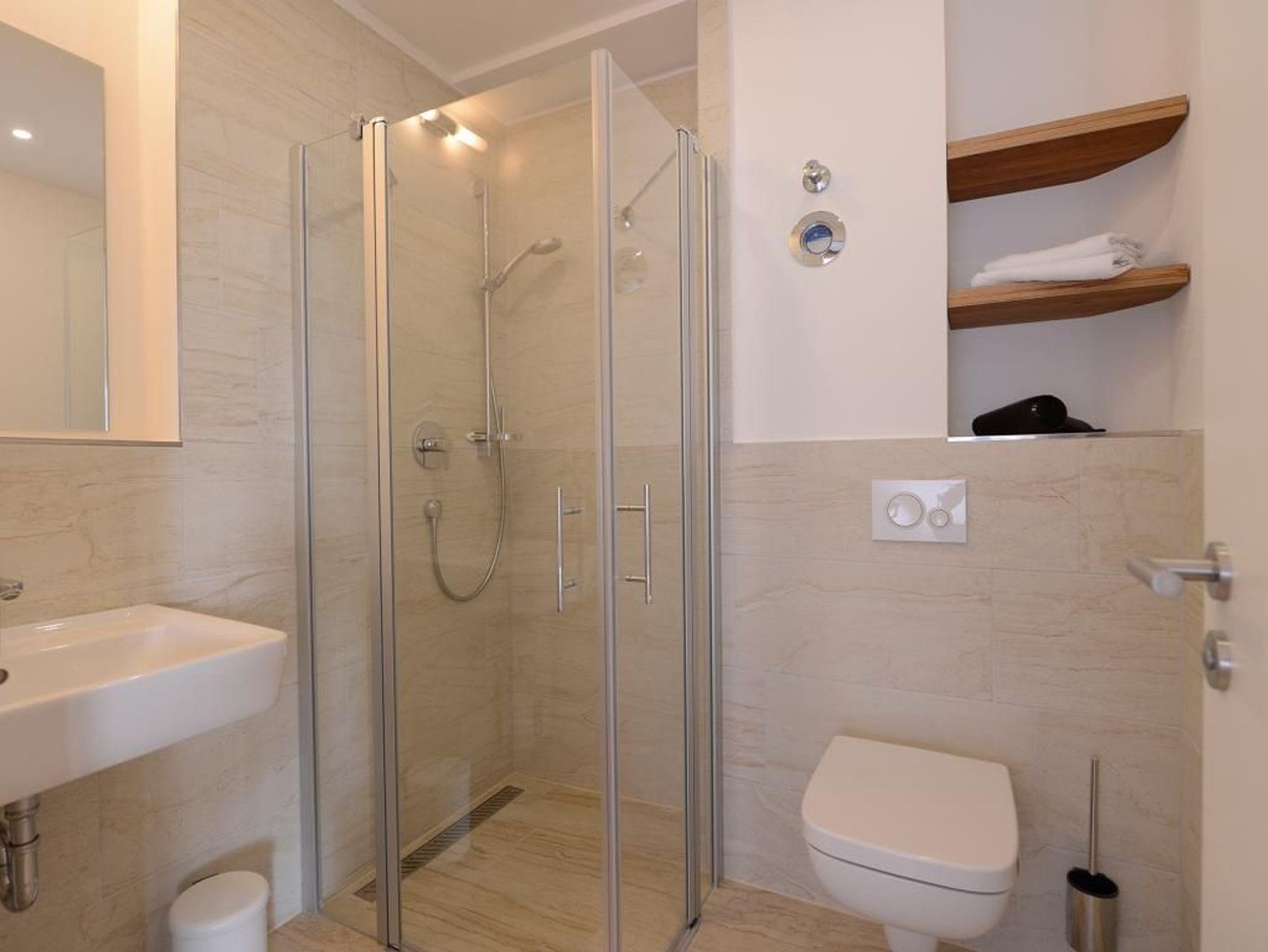 Appartementhaus mit 48 Appartements. Das 2-Zimmer-Appartement verspricht einen Urlaub der Extraklasse für bis zu 4 Personen. In der 5. Etage gelegen, die leicht durch den Lift zu erreichen ist, bietet dieses exklusive Appartement einen unvergesslichen Urlaub. Die 55m² Wohnfläche sind sehr hochwertig ausgestattet. Der Wohn-/Essbereich mit Fernseher lädt zum Verweilen ein. Über den Wohnbereich gelangen Sie auf den Balkon mit einer spektakulären Aussicht. Die Küche verfügt über Mikrowelle, Geschirrspüler, Kaffeemaschine, Wasserkocher und diverse Kleingeräte. Das stilvoll eingerichtete Schlafzimmer sorgt für erholsame Stunden. Des Weiteren steht Ihnen ein Badezimmer zur Verfügung. Bei Anreise sind 2 Betten bezogen und Handtücher liegen für Sie bereit. WLAN steht Ihnen kostenfrei zur Verfügung. In unmittelbarer Nähe sind öffentliche Parkplätze vorhanden.