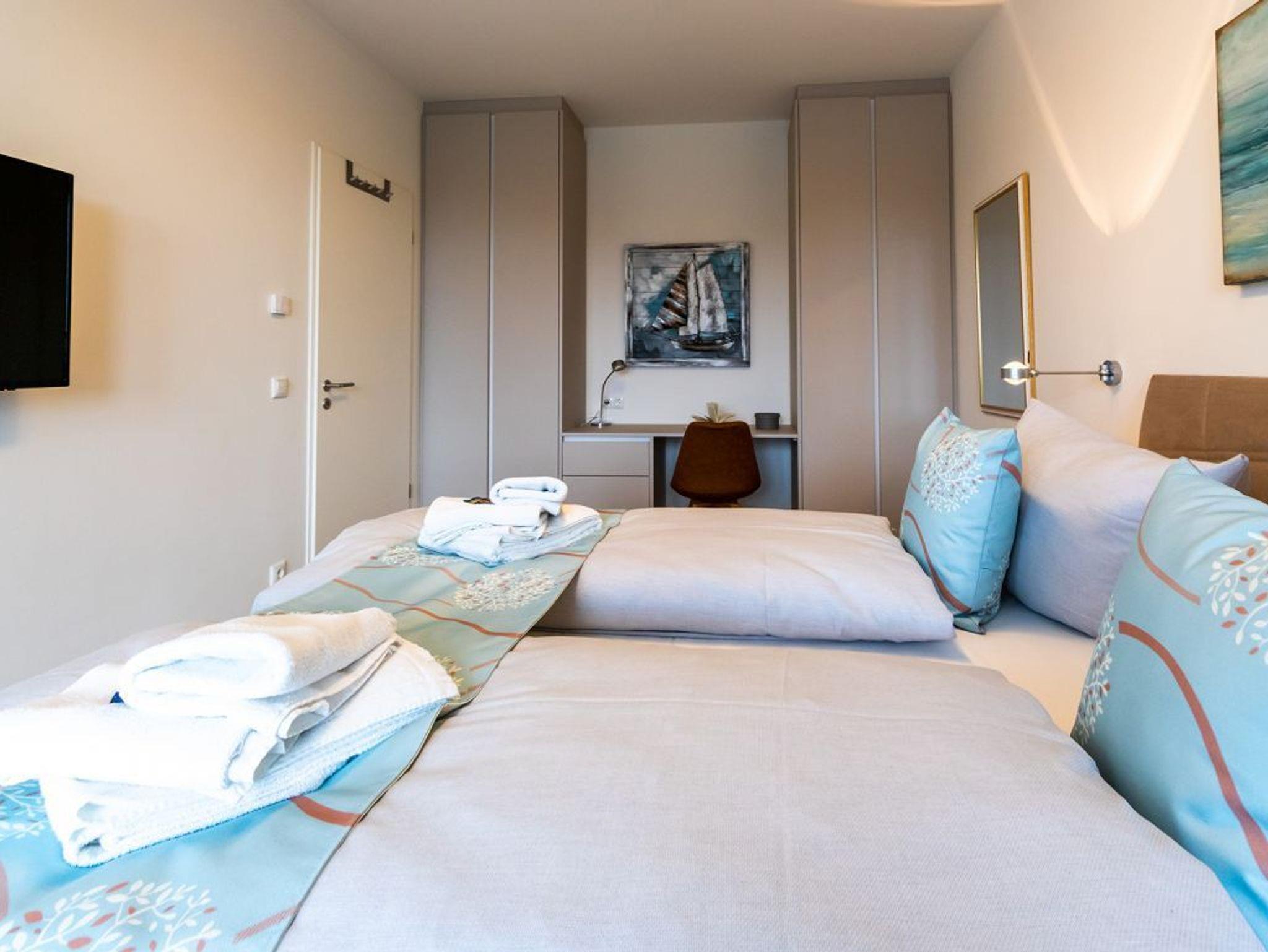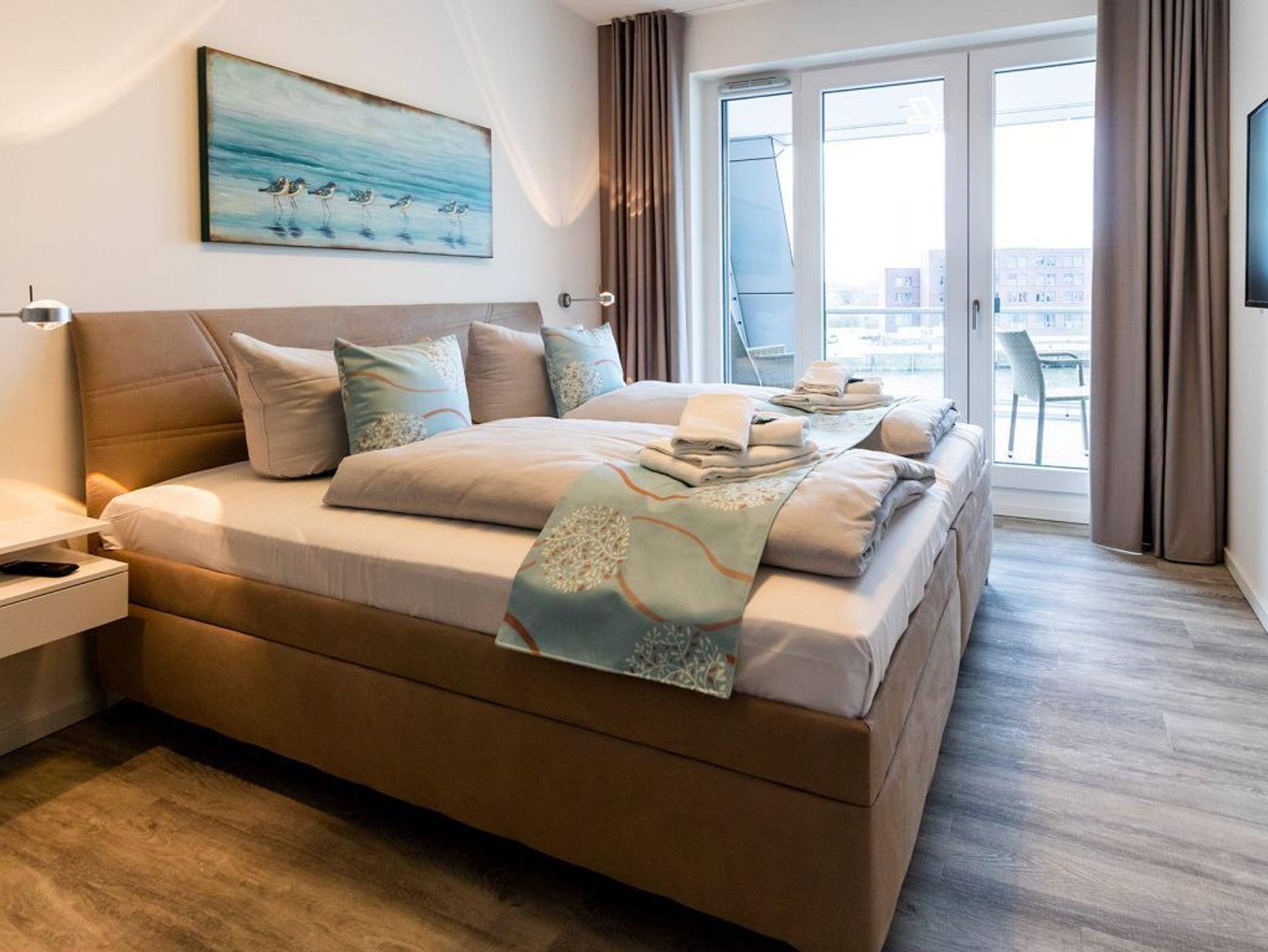 Angenehme Nachtruhe ermöglicht Ihnen das separate Komfort Schlafzimmer mit Doppelbett, Kleiderschrank und Schreibtisch. Das innenliegende Badezimmer mit Glasduschabtrennung, Waschtisch und WC lässt Sie gut gelaunt in jeden Urlaubstag starten. Im gesamten Ferienappartement sorgt eine Fußbodenheizung für wohlige Wärme. Wir bieten Ihnen Urlaubsfeeling von Anfang an, denn bei Ihrer Anreise sind die Betten bereits für Sie bezogen und Hand/Duschtücher liegen bereit Sollten Sie mit dem PKW anreisen, so bietet das öffentliche Parkhaus im Alten Hafen in 300 Meter Stellplätze gegen Gebühr. Wir möchten noch darauf hinweisen, dass es sich um eine Nichtraucherwohnung handelt, Tiere sind nicht erlaubt.