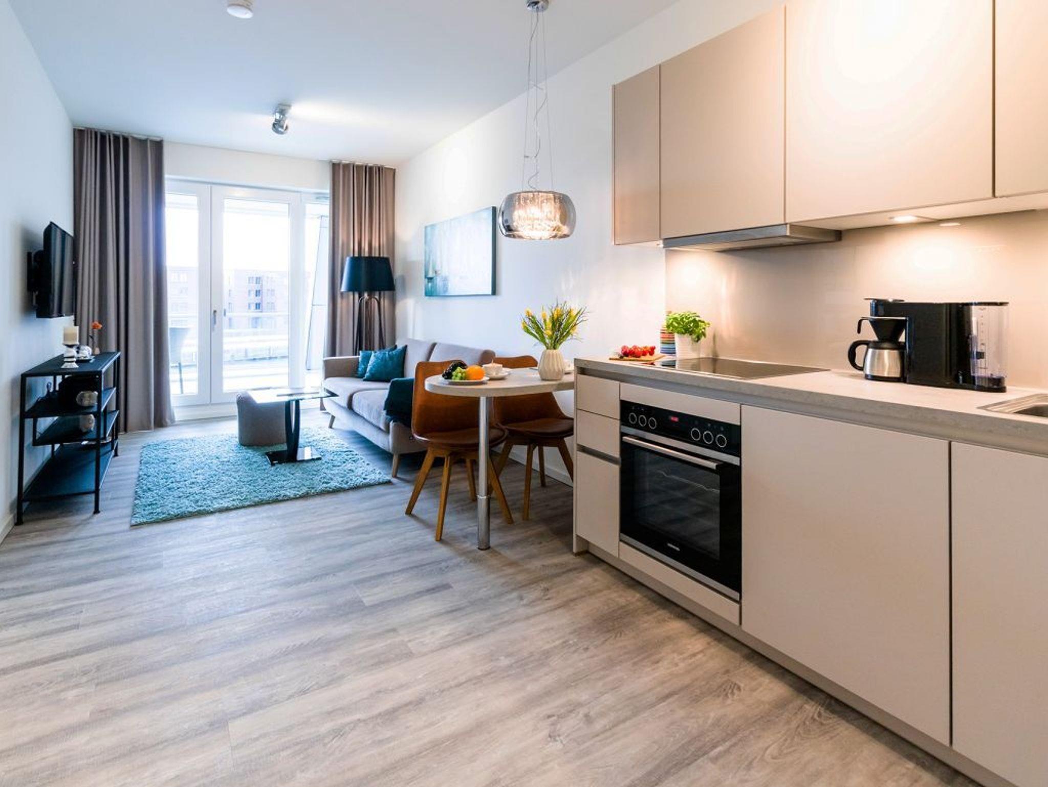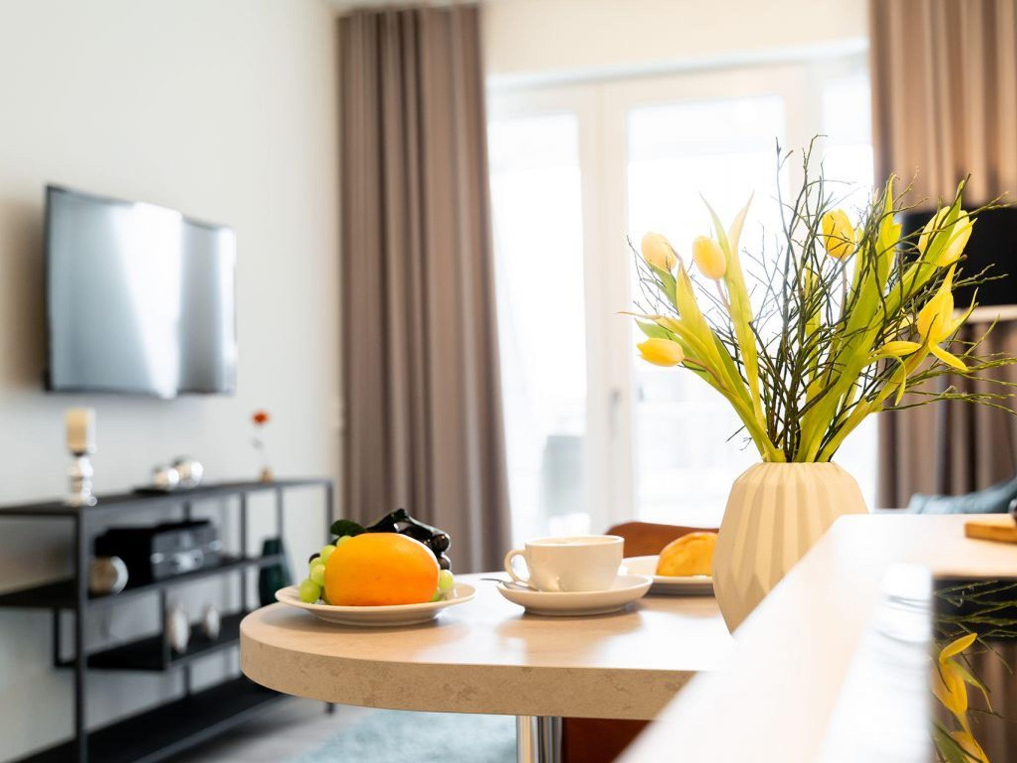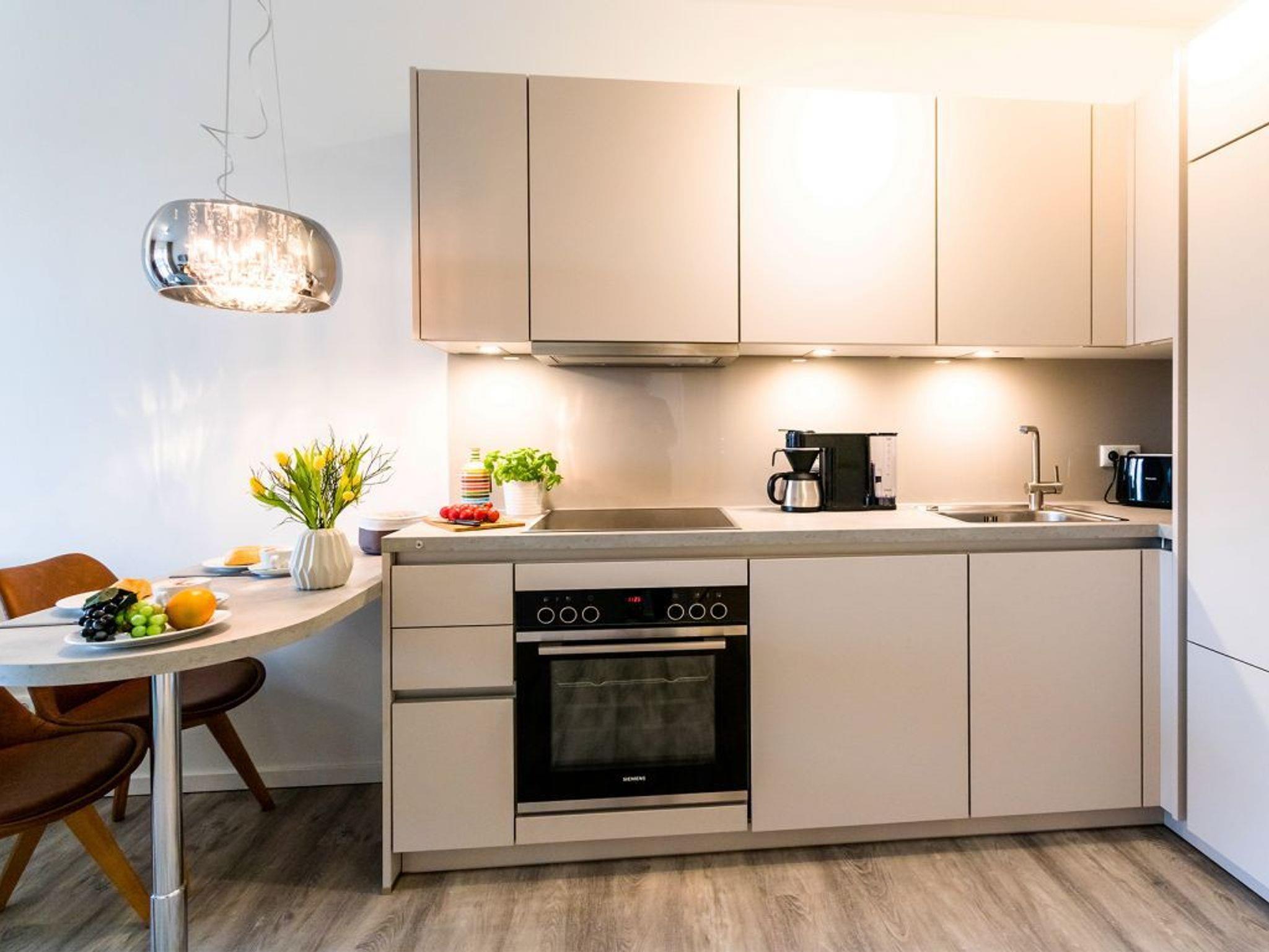 Im modern möblierten Wohn-Essbereich befinden sich behagliche Sitzmöbel sowie eine integrierte und hochwertige Wohnküchenzeile. Gemeinsame Mahlzeiten können Sie an einem Esstisch zu sich nehmen. Somit entscheiden Sie selbst, ob Sie sich gerne in einem der nahen Restaurants verwöhnen lassen möchten oder die Selbstversorgung bevorzugen. Inkludiert sind selbstverständlich der WLAN-Zugang, Fernseher sowie Internetradio mit Hotelmodus.