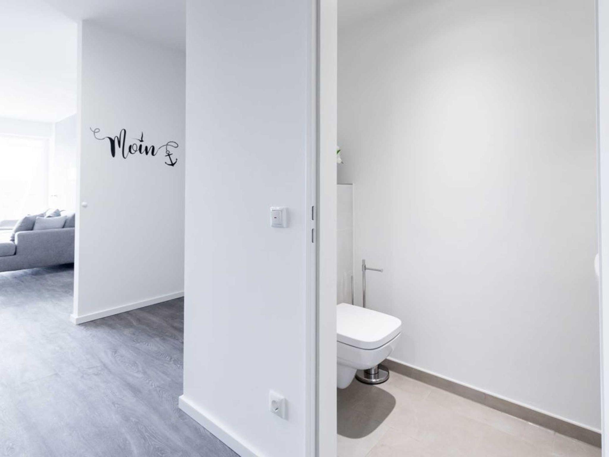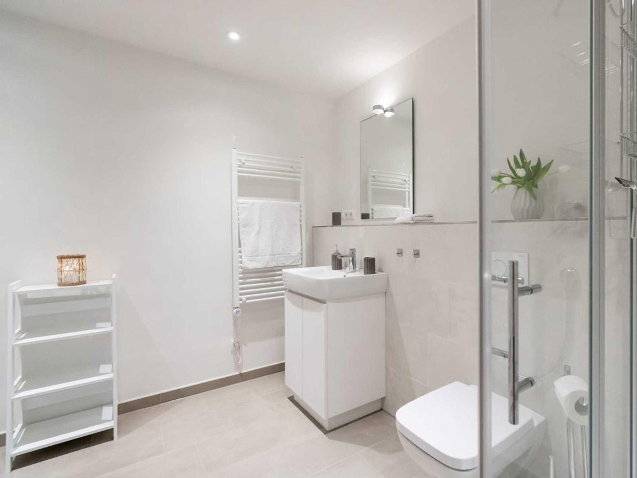 Zugehörig ist ein modernes Badezimmer mit bodengleicher Dusche, Waschtisch, WC, Handtuchtrockner sowie ein zusätzliches Gäste WC. Das gesamte Ferienappartement verfügt über eine Fußbodenheizung, die insbesondere während der Wintermonate für wohlige Wärme sorgt. Als inklusive Service Leistung sind bei Ihrer Ankunft die Betten für zwei Personen bereits bezogen und Hand/Duschtücher liegen ebenfalls bereit.