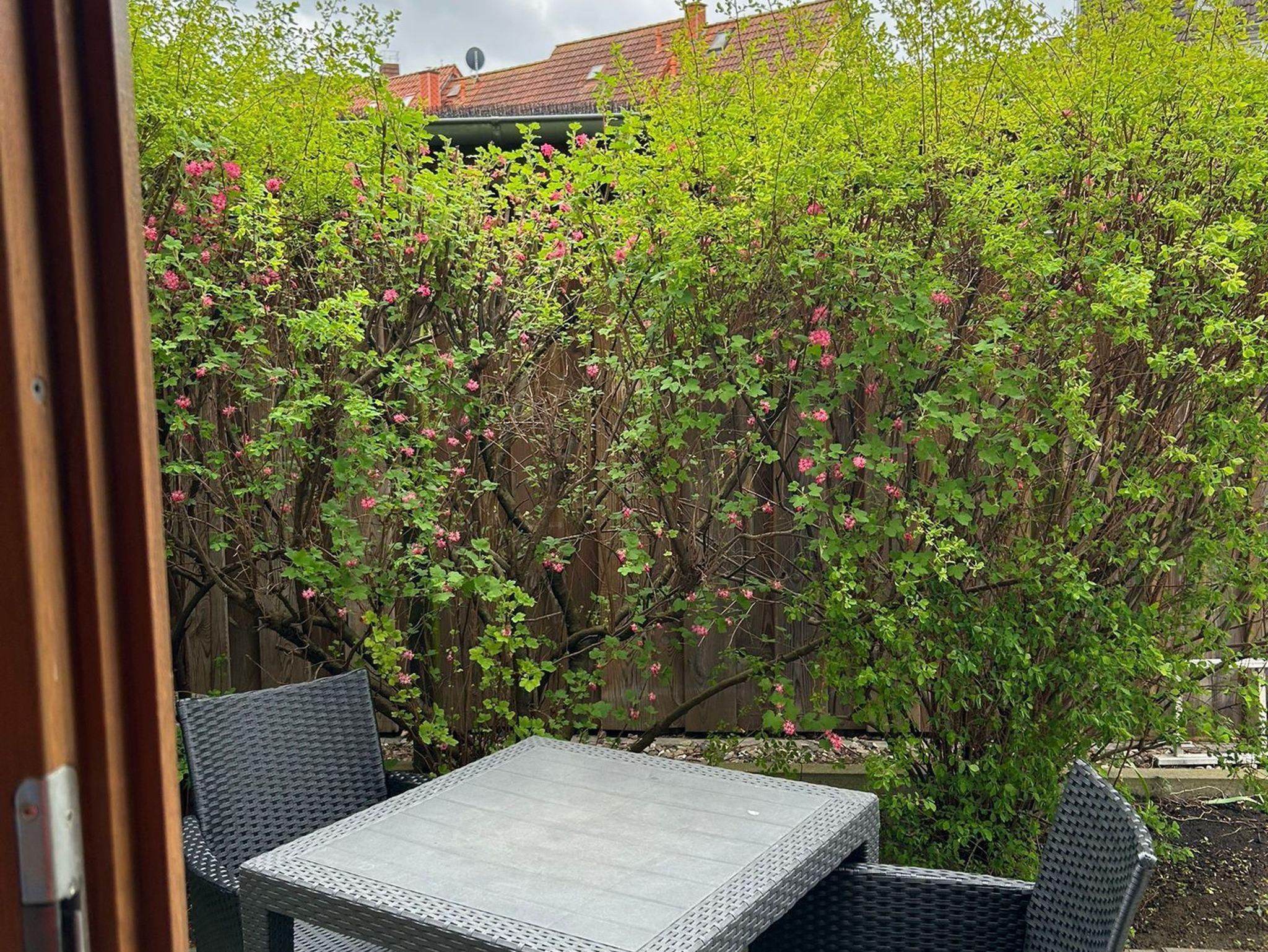 Die Fewo hat einen grünen Außenbereich mit Terrasse nach Süden ausgerichtet und dazu entsprechende Gartenmöbel mit Auflage.