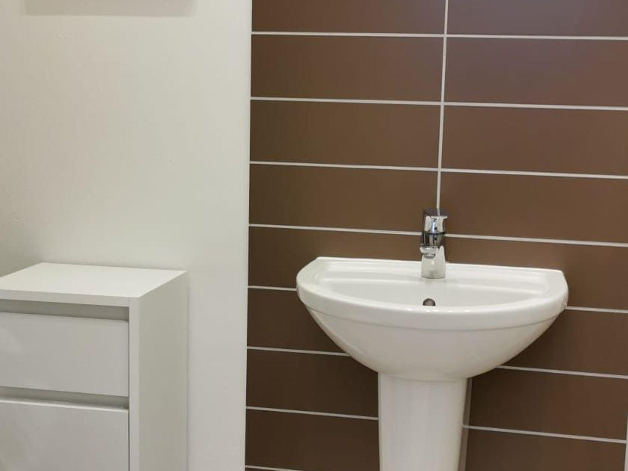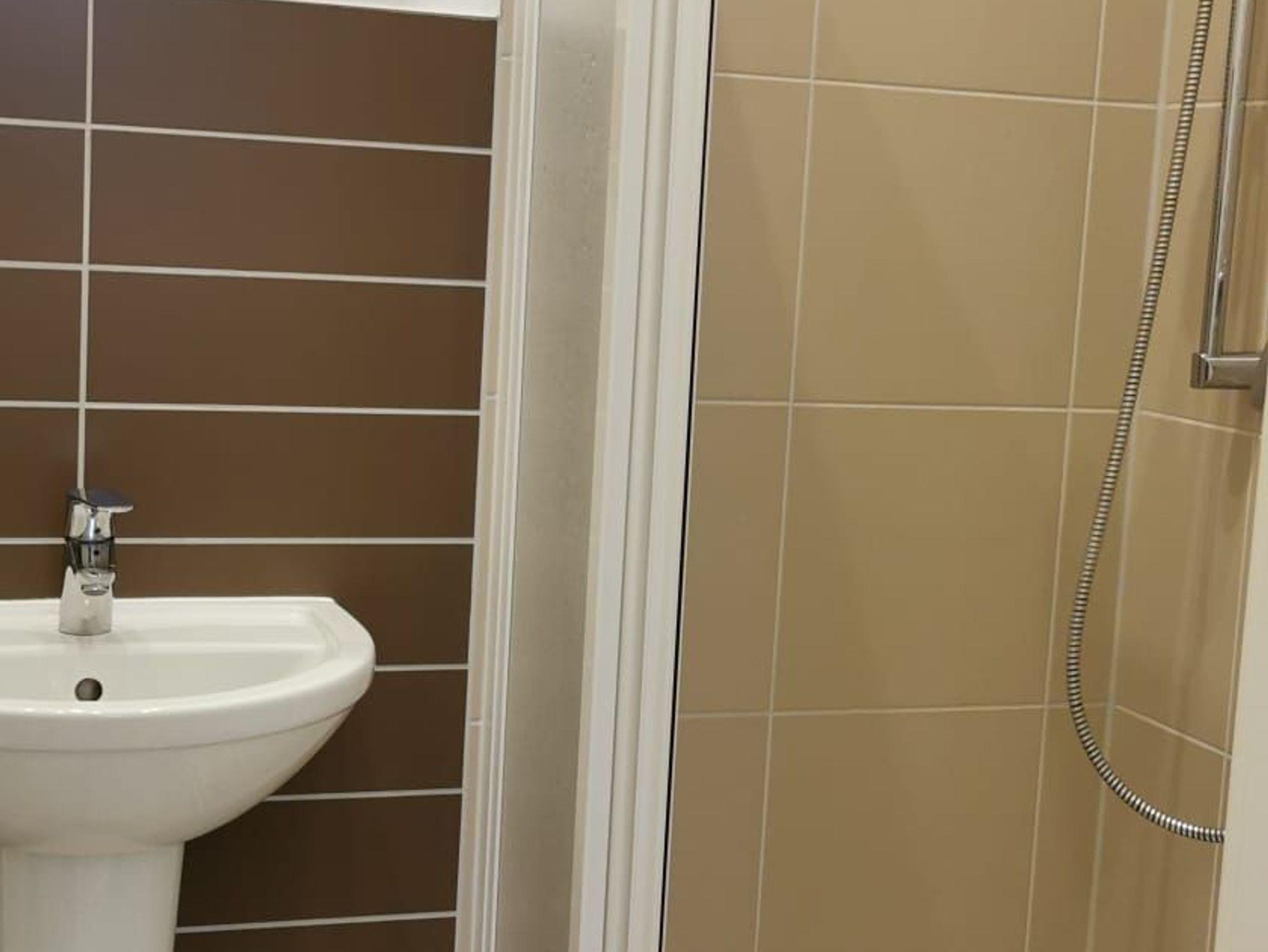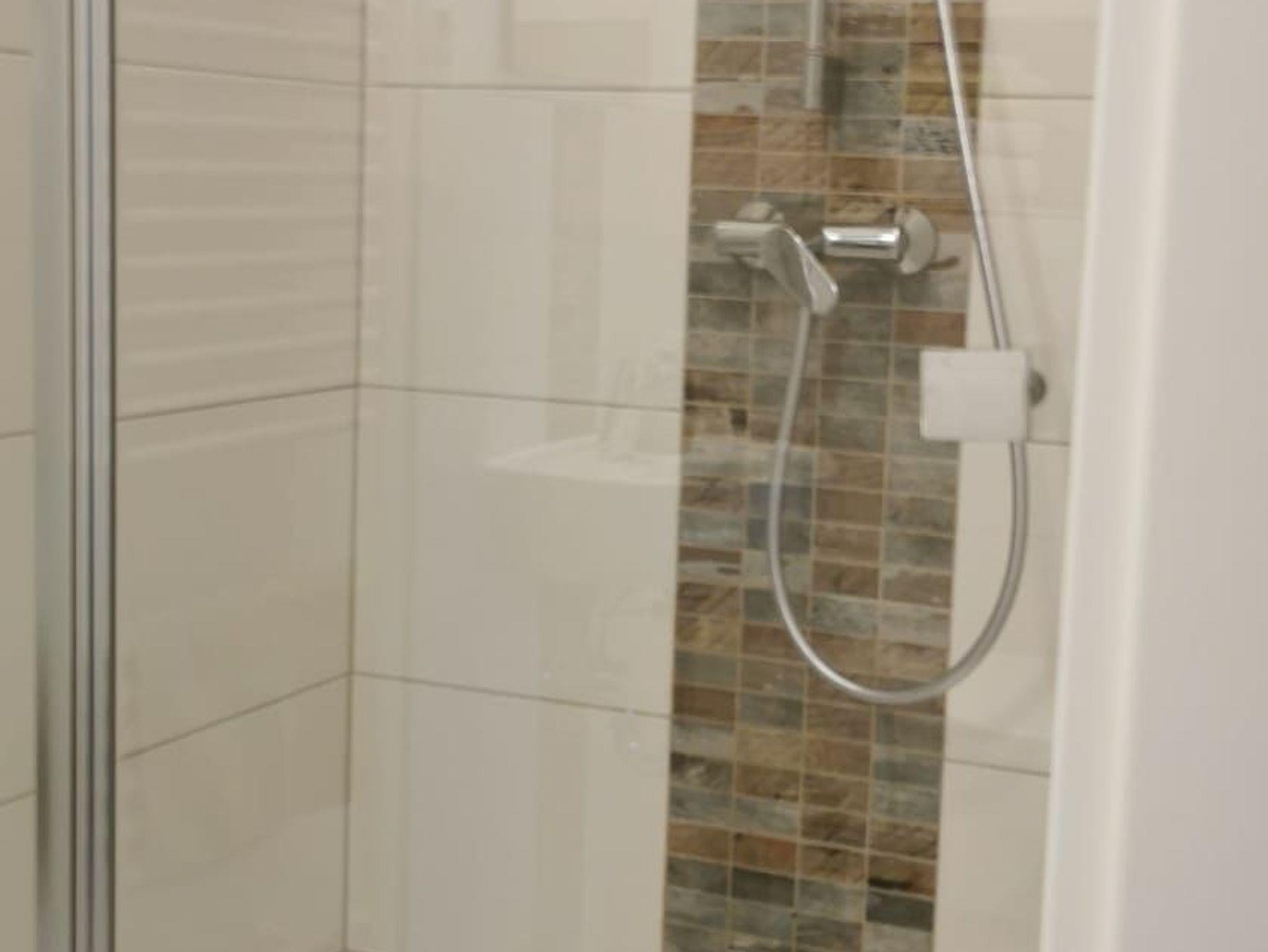- 1 Bad mit Dusche / WC, Handtuchhalter, Spiegel, Ablage, Fön