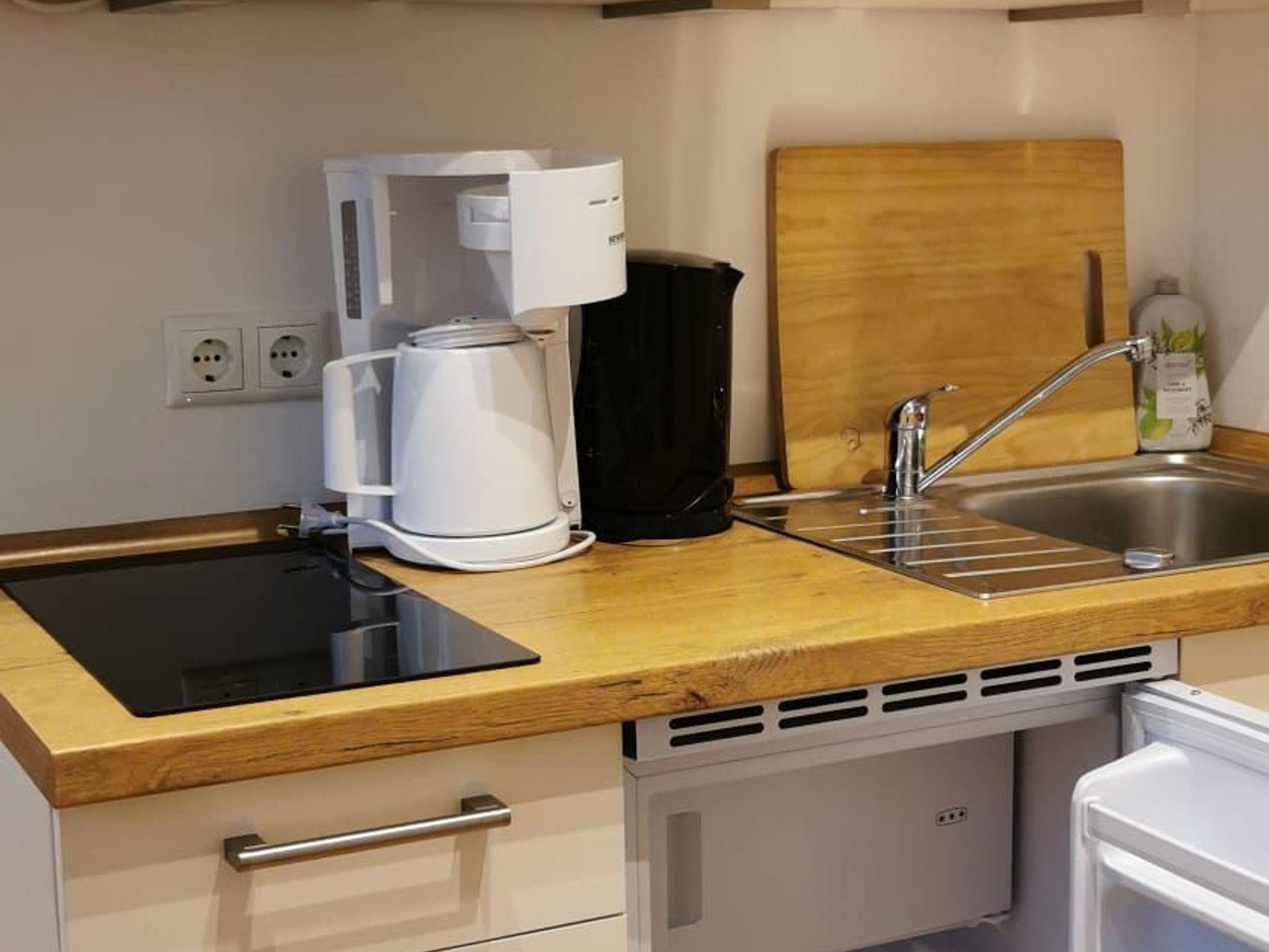 - Pantryküche mit Mikrowelle, 2-Platten-Induktionsherd, Geschirr, Besteck, Töpfe usw.