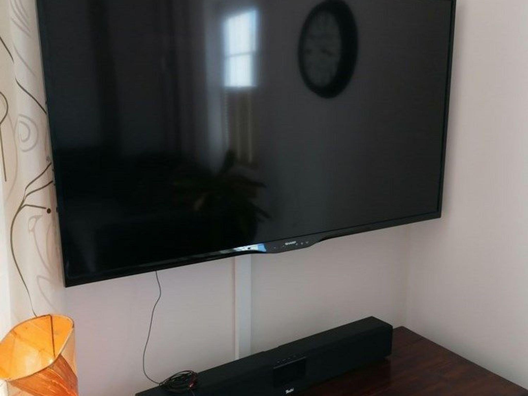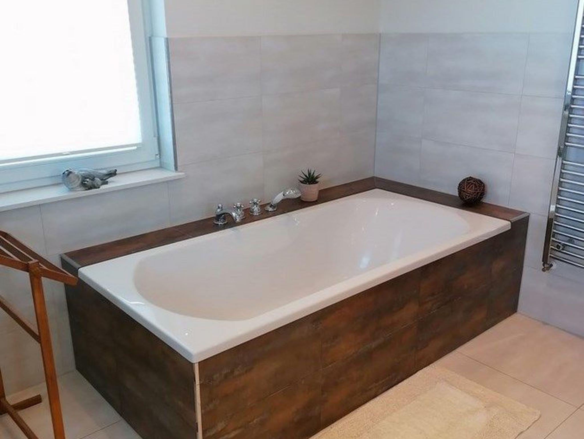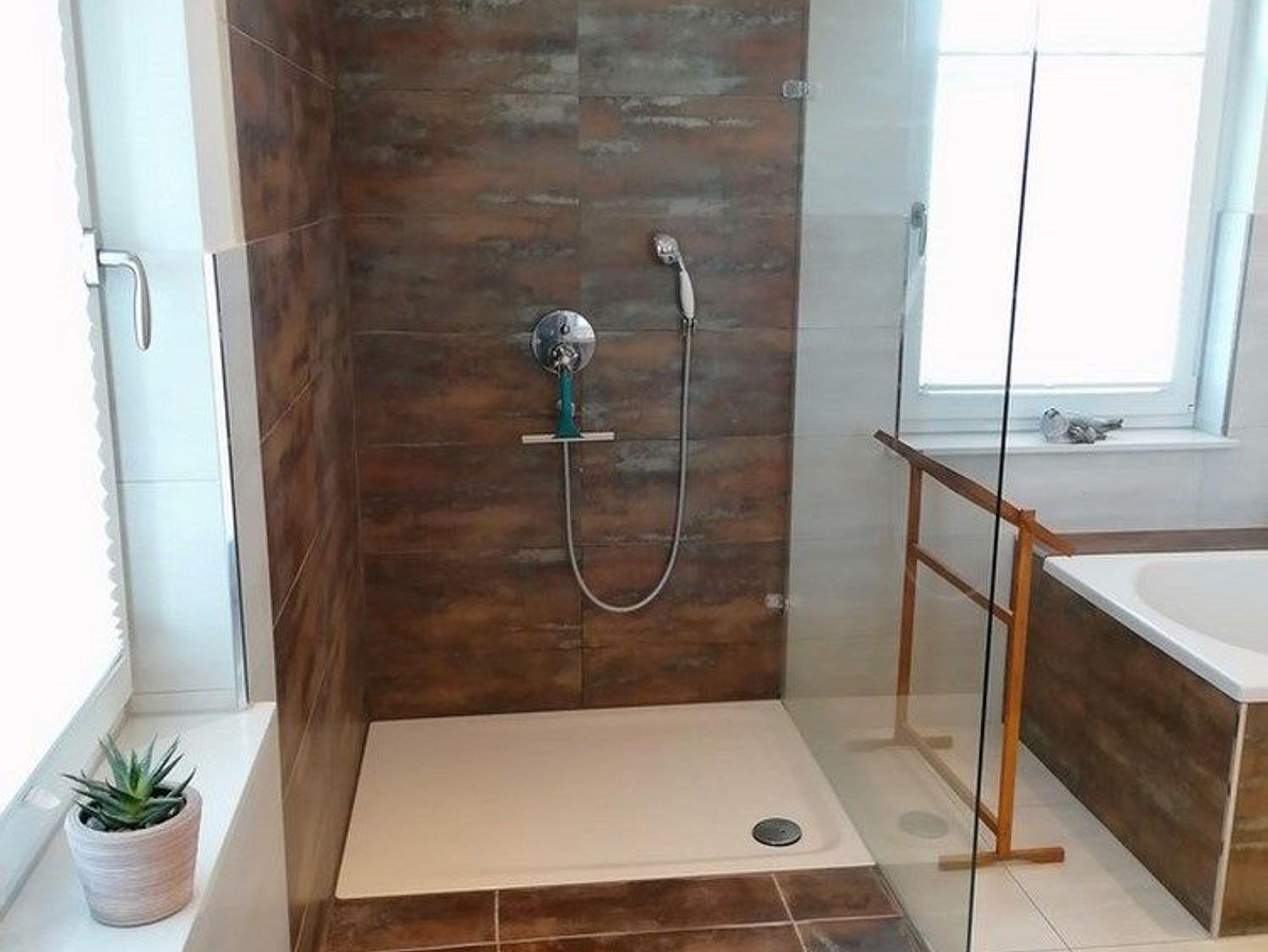 - Vollbadezimmer mit Badewanne, Dusche, WC, großen Spiegelschrank, Radio