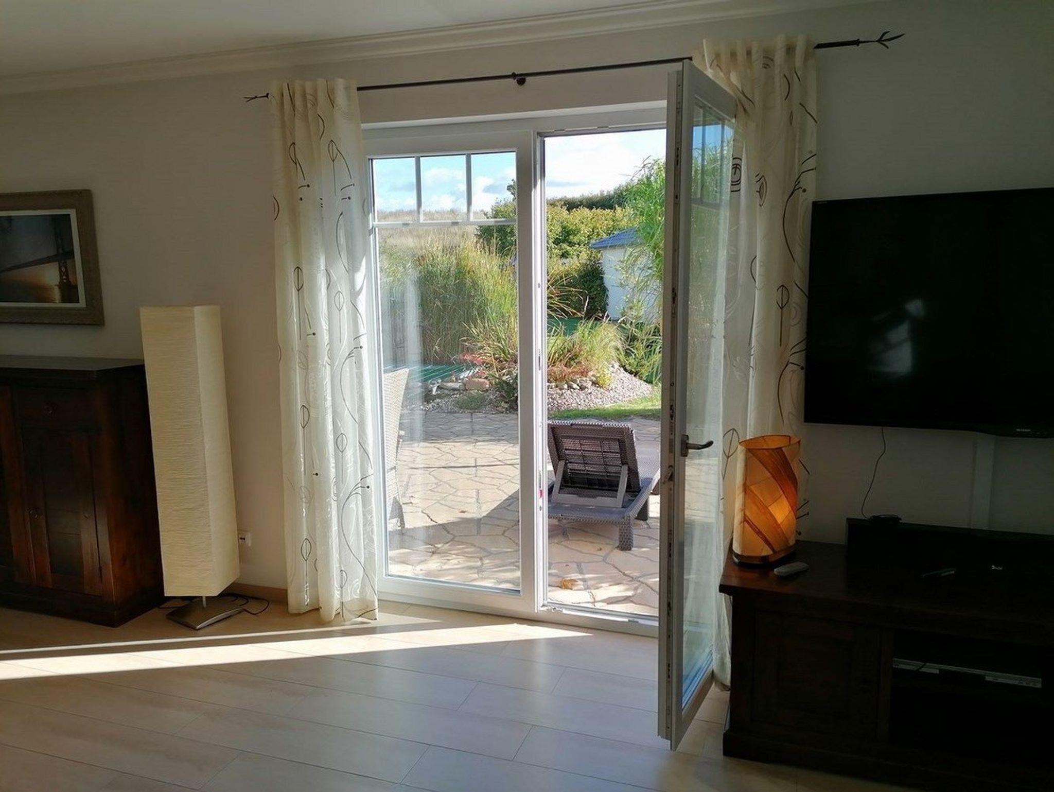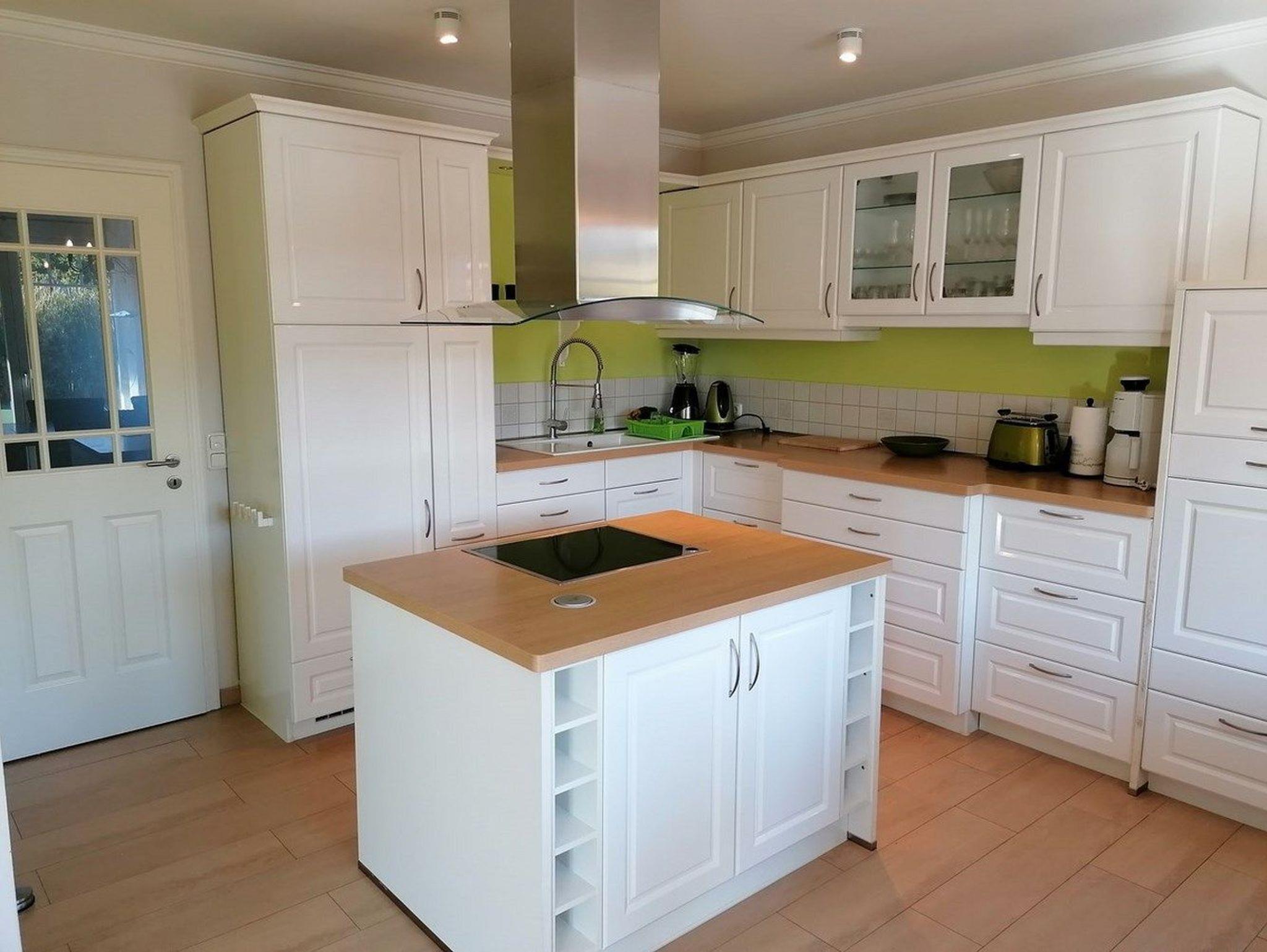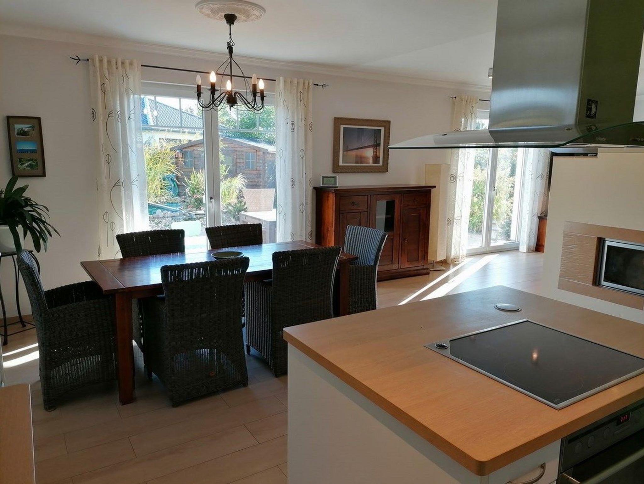 - großes Wohnzimmer (TV, Soundanlage, Kamin) mit offener Küche (u.a. 4-Plattenherd, Backofen, Wasserkocher, Kaffeemaschine, Kühlschrank, Gefrierschrank, Geschirrspüler, Kochinsel) und Essbereich