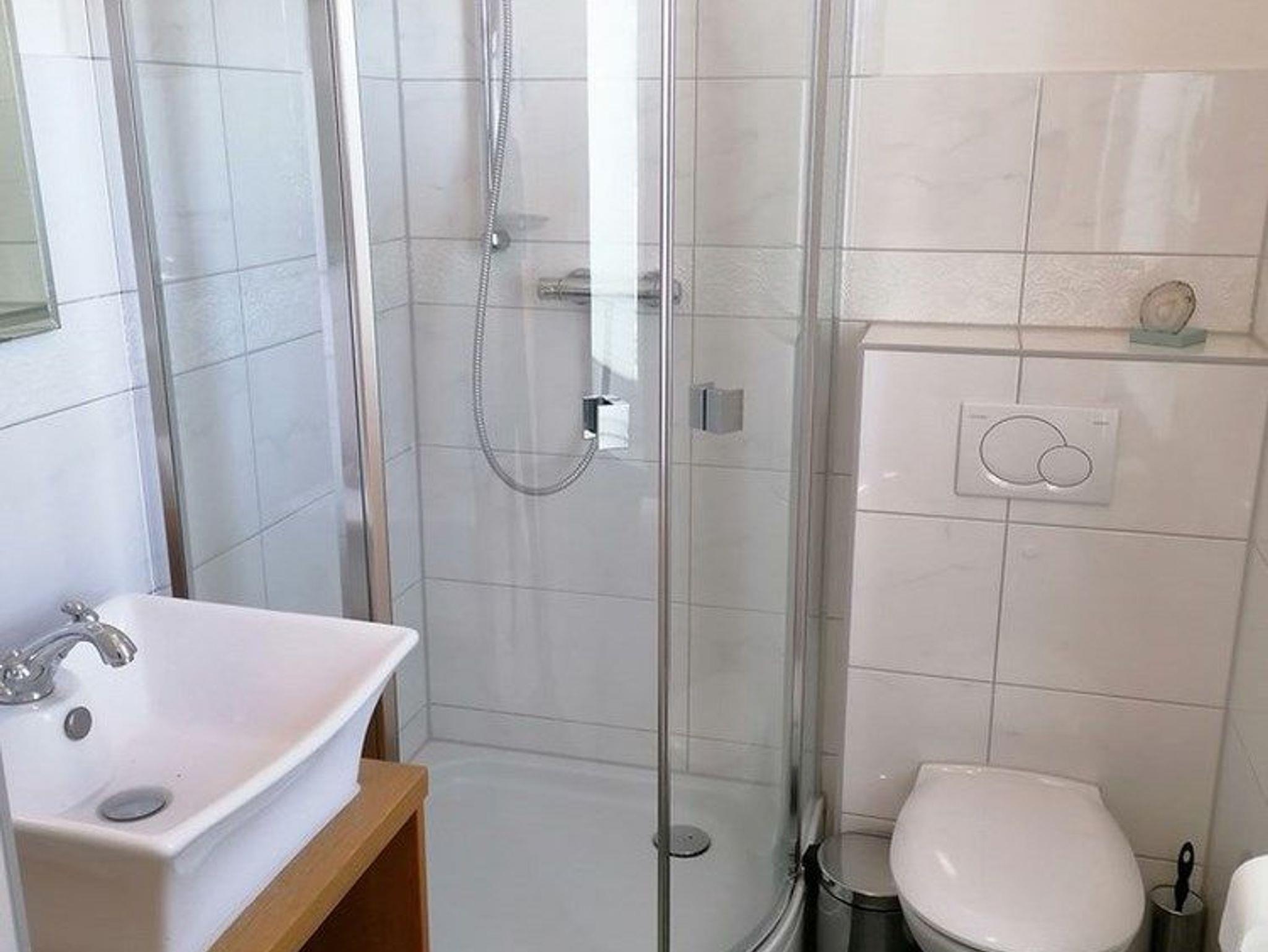 - Duschbad mit Dusche, Waschbecken, Spiegel und WC