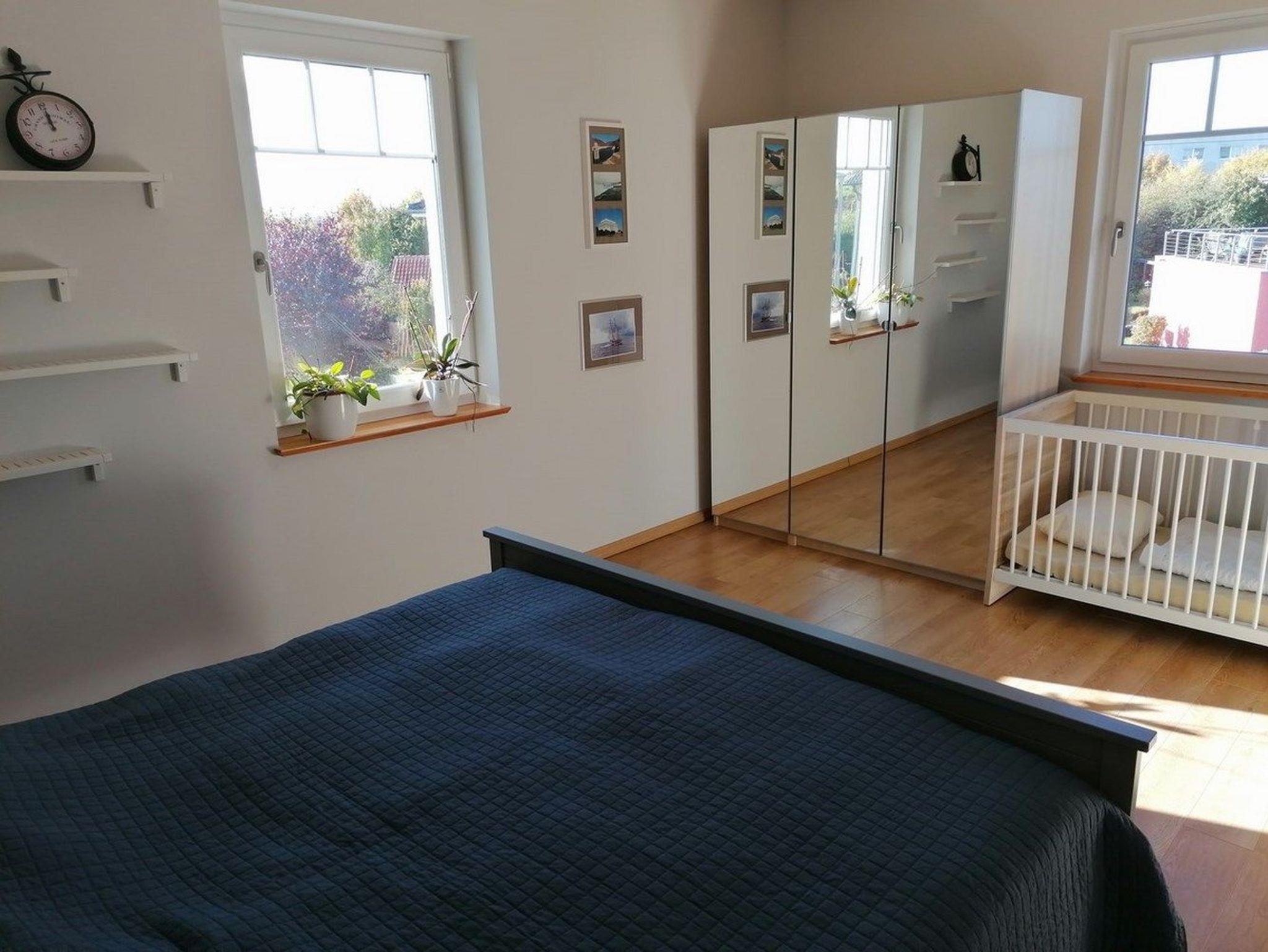 - Schlafzimmer mit Doppelbett, Kinderbett und Kleiderschrank
