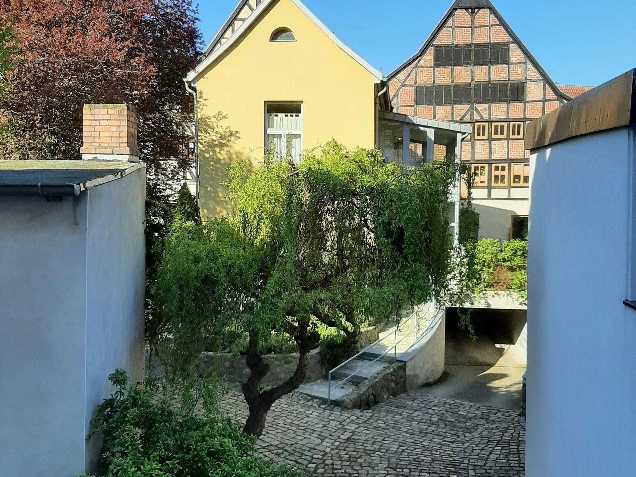 Das Fenster der Küche schaut auf einen der schönsten, aber vollkommen ruhigen Hof von Wismar mit zwei hanseatischen Prachtgiebeln.