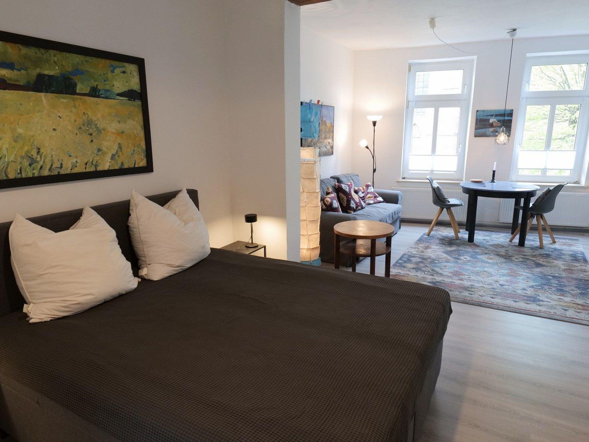 Die Wohnung ist mit allen Annehmlichkeiten und originellen Einzelmöbeln ausgestattet. An den Wänden hängen große und kleine Originalgemälde mit Wismar- und Ostseeassoziationen.
