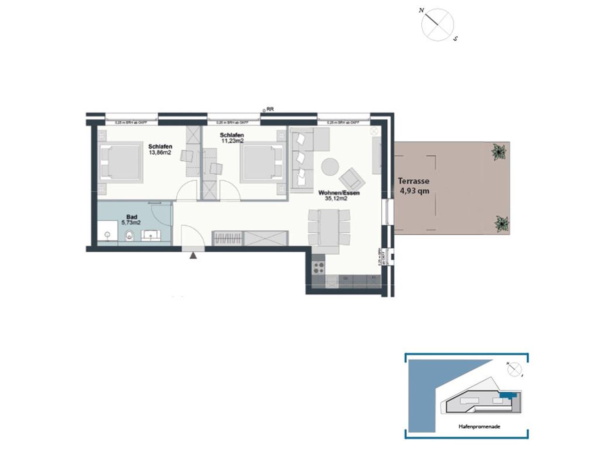 Sie bewohnen das im 1. Obergeschoss liegende, sehr komfortable 3-Zimmer-Ferienappartement Hafenspitze Dock 07 mit einer Wohnfläche von 75qm sowie Balkon in östliche Richtung. Für eine Belegung mit bis zu 4 Personen bietet das Appartement nahezu ideale Bedingungen. Der Wohn- Essbereich ist kombiniert und Sie können es sich auf dem Komfortsofa direkt gemütlich machen. Zudem befinden sich hier ein Esstisch, internetfähiger Fernseher und Internetradio. Die offene und voll ausgestattete Küchenzeile ermöglicht mit Herd, Mikrowelle, Kühlschrank, Geschirrspüler, Kaffeemaschine usw. die Selbstversorgung.