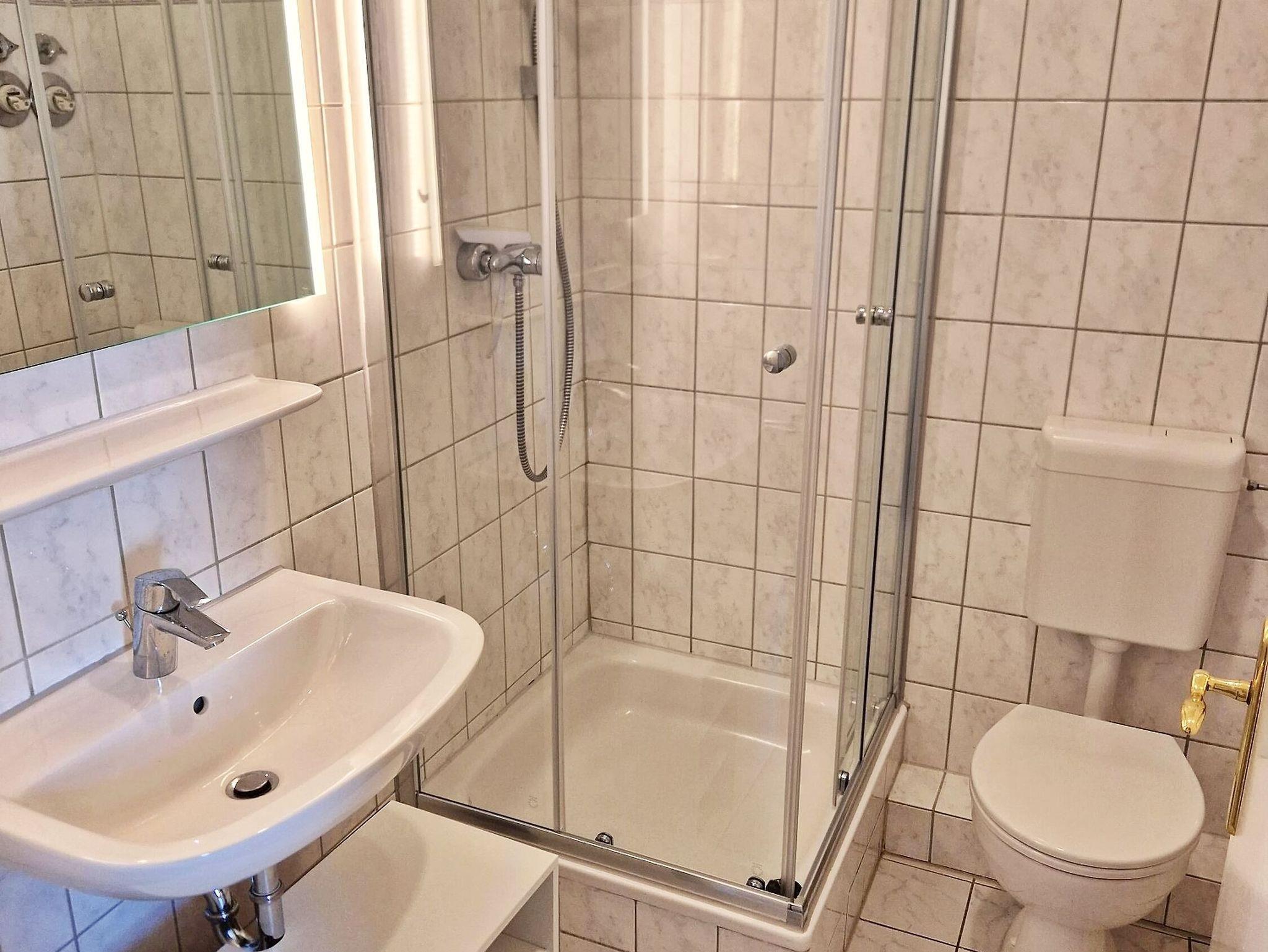 - Badezimmer mit Dusche/WC, Spiegel, Waschmaschine, Spiegel und Ablage, Wäscheständer