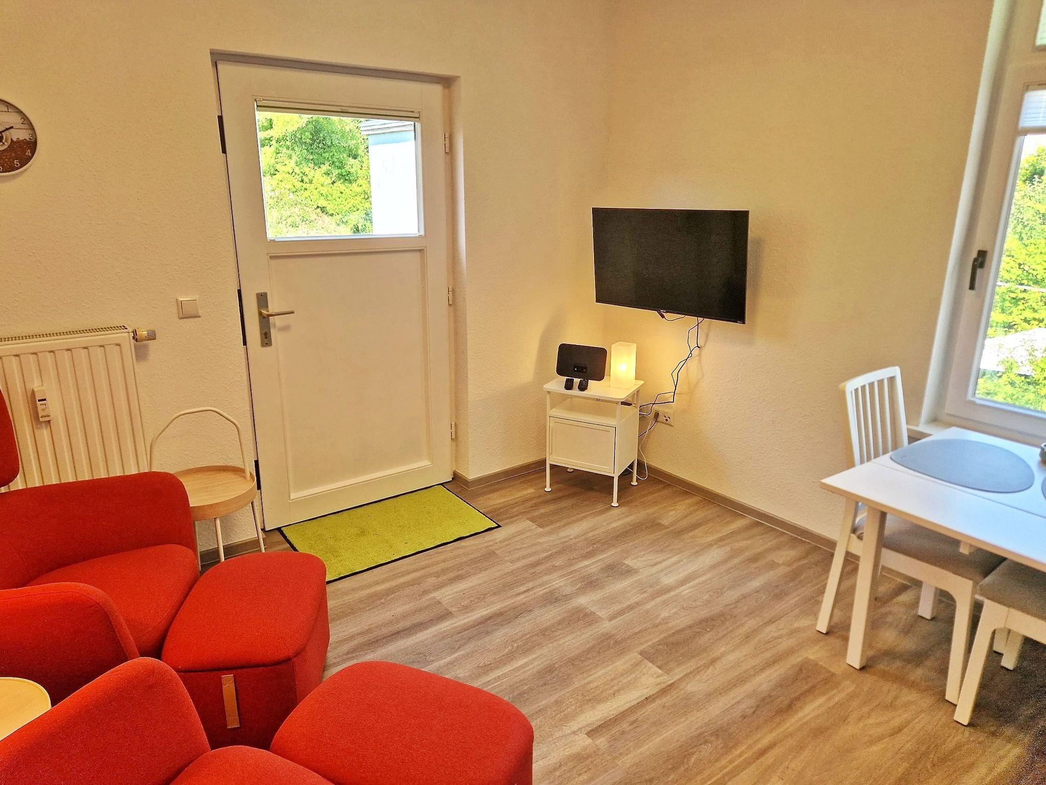 - Wohnzimmer mit offener Küche, 2 Sessel, Flat-TV, Essbereich für 2 Personen