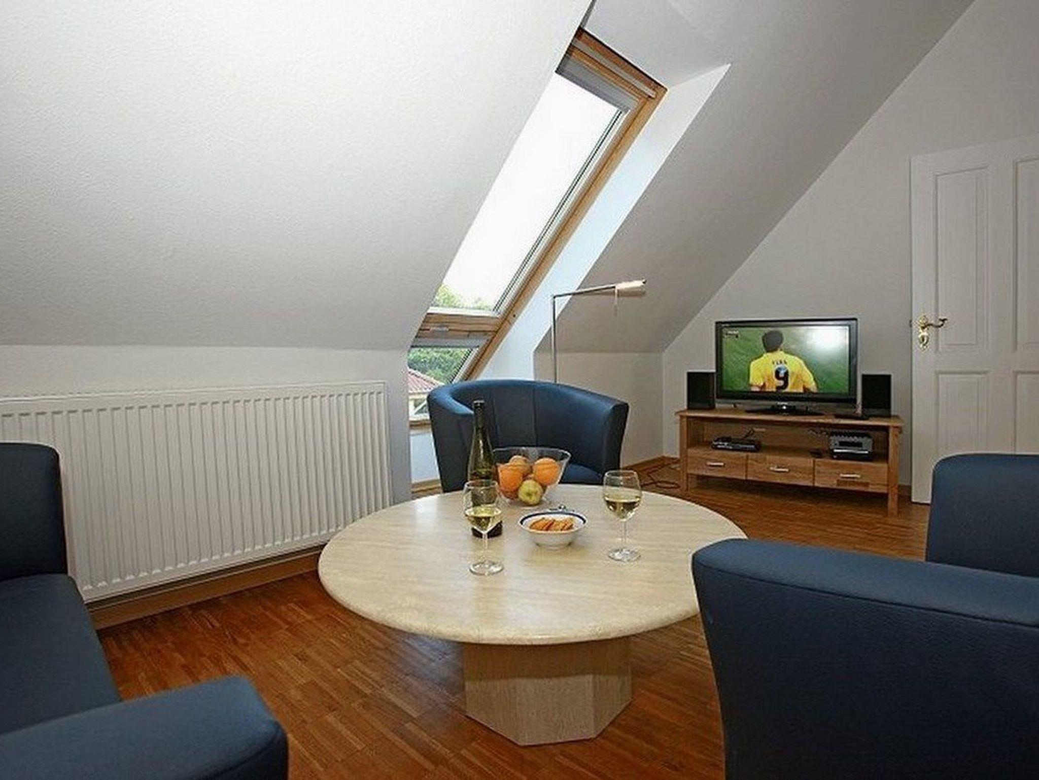 Wohnzimmer mit Sitzecke, separater Schlafcouch und separater Kinder-spielecke. Weiterhin mit Fernseher (Smart-TV), Radio/CD-Player (mit MP3-Anschluss) und Kabelanschluss.