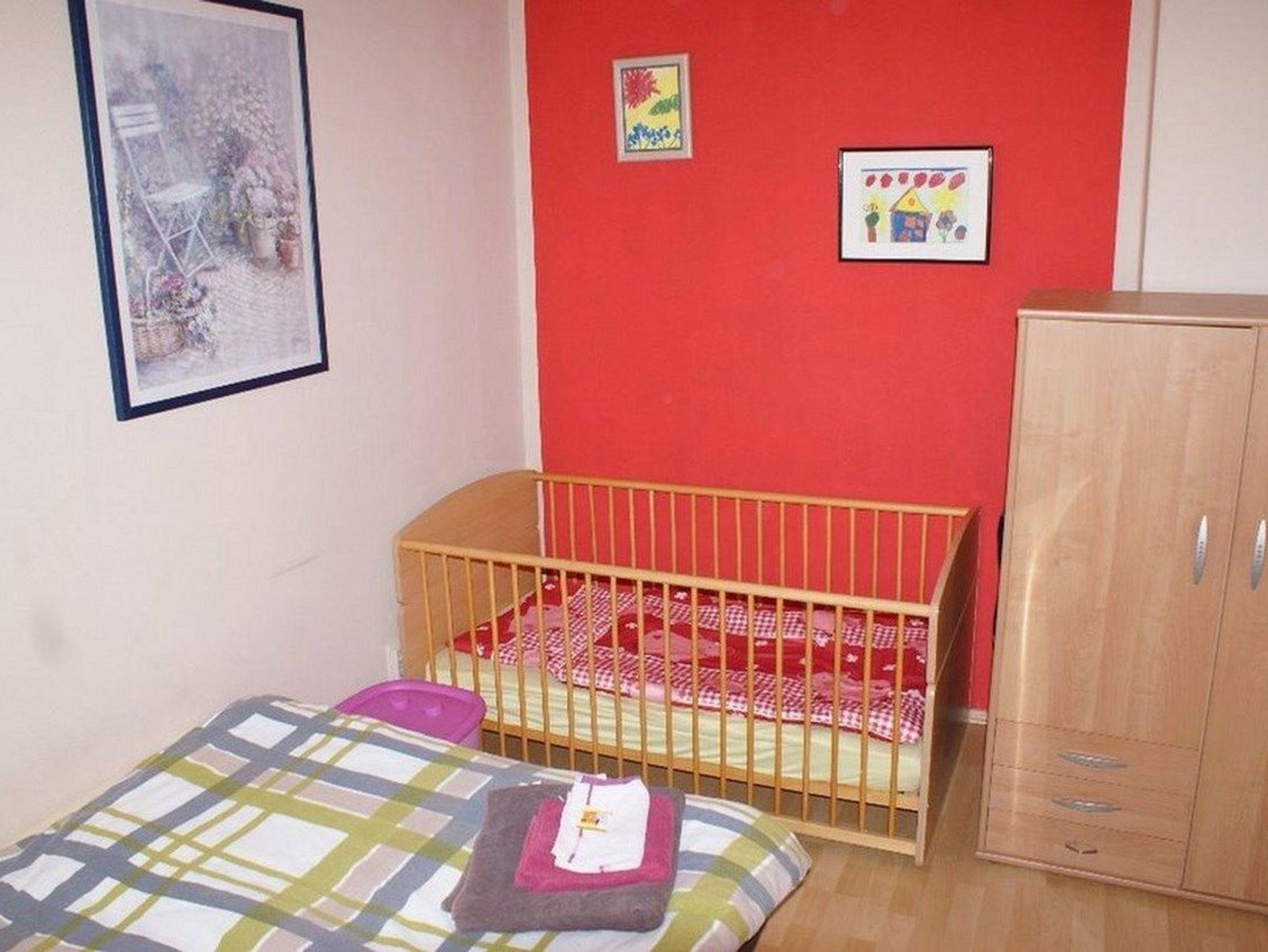 1. Schlafraum mit Kleiderschrank, Doppelbett (1,60 x 2,00 m), durch diesen Schlafraum gelangt man in den 2. kleineren Schlafraum mit Doppelbettcouch 1,40 x 2m, 1 Holz-Gitter-Kinderbett und Wickeltisch.