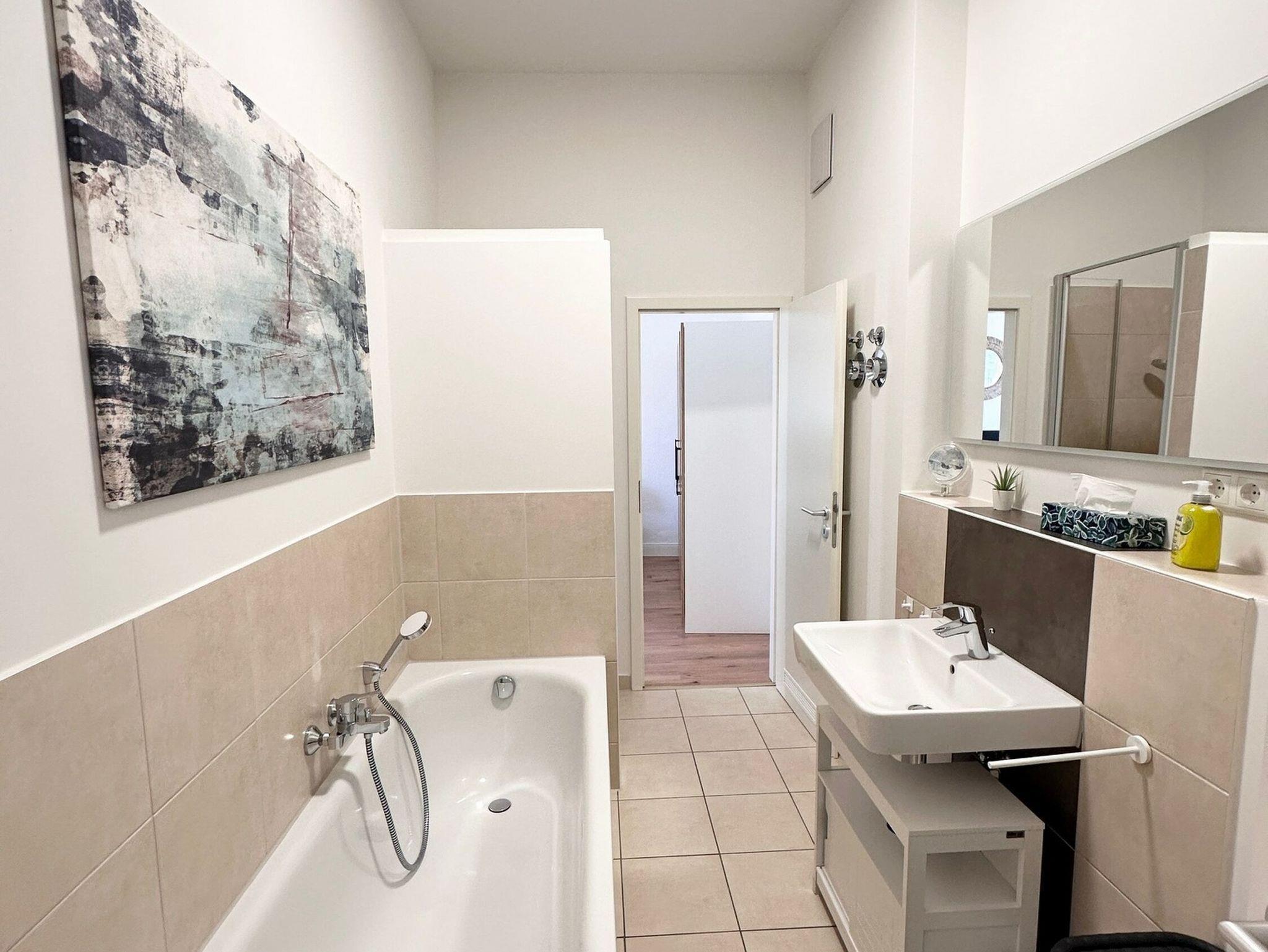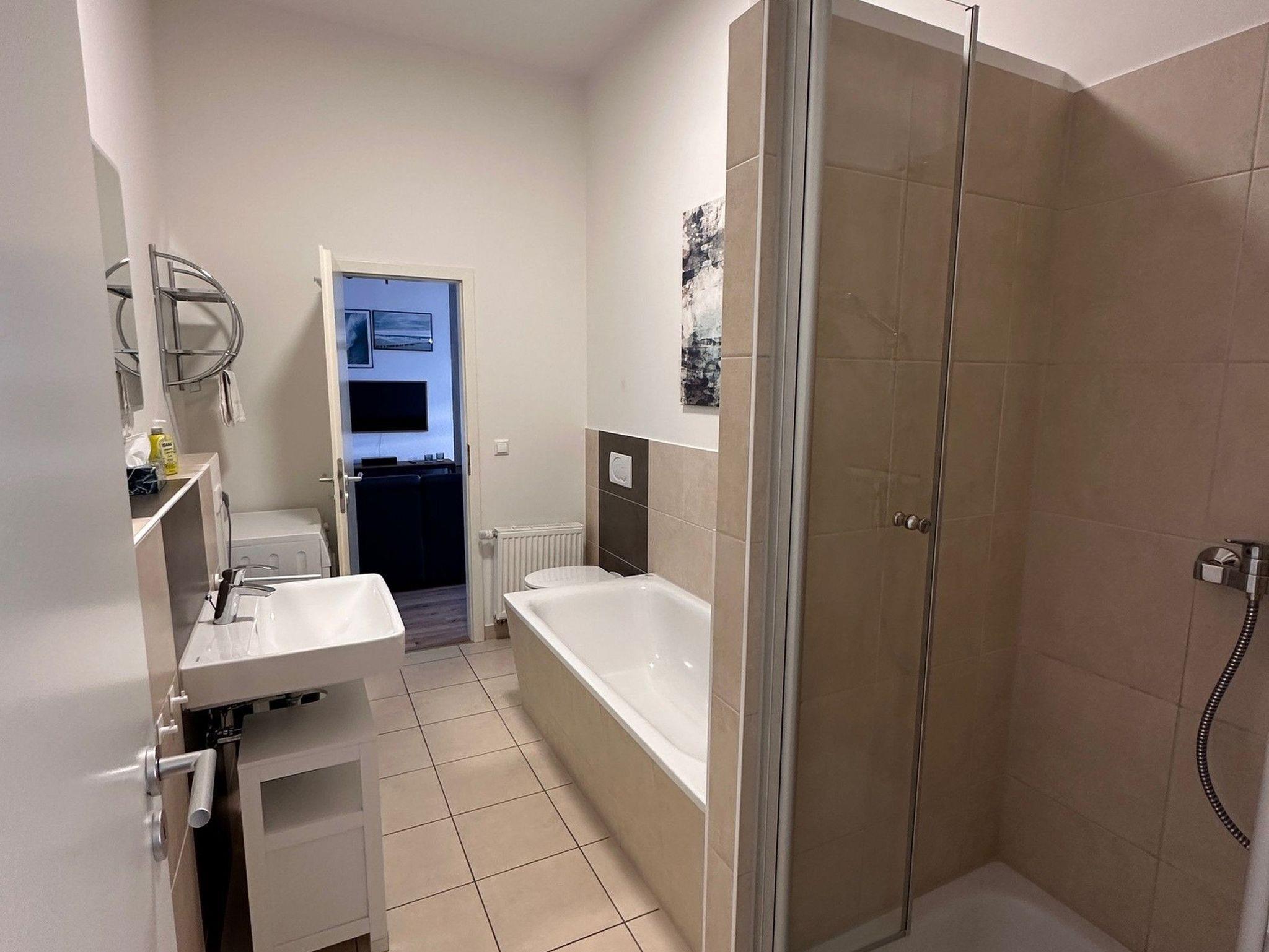 • Schickes Badezimmer mit Badewanne und zusätzlicher Dusche, WC, Spiegel und ausreichend Ablagefläche für Ihre Beautyutensilien. Das Badezimmer kann sowohl vom Wohnzimmer, als auch vom Schlafzimmer erreicht werden.