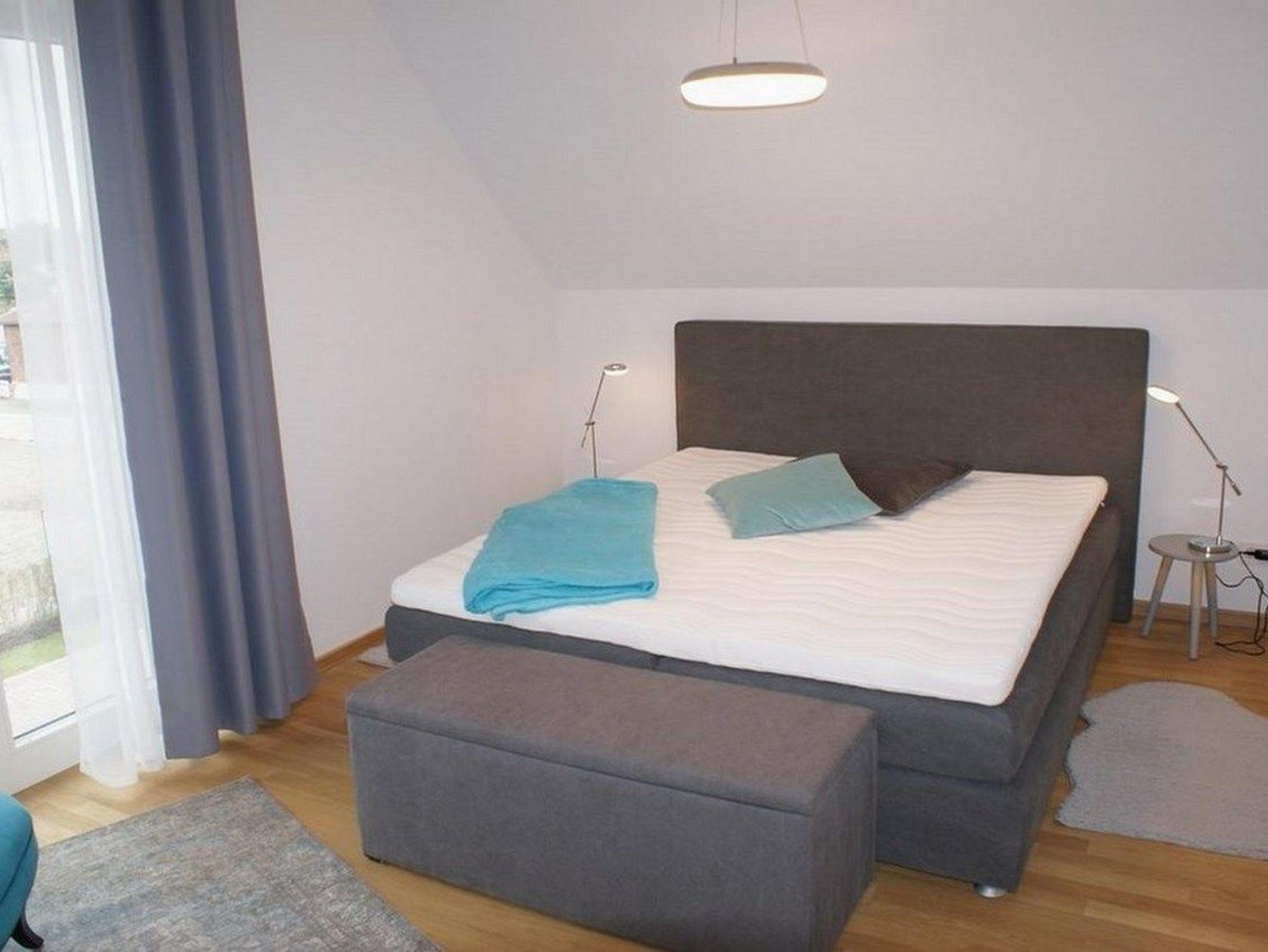 - Schlafzimmer mit gemütlichen Boxspring-Doppelbett (1,80 x 2,00 Meter), großer Kleiderschrank und Sessel