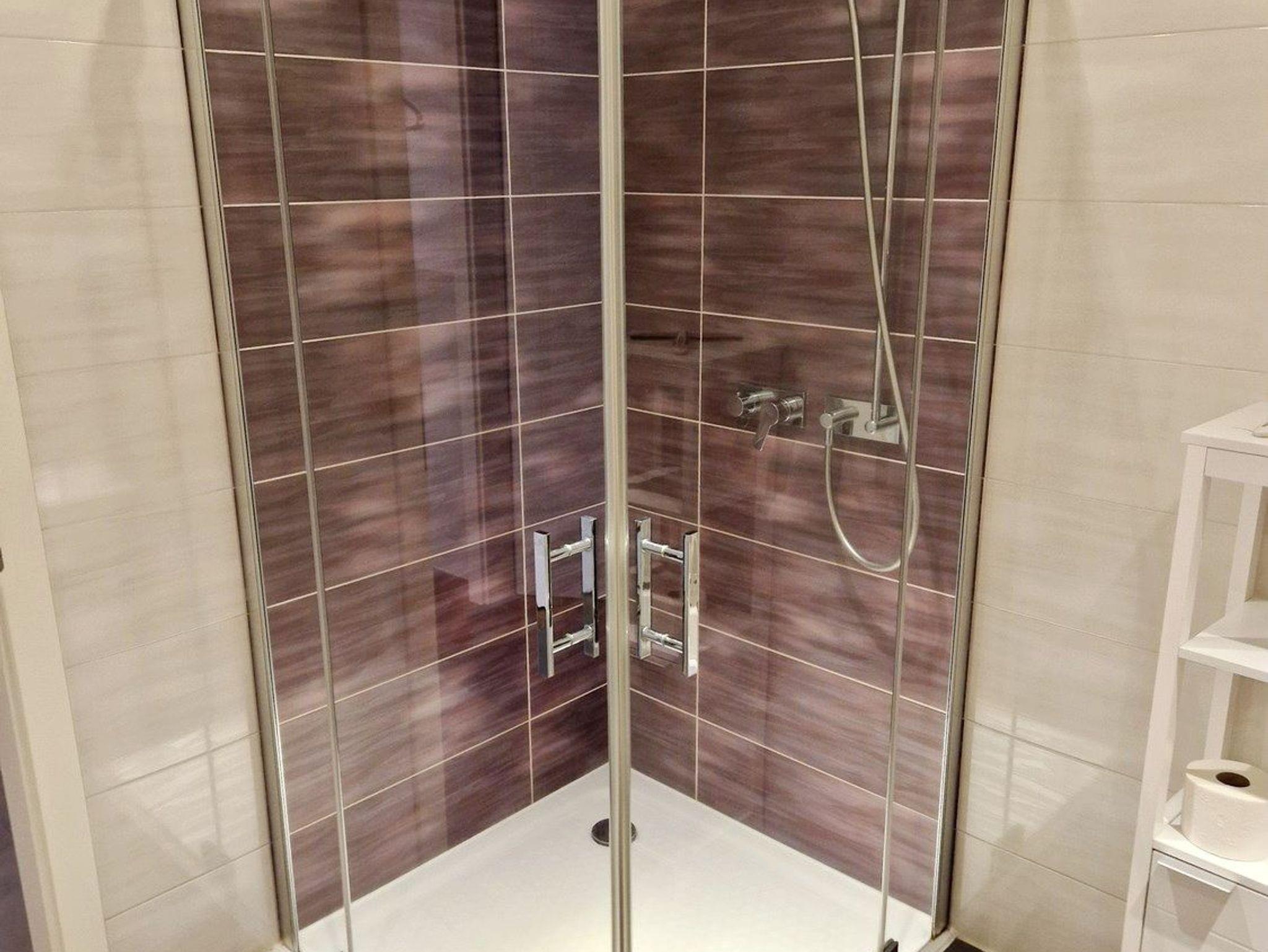 - Das Bad mit Abluftsystem verfügt über einen nahezu ebenerdigen Duschbereich 100x100 und thermostatgeregelter Duschbrause sowie Tropendusche, Handtuchtrockner und großem Spiegel