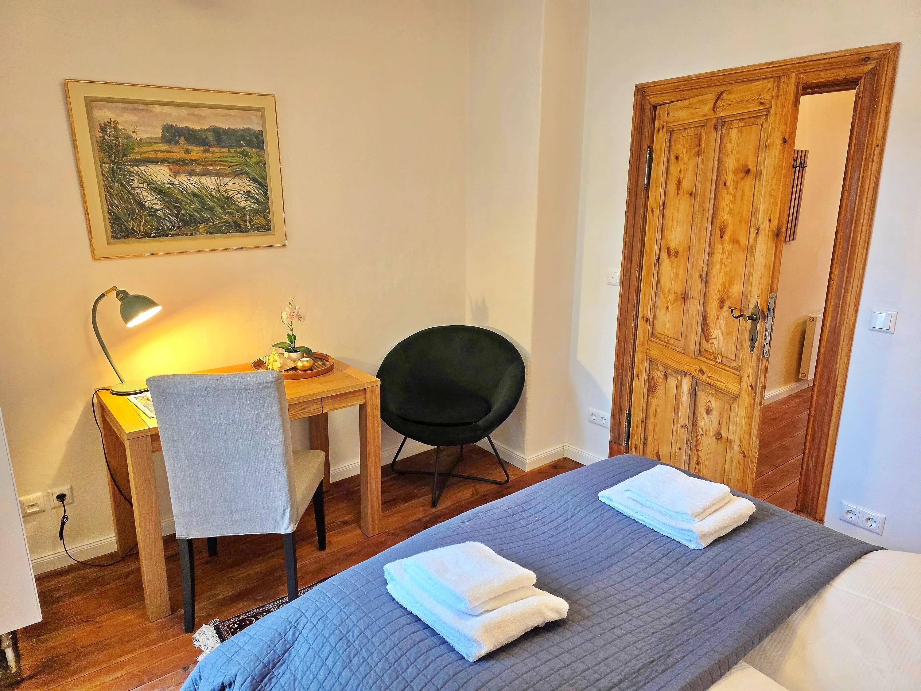 Das gemütliche Schlafzimmer ist mit einem komfortablen Doppelbett ausgestattet – flankiert von zwei Nachttischen mit Beleuchtung. Ein Sessel lädt zum Lesen oder Entspannen ein, und ein Schreibtisch bietet die Möglichkeit zum Schreiben, Arbeiten oder Planen Ihrer Ausflüge. Große Fenster sorgen für angenehmes Tageslicht, ohne an Privatsphäre einzubüßen.
