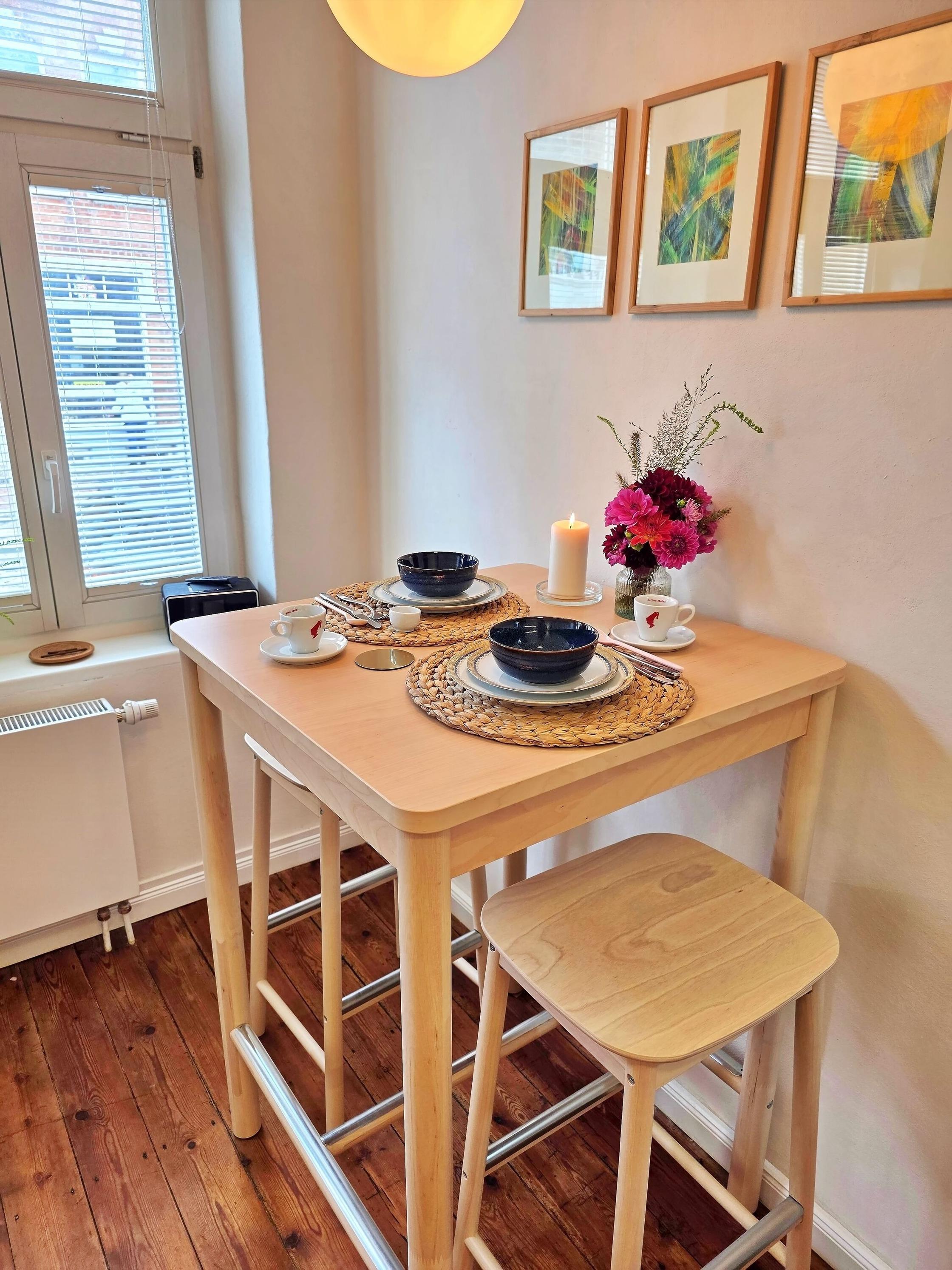 - Die offene Küche ist vollständig ausgestattet: Backofen, Kühlschrank, Wasserkocher, Kaffeemaschine, Toaster, Geschirr, Besteck und Küchenutensilien – alles da, um sich rundum selbst zu versorgen.