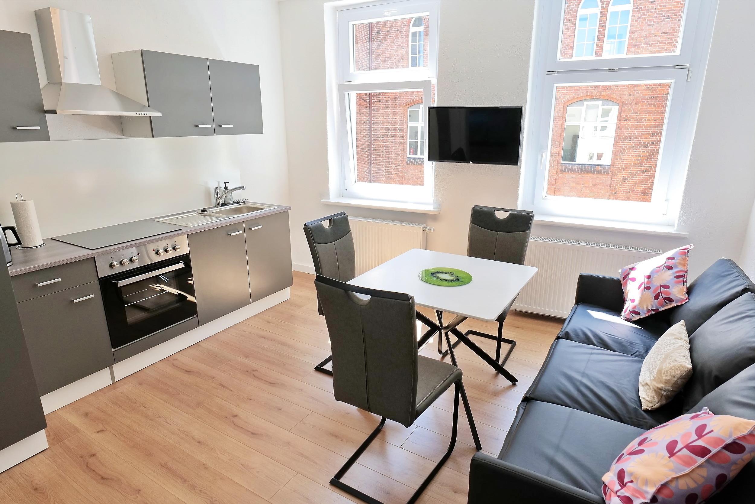 - 1 Wohnzimmer mit offener Küche, Couch, Flat-TV (Fernsehen über Intenet)