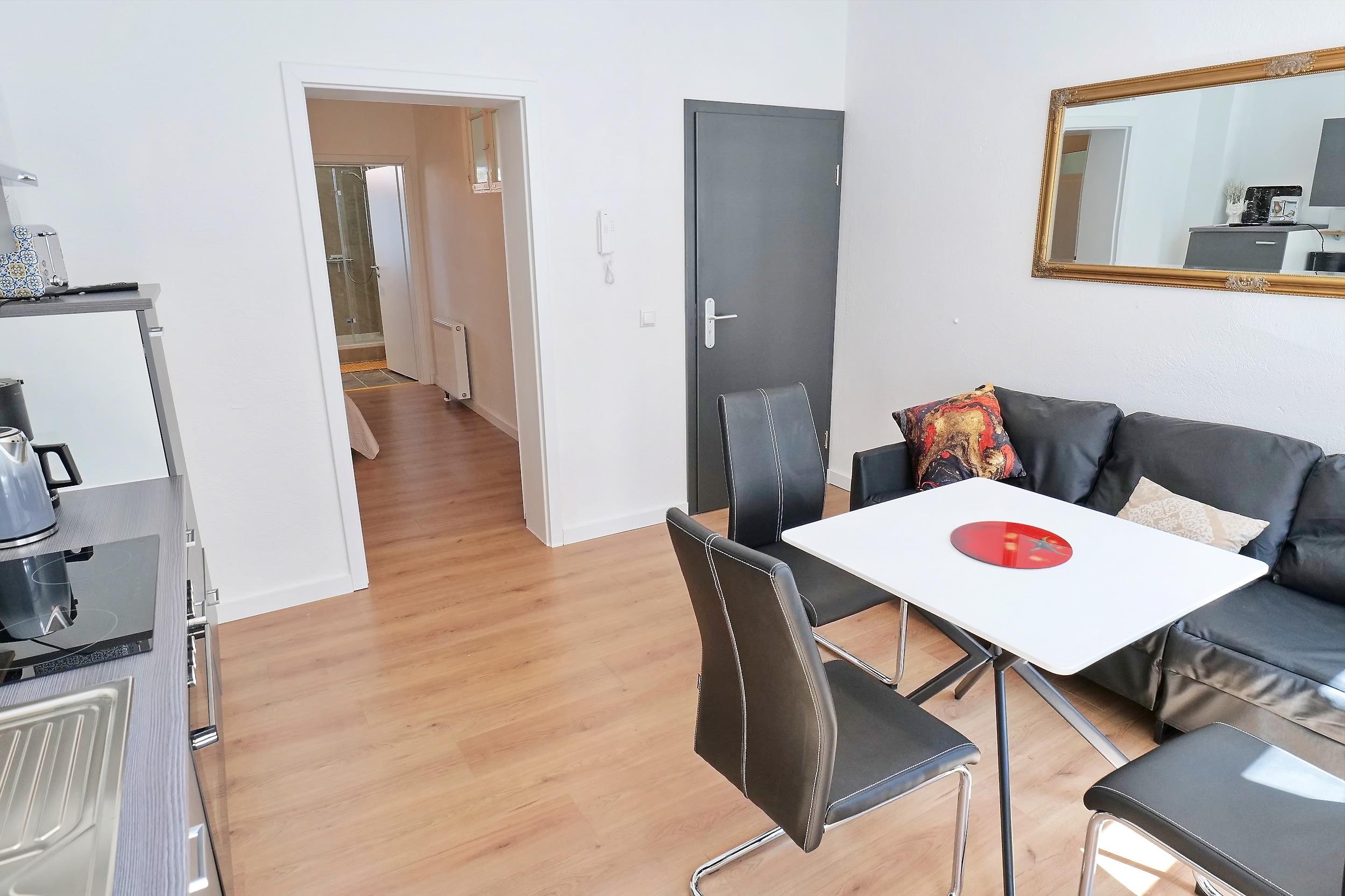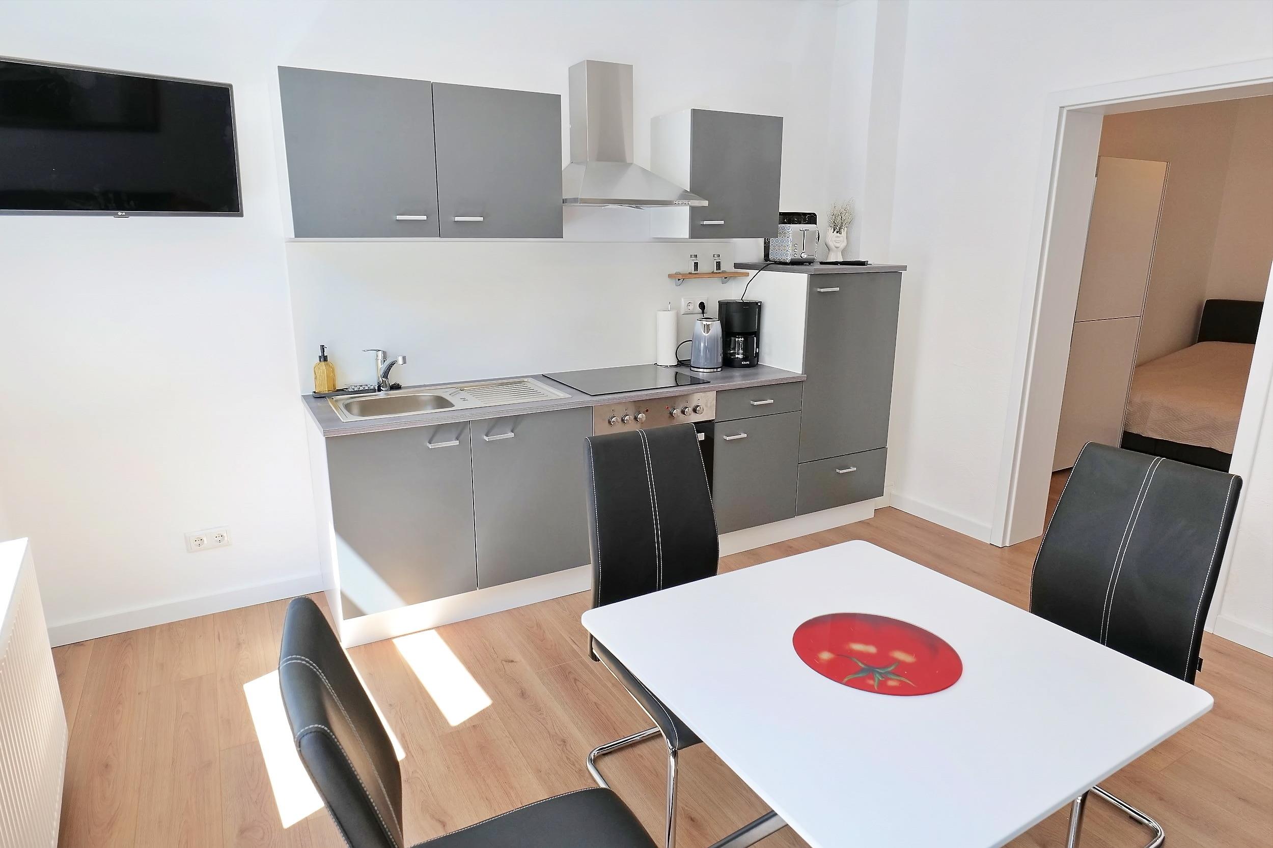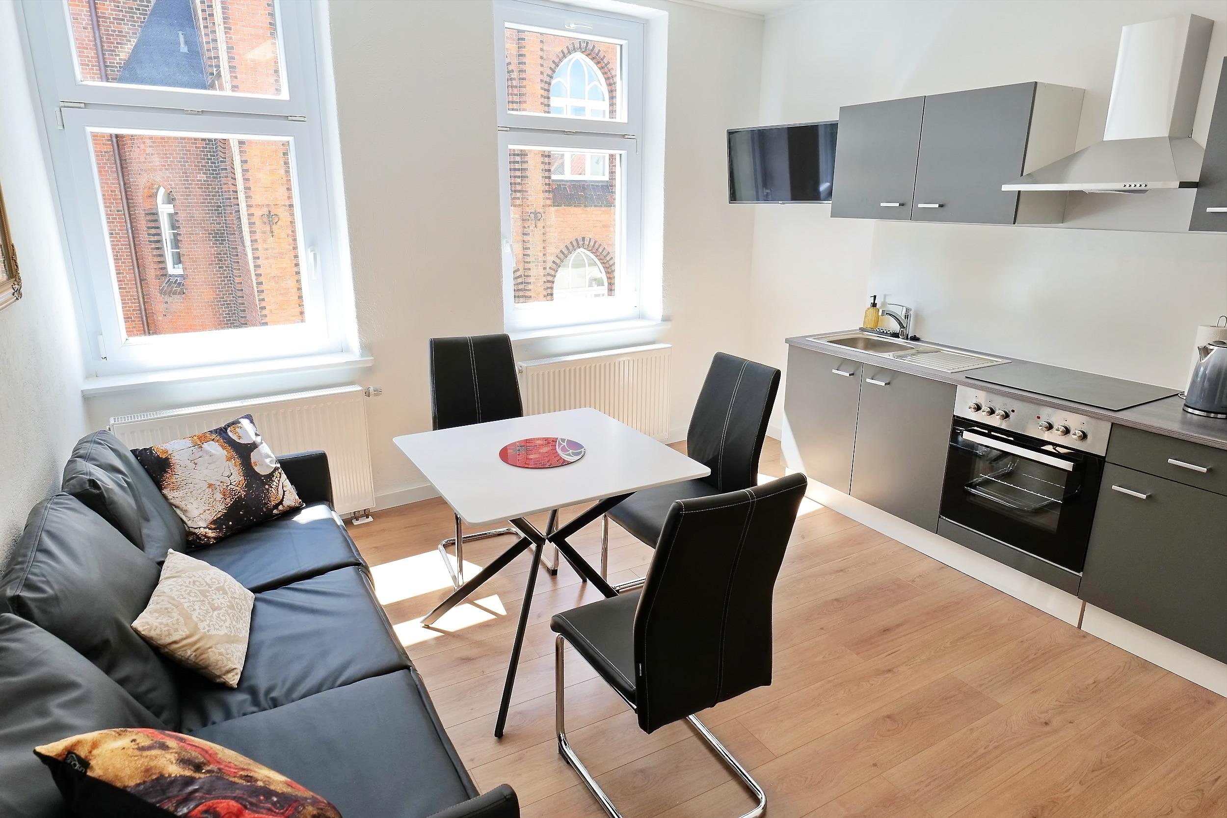 - 1 Wohnzimmer mit offener Küche, Couch, Flat-TV (Fernsehen über Intenet)