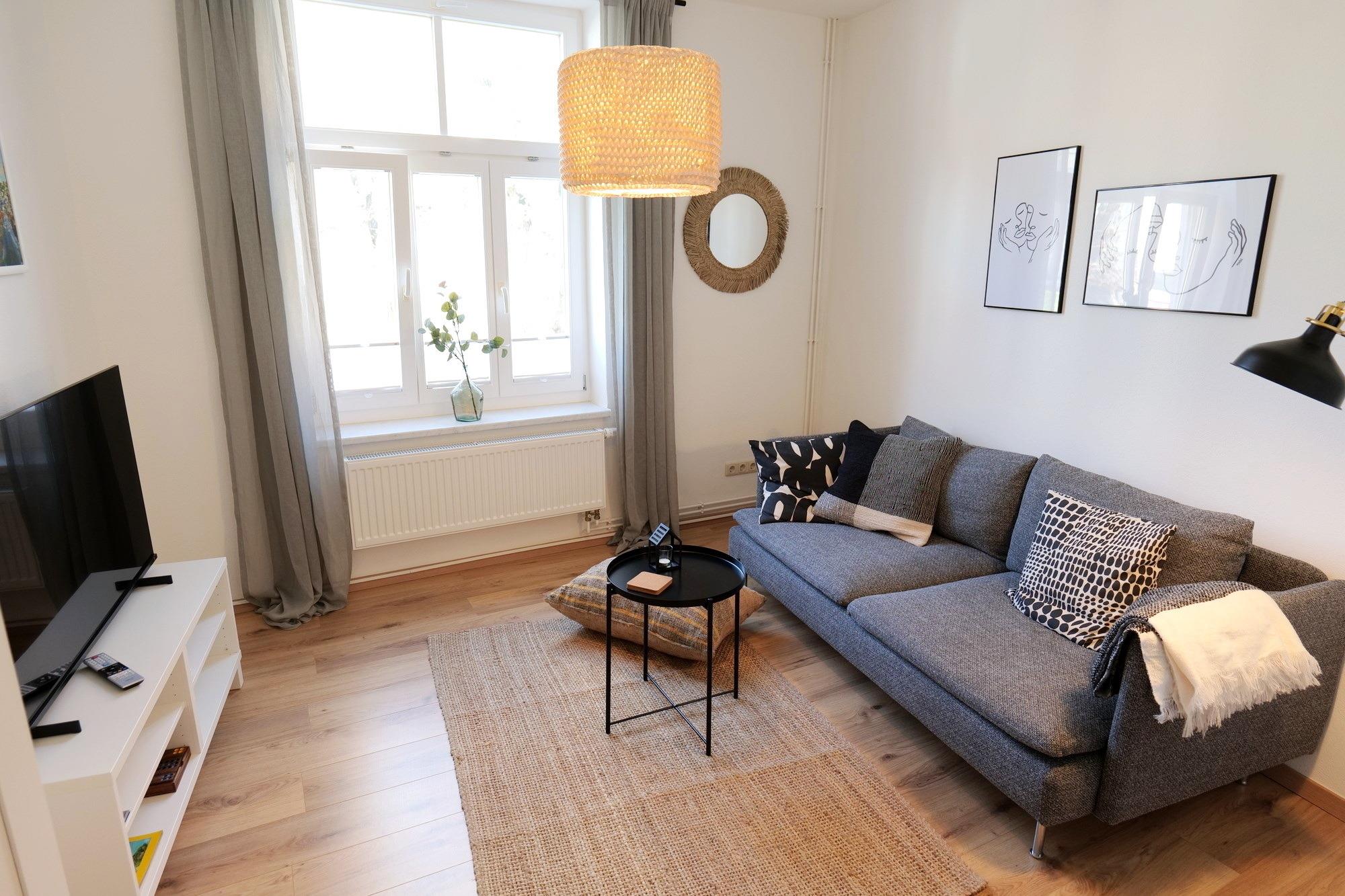 - 1 Wohnzimmer mit Couch, Flat-TV, Radio