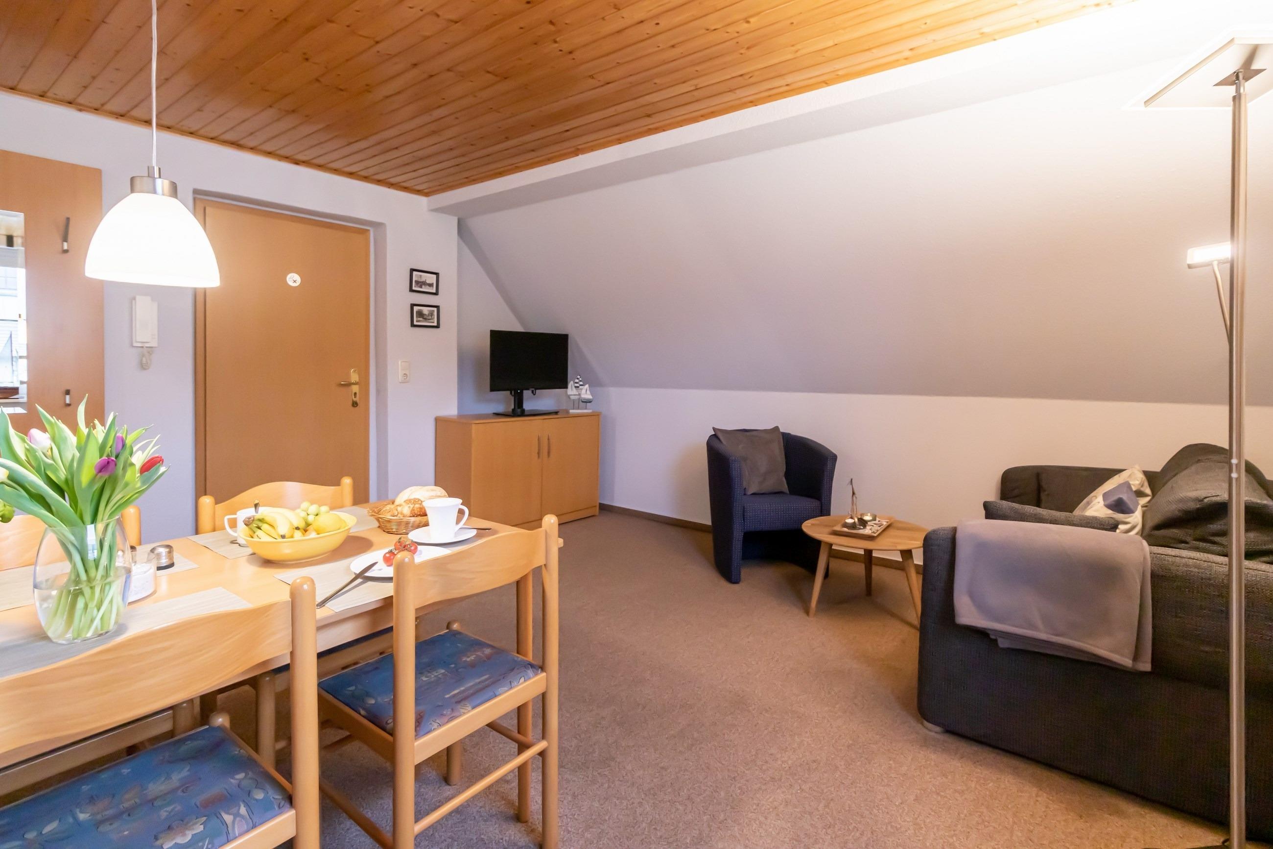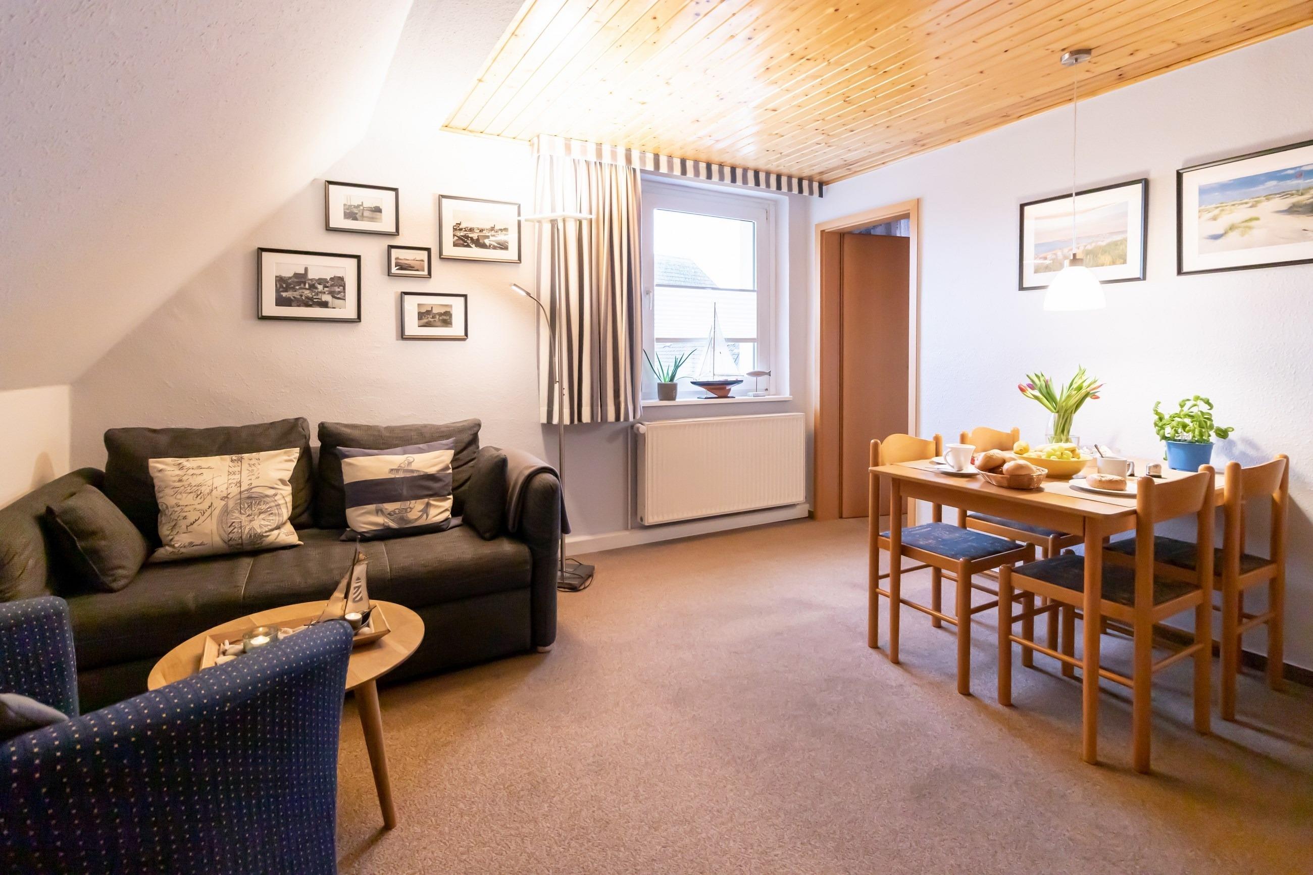 Wohnzimmer mit Schlafcouch, gemütliche Sitzecke, Essplatz, Flachbild-TV, Sat-TV