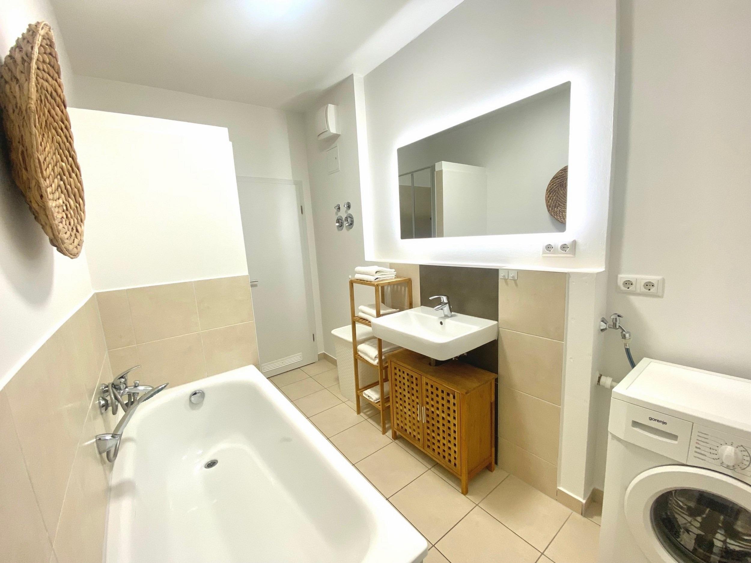 - Vollbad mit Badewanne, Dusche, WC, Waschmaschine, Spiegel und Ablage (begehbar vom Schlafzimmer und Wohnzimmer), Wäscheständer