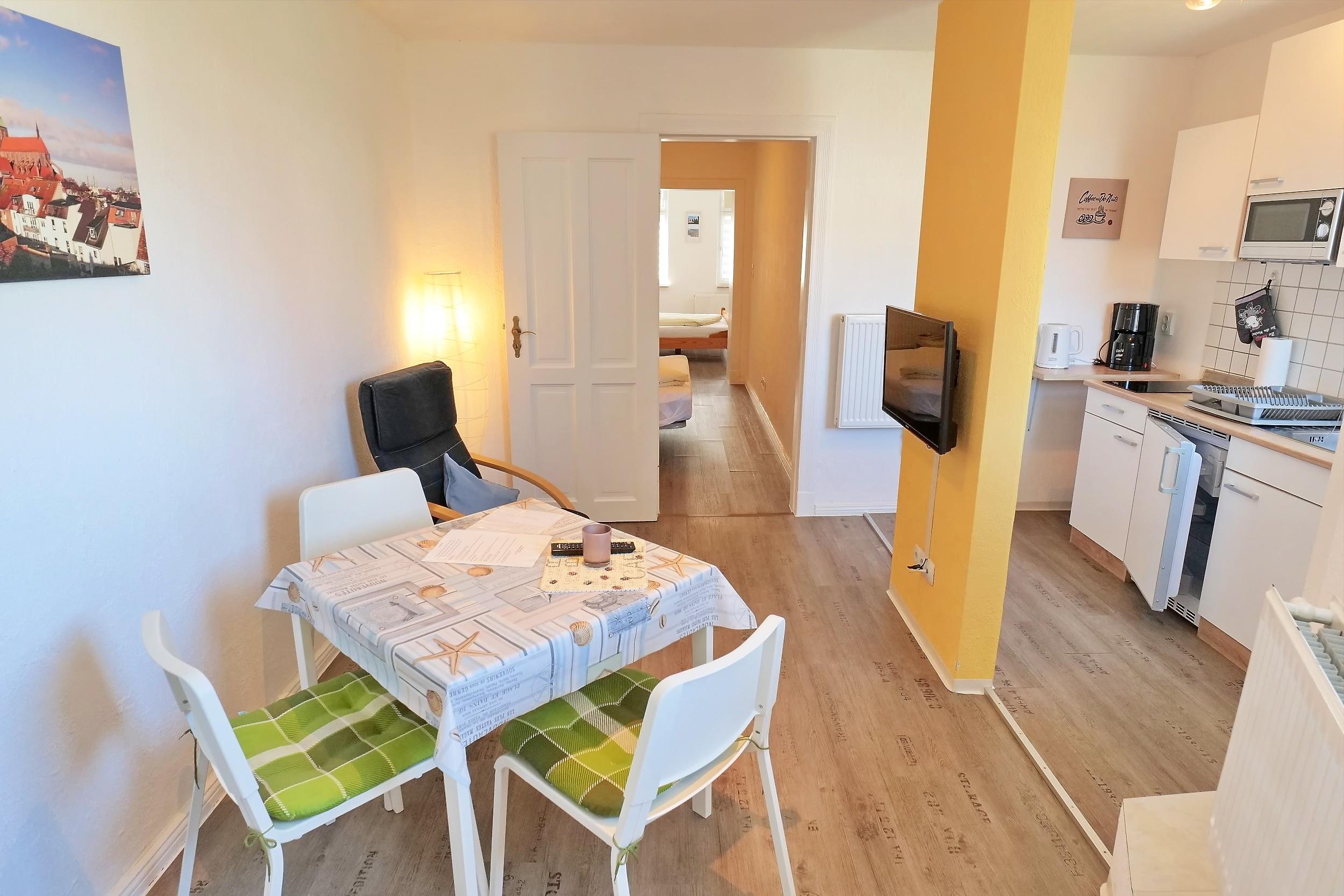 Das Apartment bietet eine herrliche Aussicht über die Dächer von Wismar und auf die Nikolaikirche. Zu den weiteren Annehmlichkeiten gehören ein Flachbild-Sat-TV, ein Sitzbereich sowie ein eigenes Bad mit einer Dusche und einem Haartrockner. Die voll ausgestattete Küchenzeile umfasst eine Kaffeemaschine, einen Kühlschrank, einen Toaster, ein Kochfeld und Küchenutensilien.