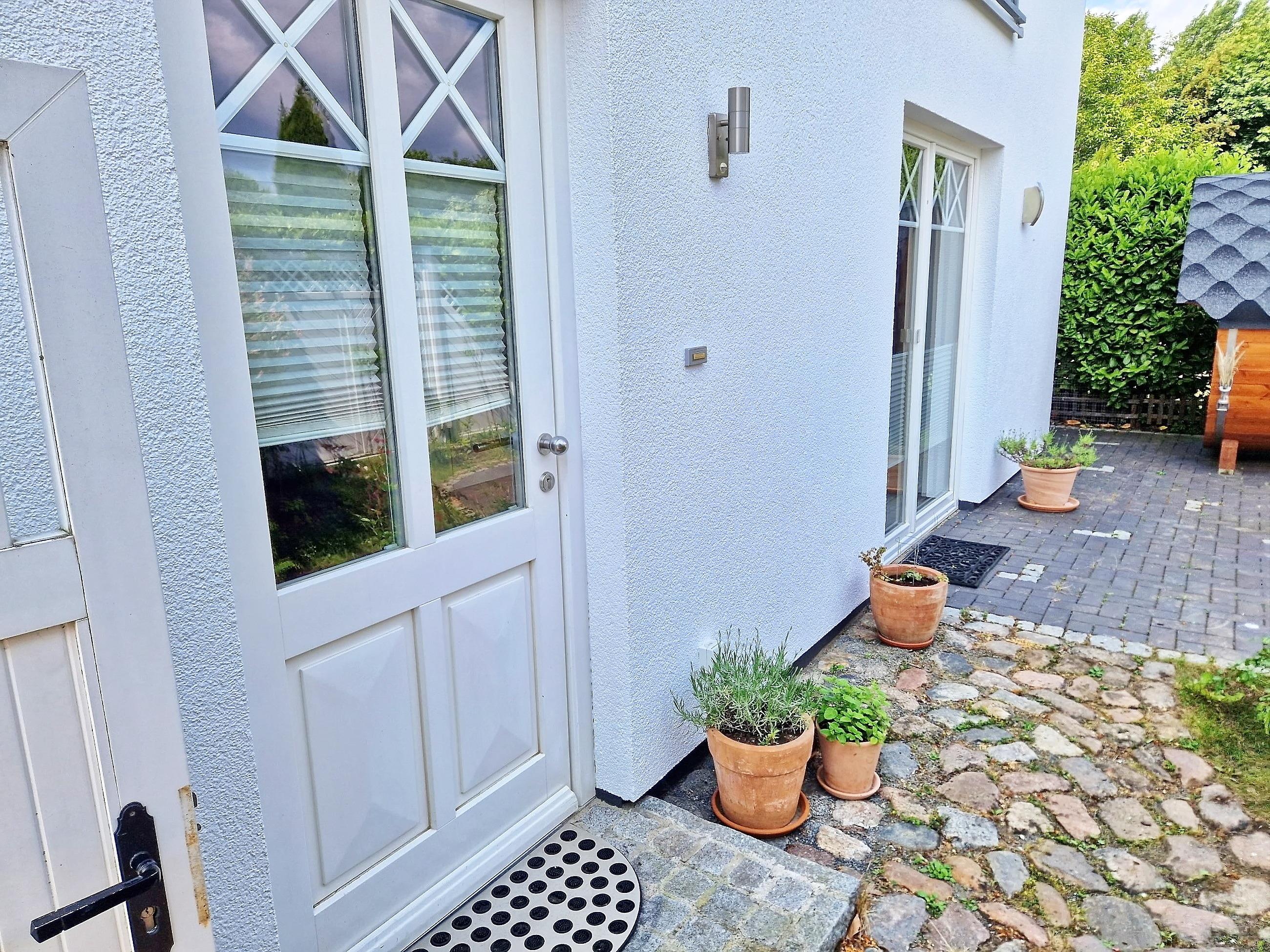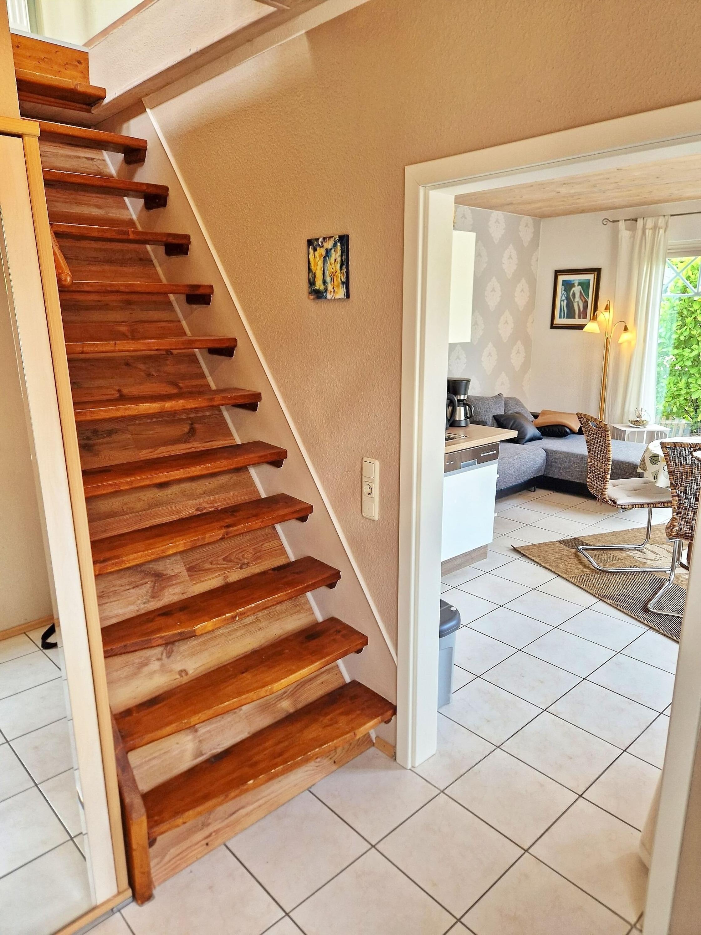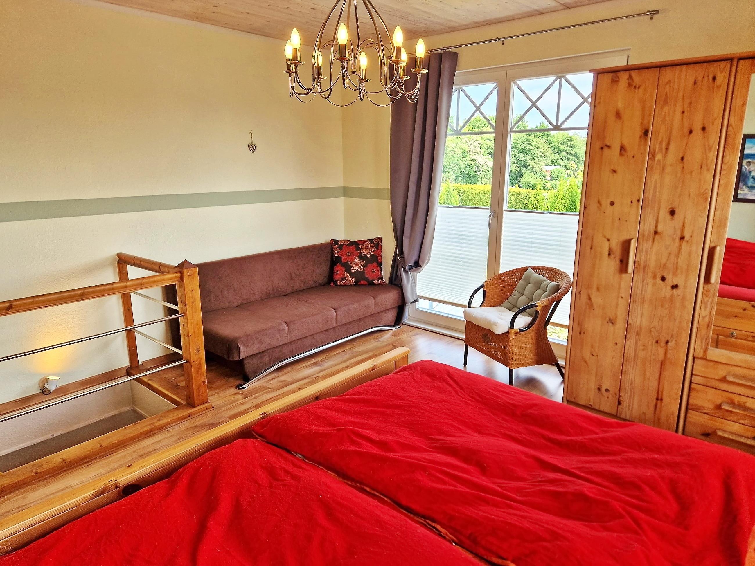 Exklusive Ferienwohnung mit separatem Eingang im neuwertigen Holzhaus; Eingangsflur mit Garderobe, ein kombinierter Ess-/Wohnraum mit Küchenzeile, Esstisch, Couch, TV; modernes Bad mit Dusche, das stilvolle Schlafzimmer mit Doppelbett im Obergeschoss ist über eine Treppe (steil) räumlich getrennt, eigene Terrasse mit Gartenmöbel, Parkplatz. Aufbettung im Wohnraum (Couch) und Reisebett auf Anfrage möglich. Die Räume verfügen über einen Sichtschutz (Plissee), sind aber nicht vollständig zu verdunkeln.