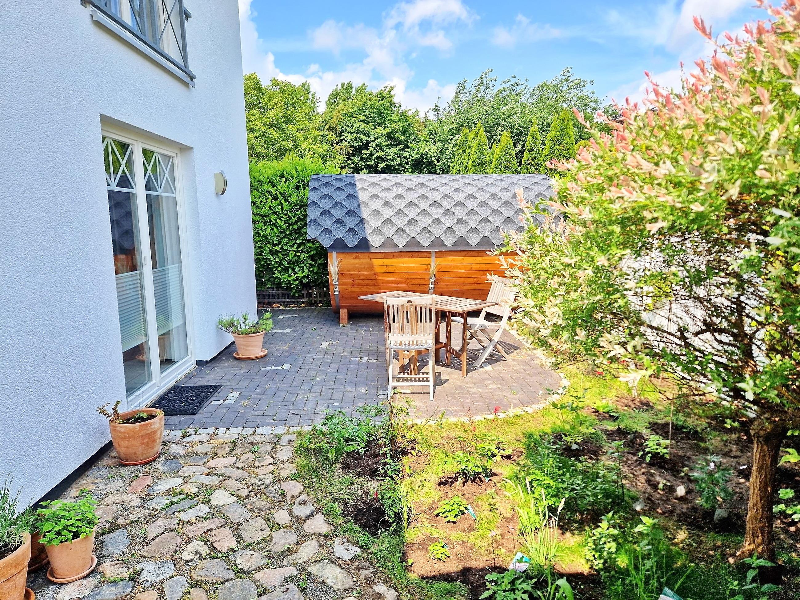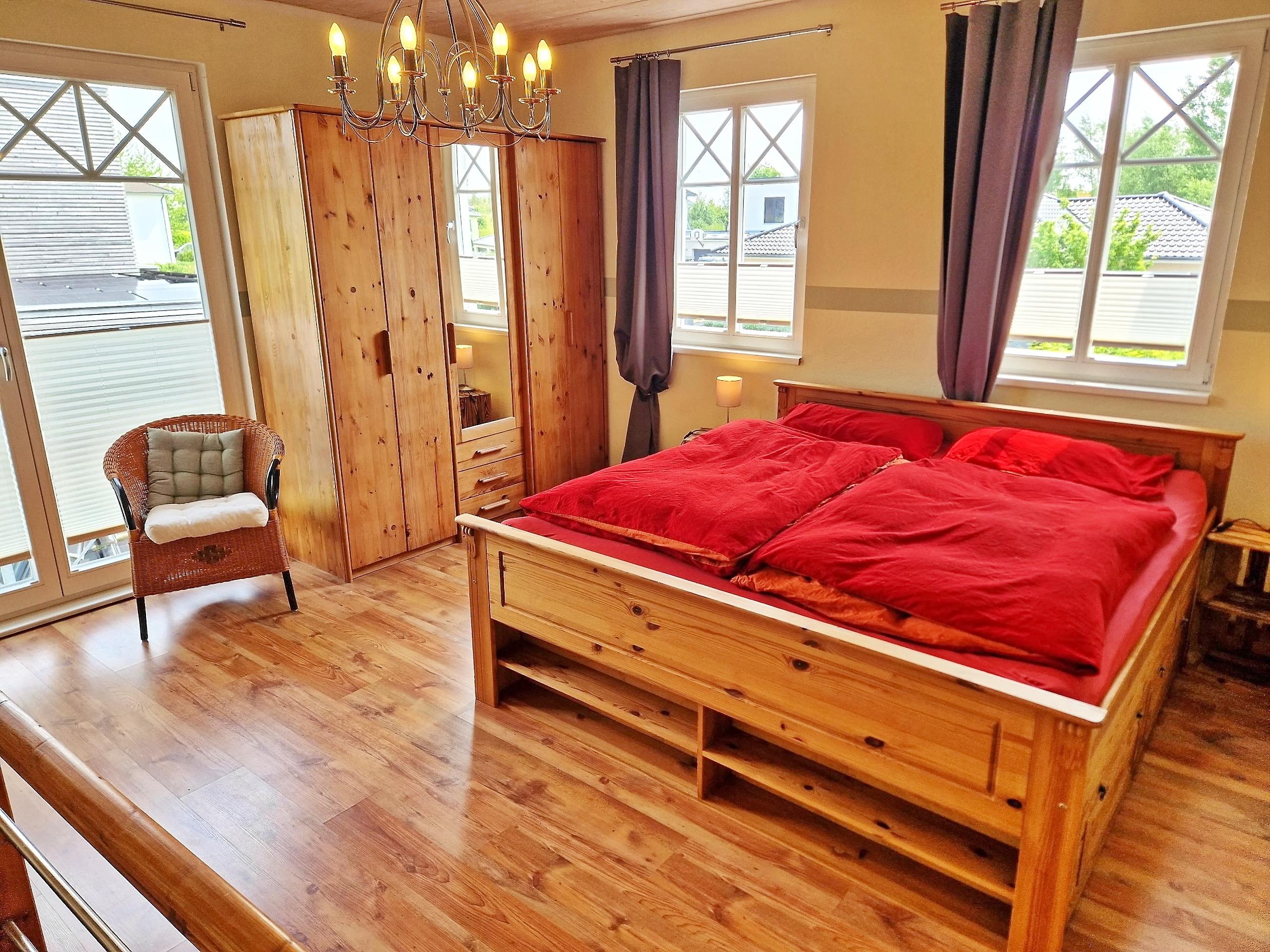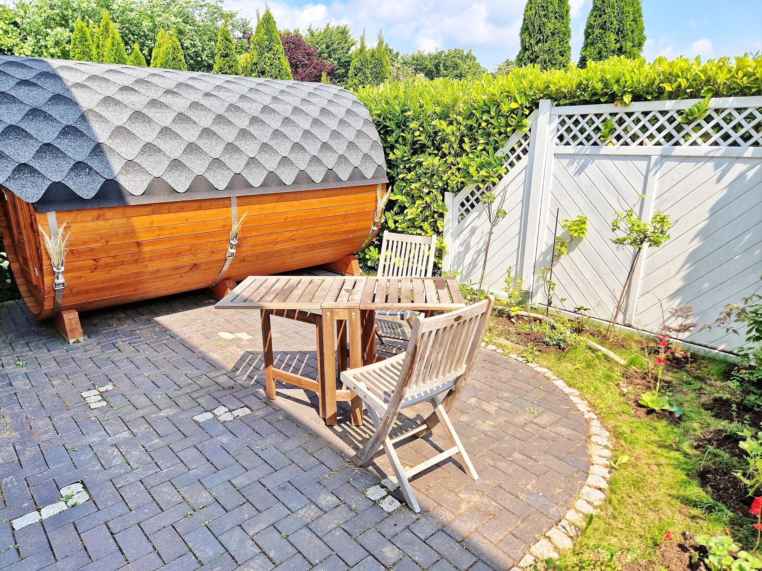 Exklusive Ferienwohnung mit separatem Eingang im neuwertigen Holzhaus; Eingangsflur mit Garderobe, ein kombinierter Ess-/Wohnraum mit Küchenzeile, Esstisch, Couch, TV; modernes Bad mit Dusche, das stilvolle Schlafzimmer mit Doppelbett im Obergeschoss ist über eine Treppe (steil) räumlich getrennt, eigene Terrasse mit Gartenmöbel, Parkplatz. Aufbettung im Wohnraum (Couch) und Reisebett auf Anfrage möglich. Die Räume verfügen über einen Sichtschutz (Plissee), sind aber nicht vollständig zu verdunkeln.